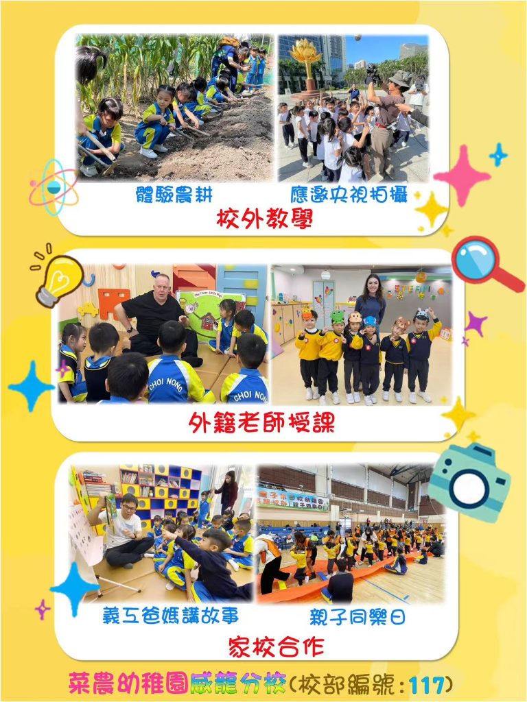 菜農子弟學校(117威龍分校)自幼兒階段起,全面推行沉浸式全英語教學環境。學校從K1至K3,將英語自然融入日常活動、主題學習與遊戲之中,讓孩子在生活中無縫接觸與使用英語。