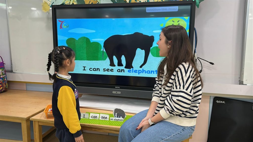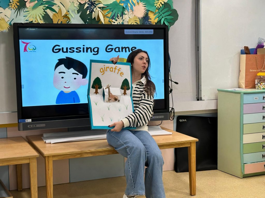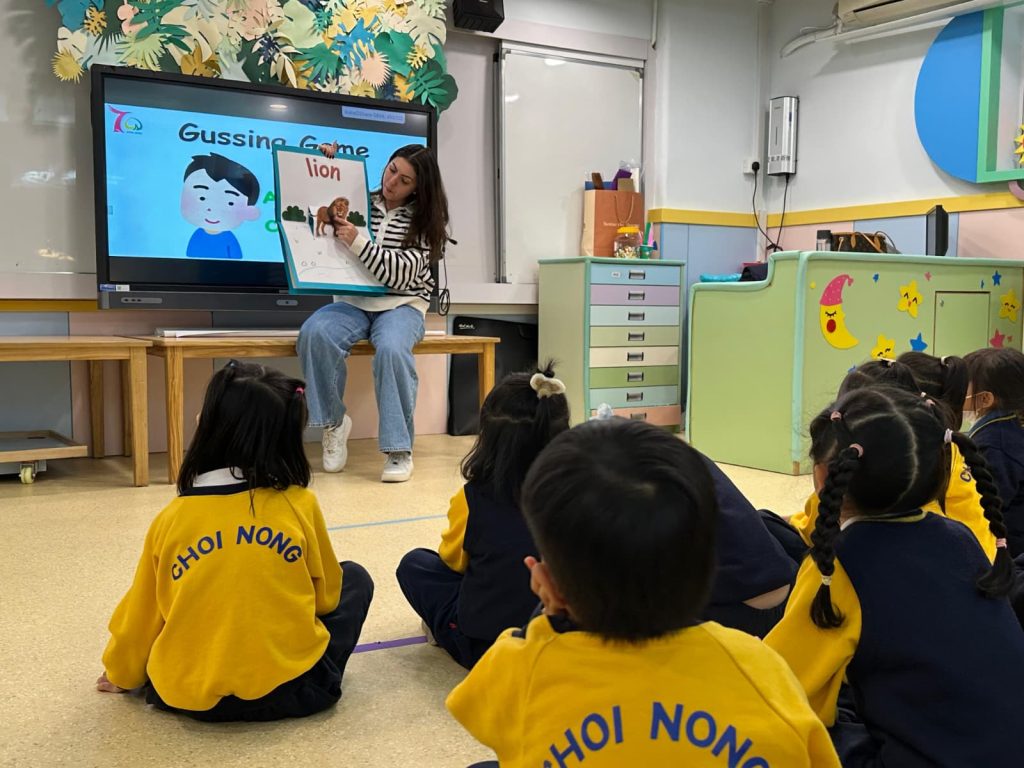 幼稚園(117威龍分校)老師與外籍老師攜手設計了一堂充滿趣味與互動的動物主題課程。課堂一開始,Miss Vanessa帶領小朋友學習幾種常見動物的英文名稱,如lion、elephant、zebra等,透過發音練習,引導小朋友建立基本詞彙。