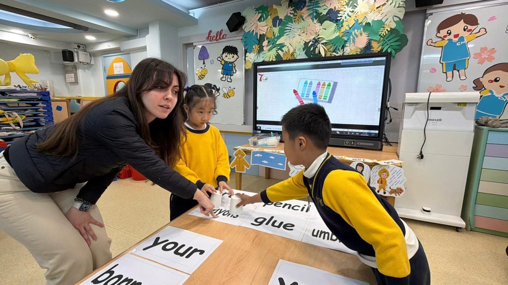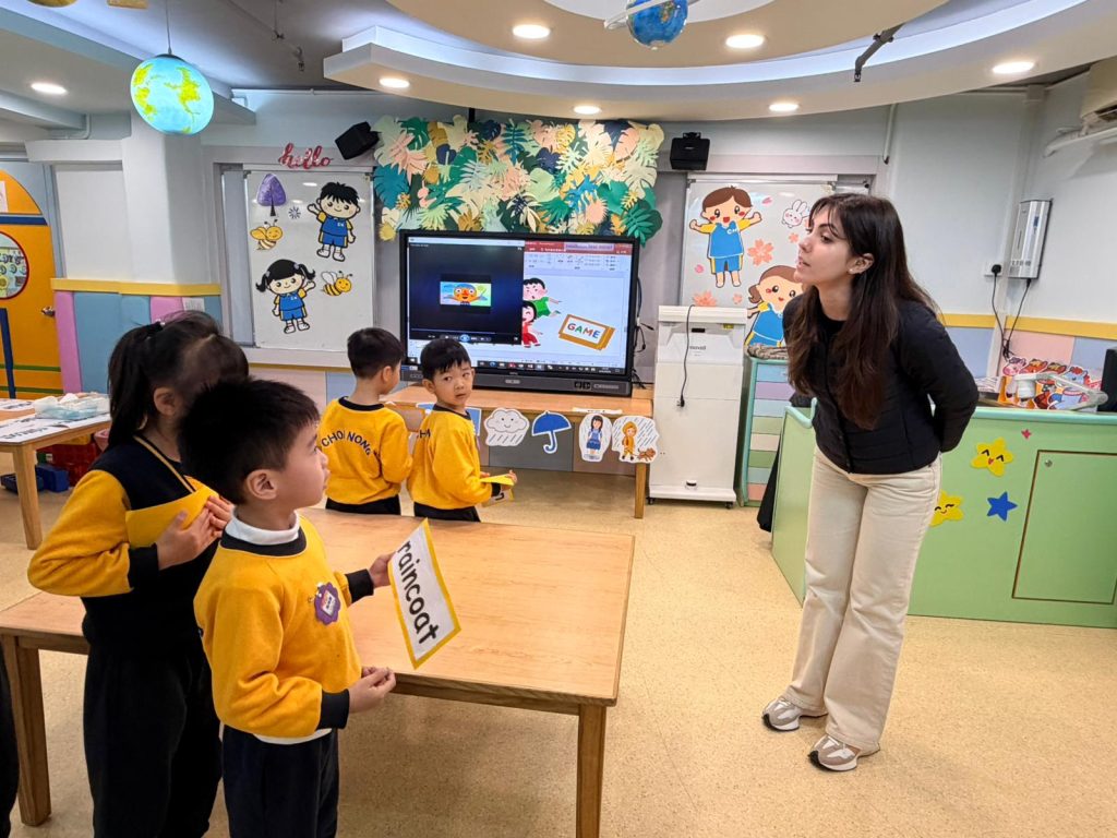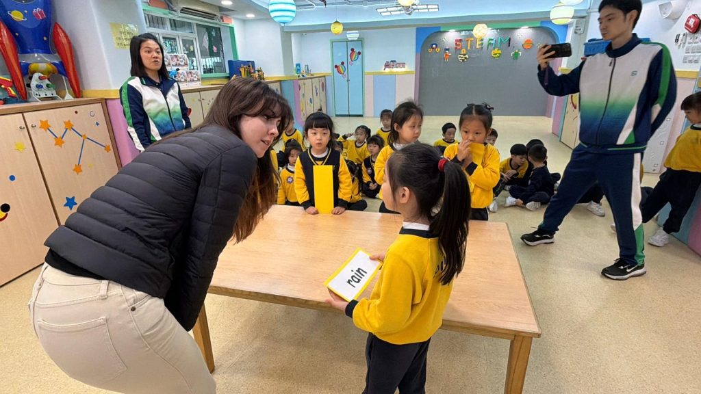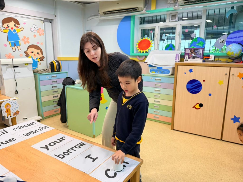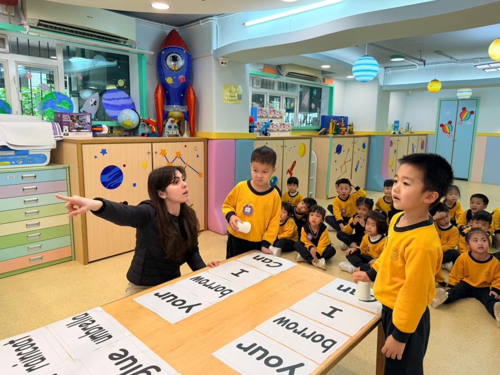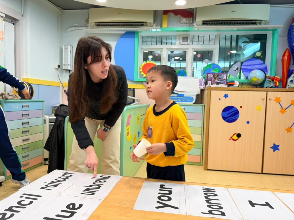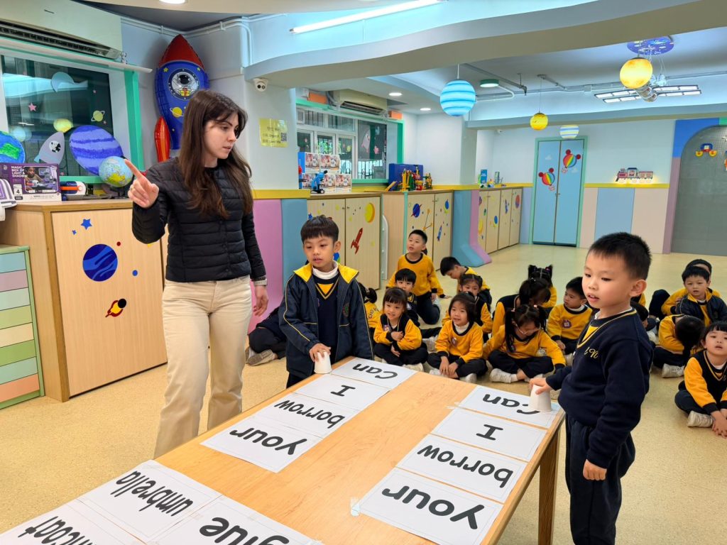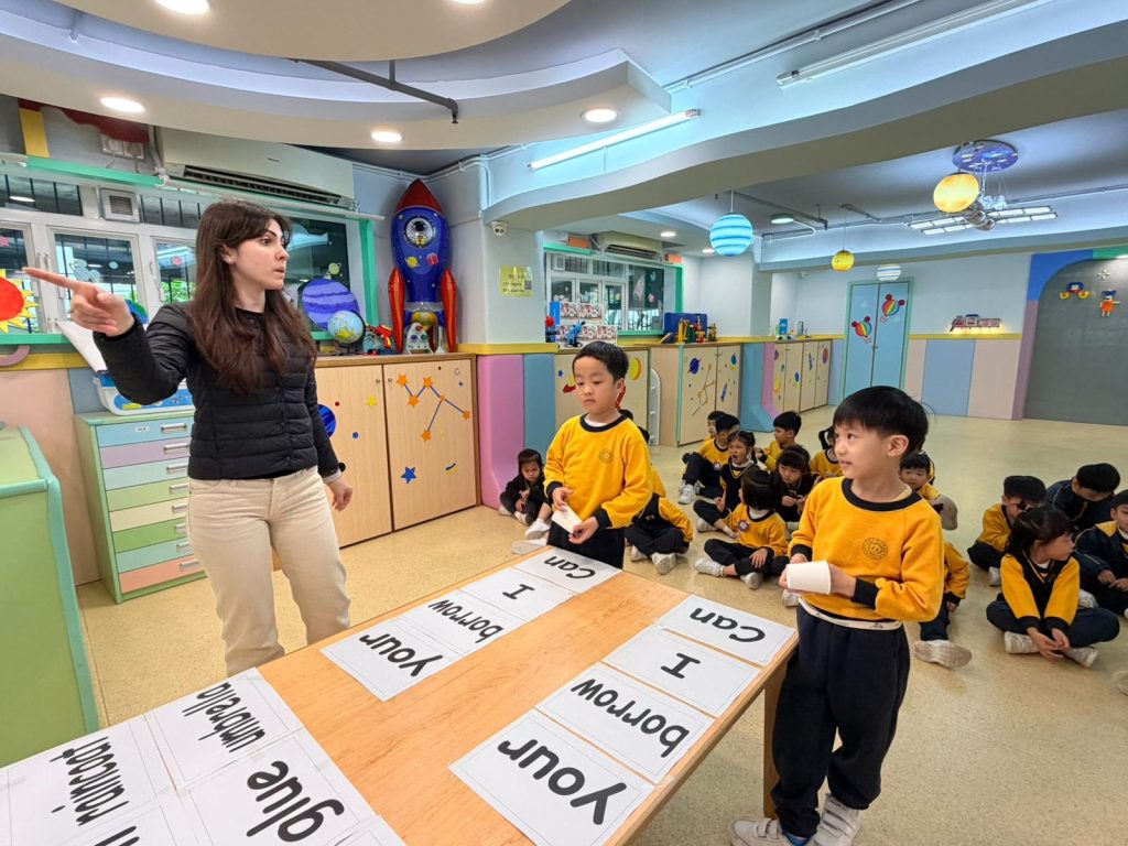 第二個遊戲則是句式練習。小朋友先觀察圖片,再用紙杯敲打桌面上的字詞,跟隨節奏說出「Can I borrow your…」的句型,並配合正確的詞語完成完整句子。透過節奏感的加入,小朋友在遊戲中不僅練習了句式結構,也提升了語言的流暢度與趣味性。 這堂課以音樂、動作和節奏為媒介,讓小朋友在歡笑與合作中學習英文,既加強了詞彙與句型的掌握,也培養了自信與表達能力。這樣的設計充分展現了寓教於樂的精神,使語言學習成為一段愉快的探索旅程。