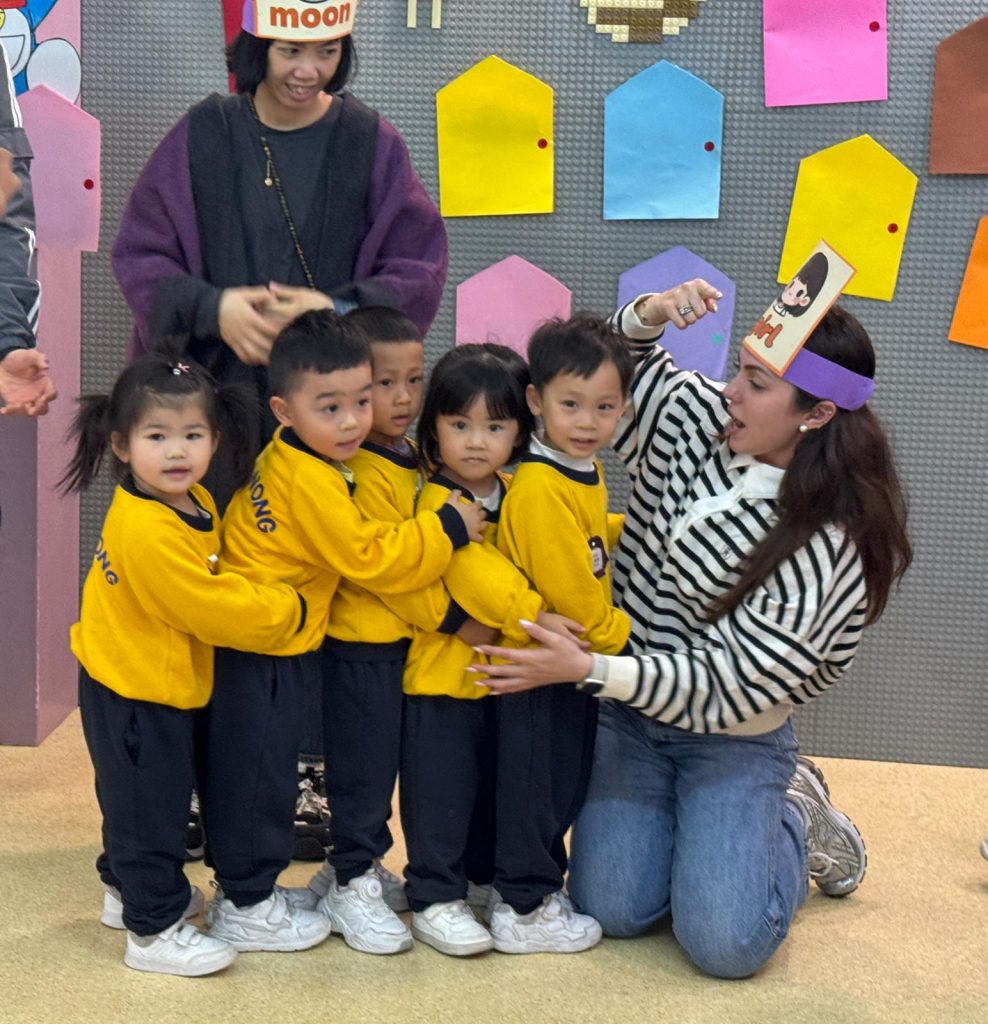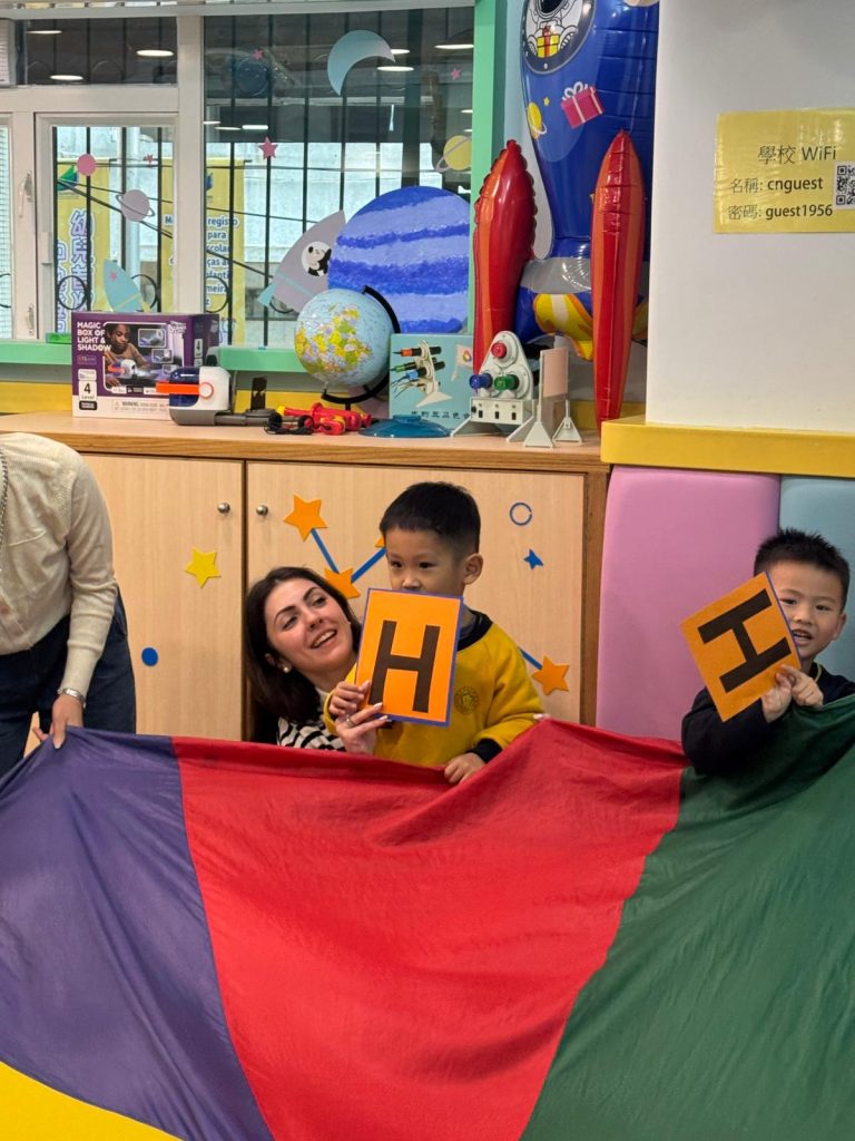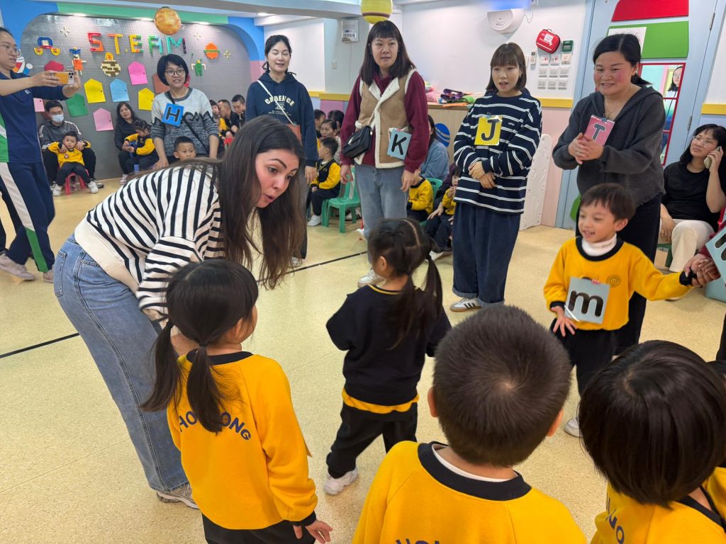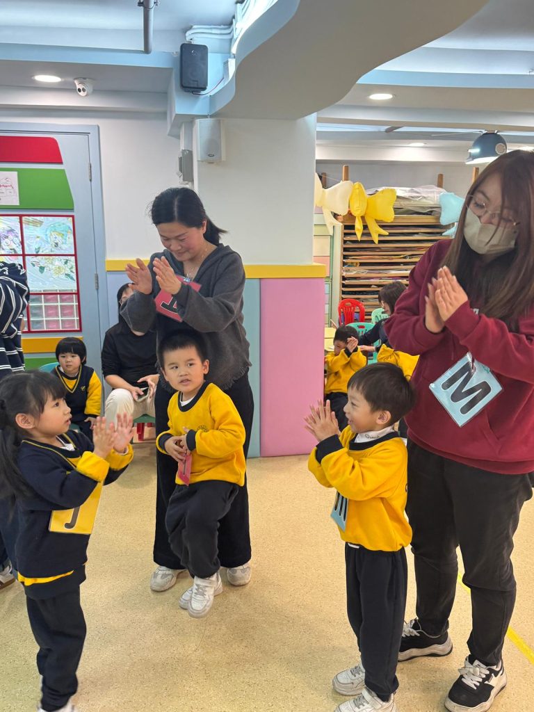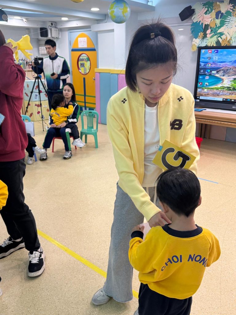 觀課日一直是學校與家庭溝通的重要橋樑,也是小朋友特別期待的日子。活動開始,Miss Vanessa利用色彩繽紛的「魔法門」教具,帶領孩子們玩起了「Knock, Knock, Knock, Who Are You?」的猜謎遊戲。每當念出咒語、打開小門,都會出現不同的英文字母,驚喜的設計瞬間吸引了所有小朋友和家長的目光,在歡笑中自然認識了字母。