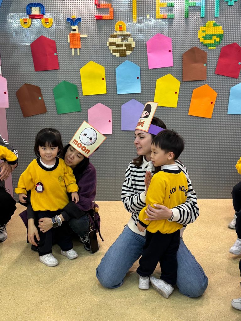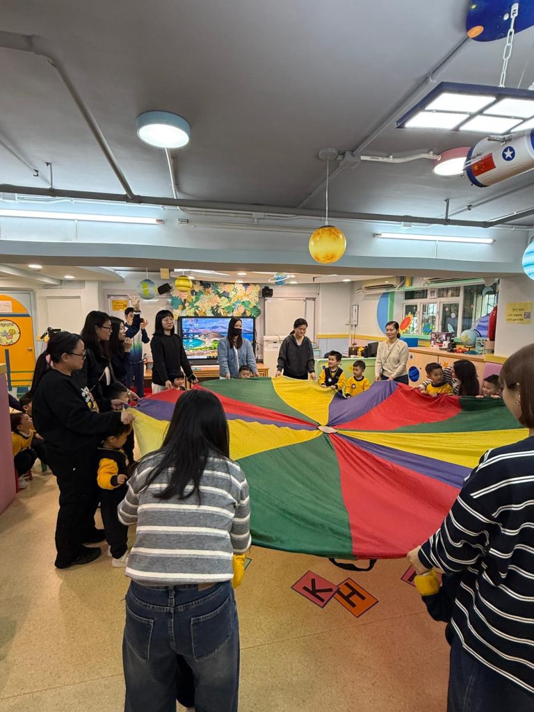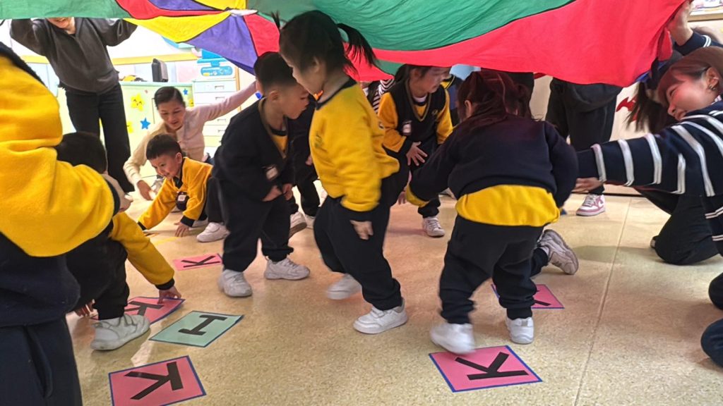 課堂另一高潮是「歡樂傘」互動遊戲,小朋友與家長跟隨「Go! Go! Go! Stop!」的音樂指令,當音樂停止時,需迅速在傘下找出對應的字卡。這個遊戲不僅考驗小朋友的聽力與反應,更讓家長一同參與,現場氣氛熱烈。隨後進行的「運送生詞積木」環節,需要家長與小朋友協作,將標有英文單詞的積木安全送達目的地,在互動中加深了對詞彙的印象,也體現了親子間的默契。