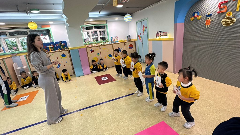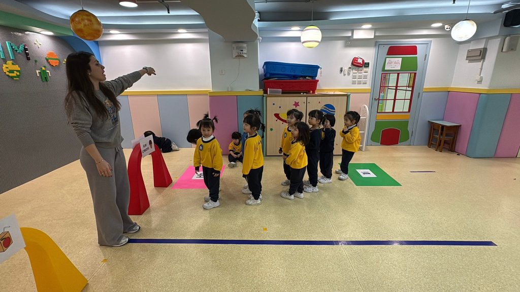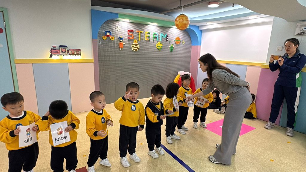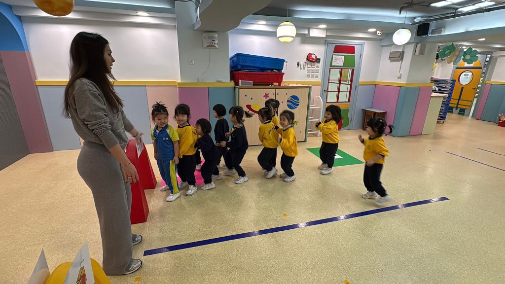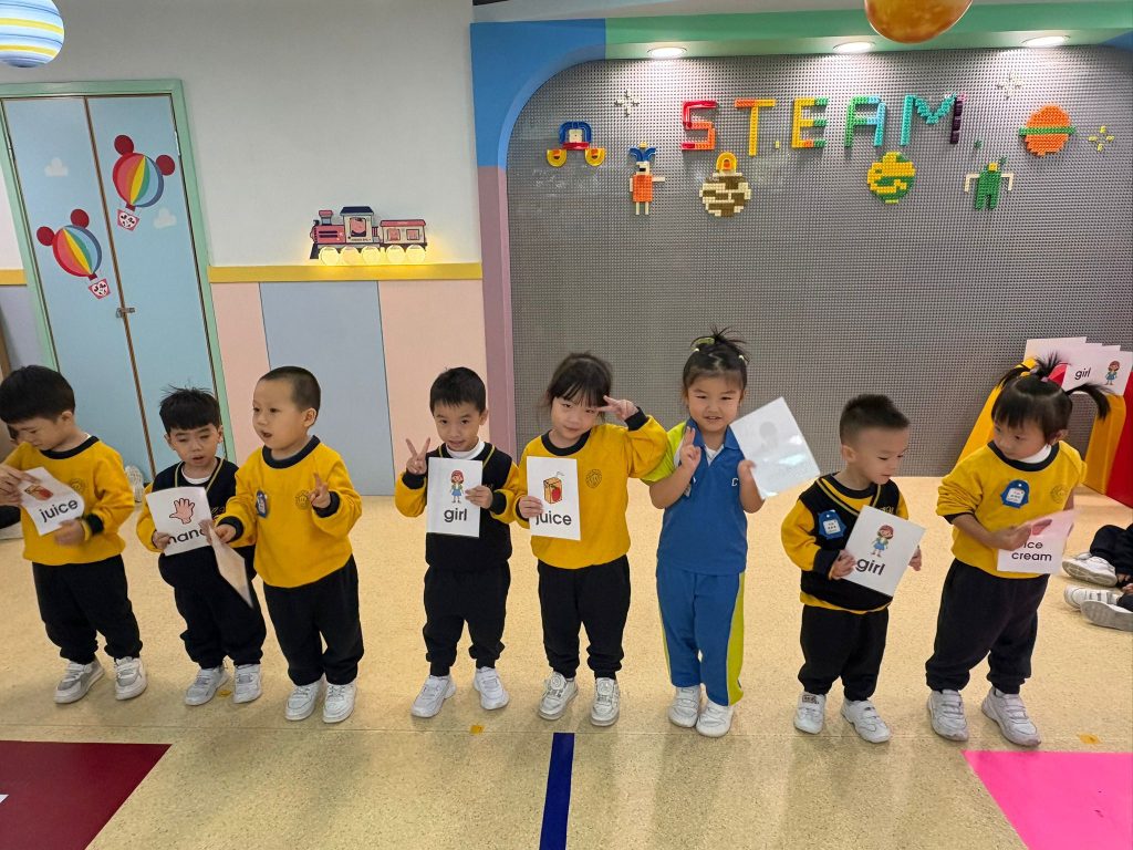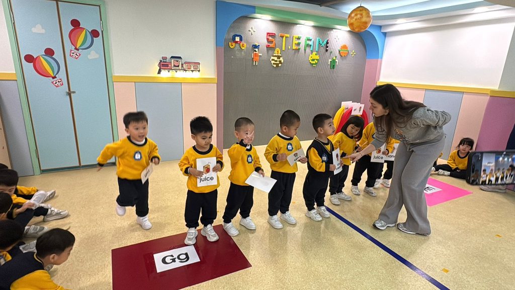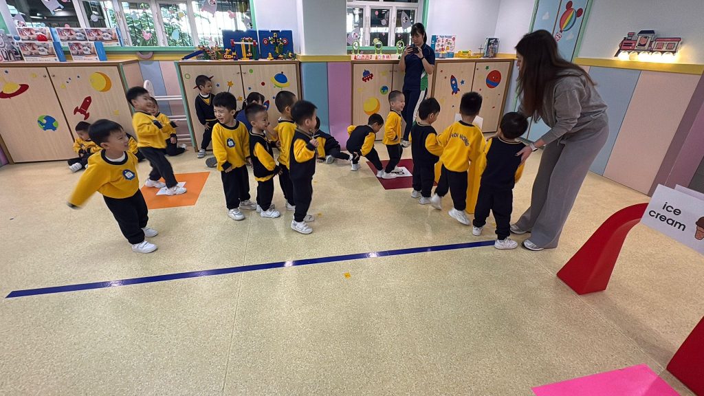 幼稚園(117威龍分校)英語課透過「玩中學」讓小朋友在專注與歡笑中掌握字母與常用單詞。課堂聚焦字母 G、H、I、J,以及單詞 hands、juice、ice cream、girl。孩子們先玩蘿蔔蹲聽到 Miss Vanessa 說的單詞,手持對應詞語的小朋友立即蹲下,訓練聽辨與反應。接著是字母奔跑賽,聽口令迅速跑入 G/H/I/J 的框框,強化字母辨識。最後在聽到“girl / hands / juice / ice cream”立刻跳到對應拱門前,結合聽說與動作記憶。整堂課小朋友積極參與,讓我們一起看看小朋友們的學習成果吧。