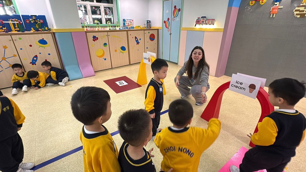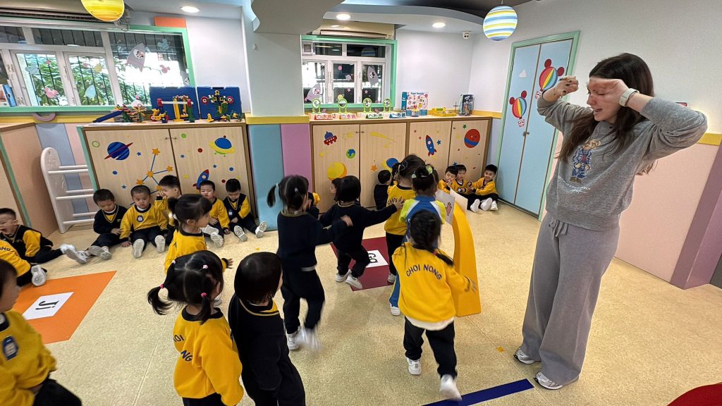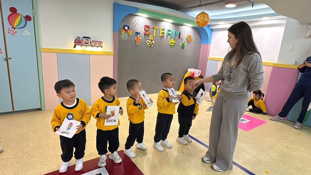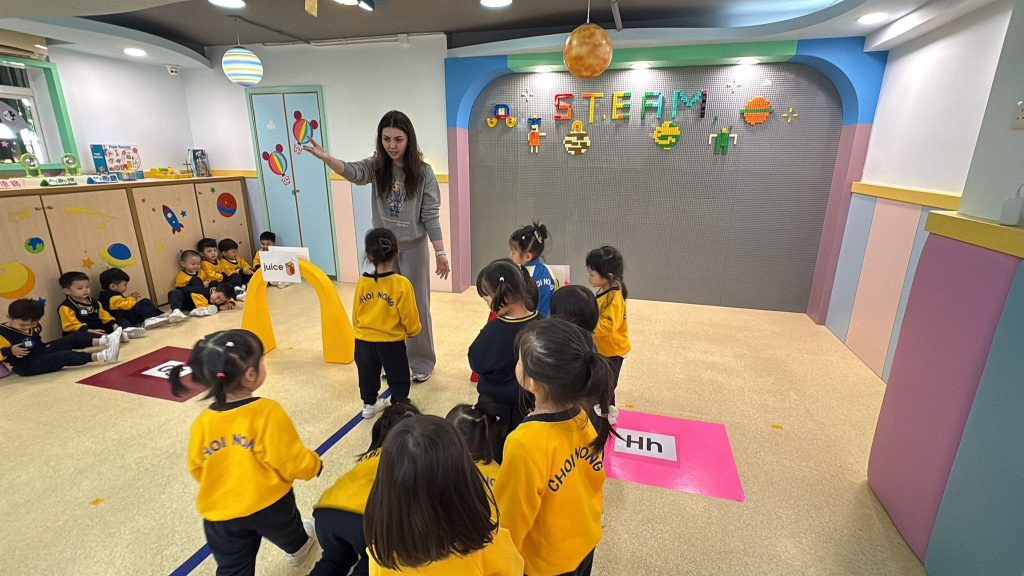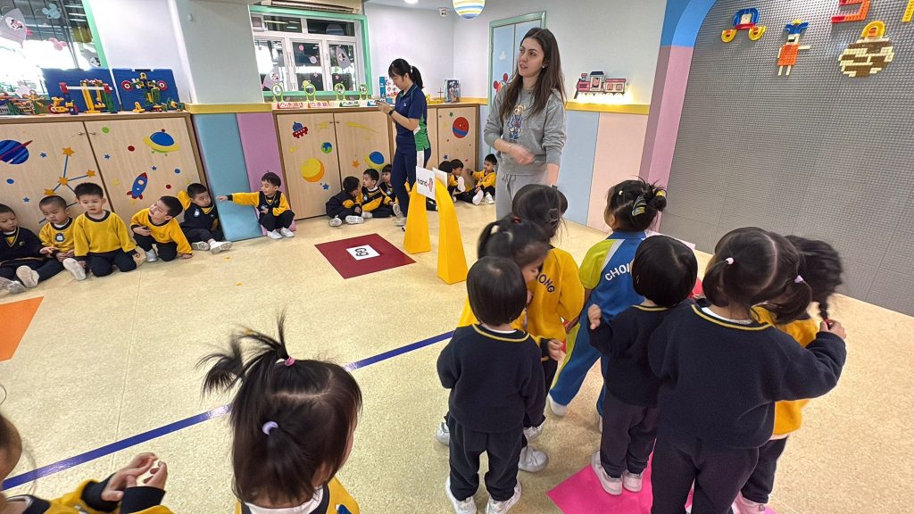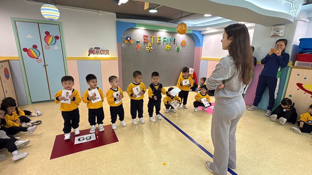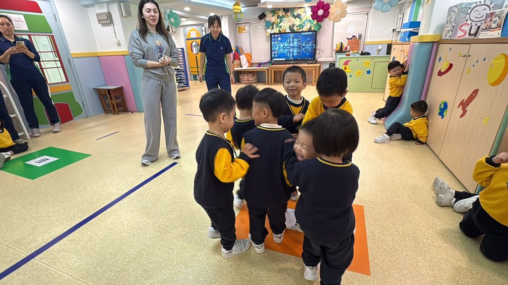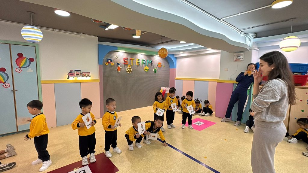 幼稚園(117威龍分校)英語課透過「玩中學」讓小朋友在專注與歡笑中掌握字母與常用單詞。課堂聚焦字母 G、H、I、J,以及單詞 hands、juice、ice cream、girl。孩子們先玩蘿蔔蹲聽到 Miss Vanessa 說的單詞,手持對應詞語的小朋友立即蹲下,訓練聽辨與反應。接著是字母奔跑賽,聽口令迅速跑入 G/H/I/J 的框框,強化字母辨識。最後在聽到“girl / hands / juice / ice cream”立刻跳到對應拱門前,結合聽說與動作記憶。整堂課小朋友積極參與,讓我們一起看看小朋友們的學習成果吧。