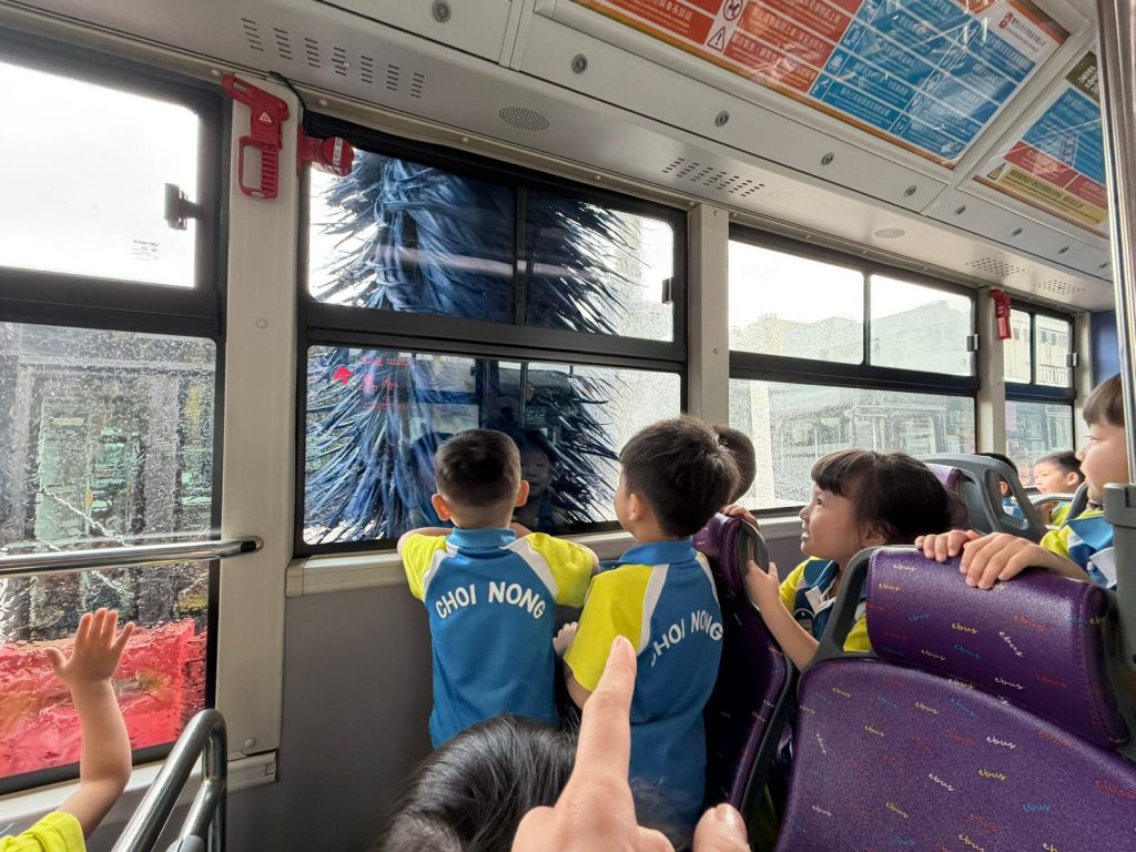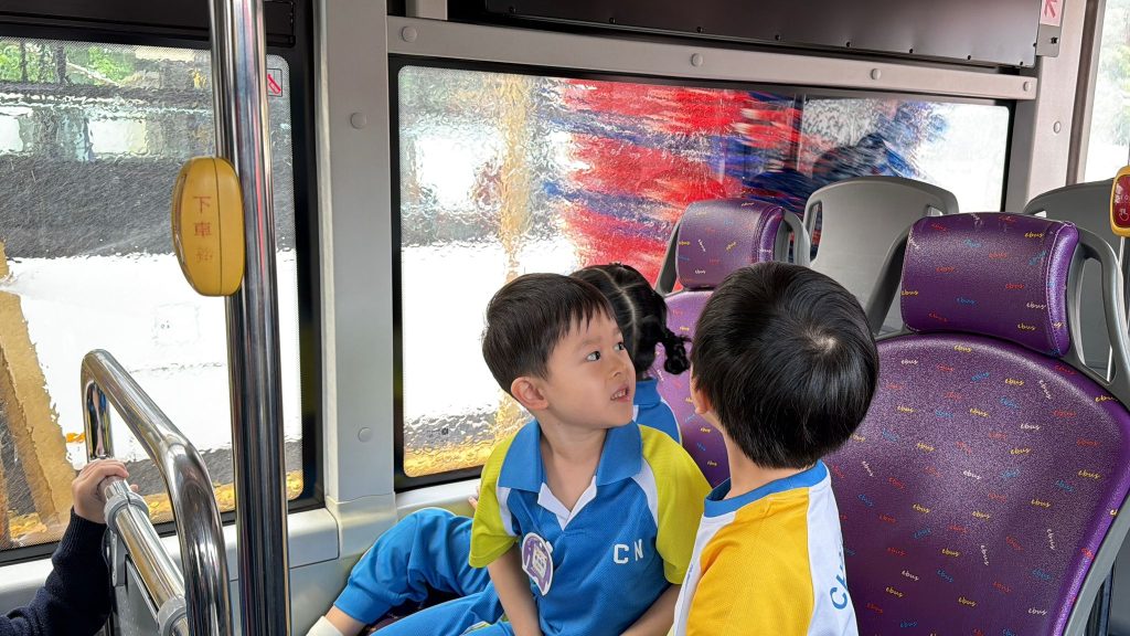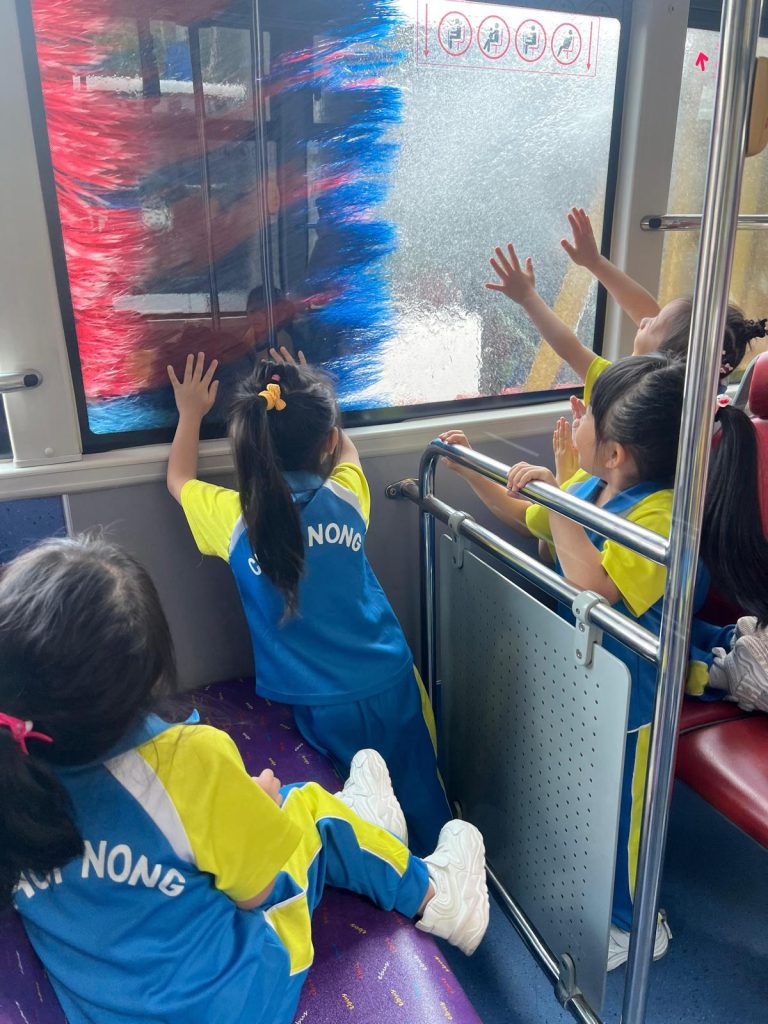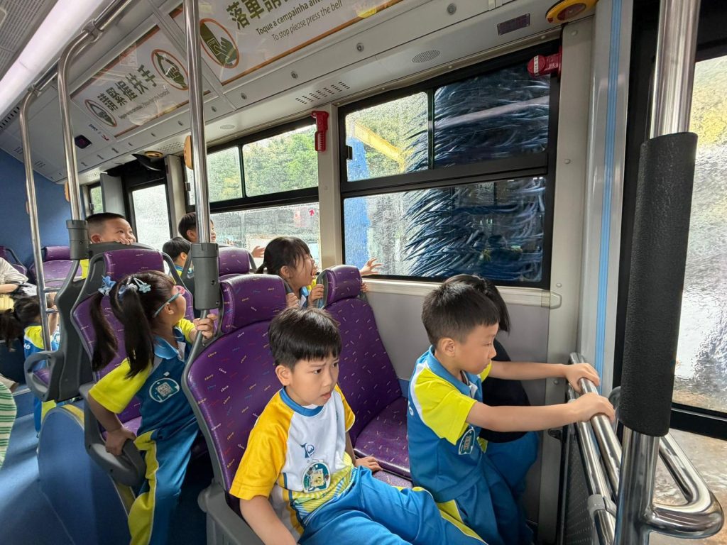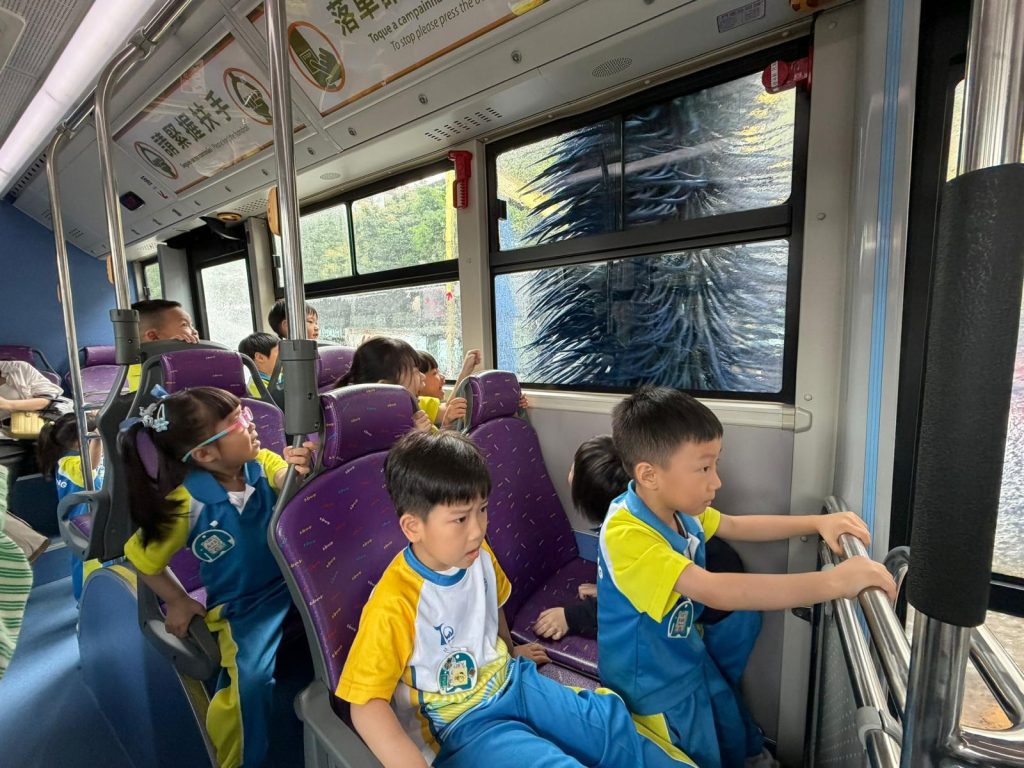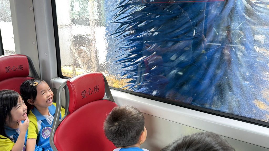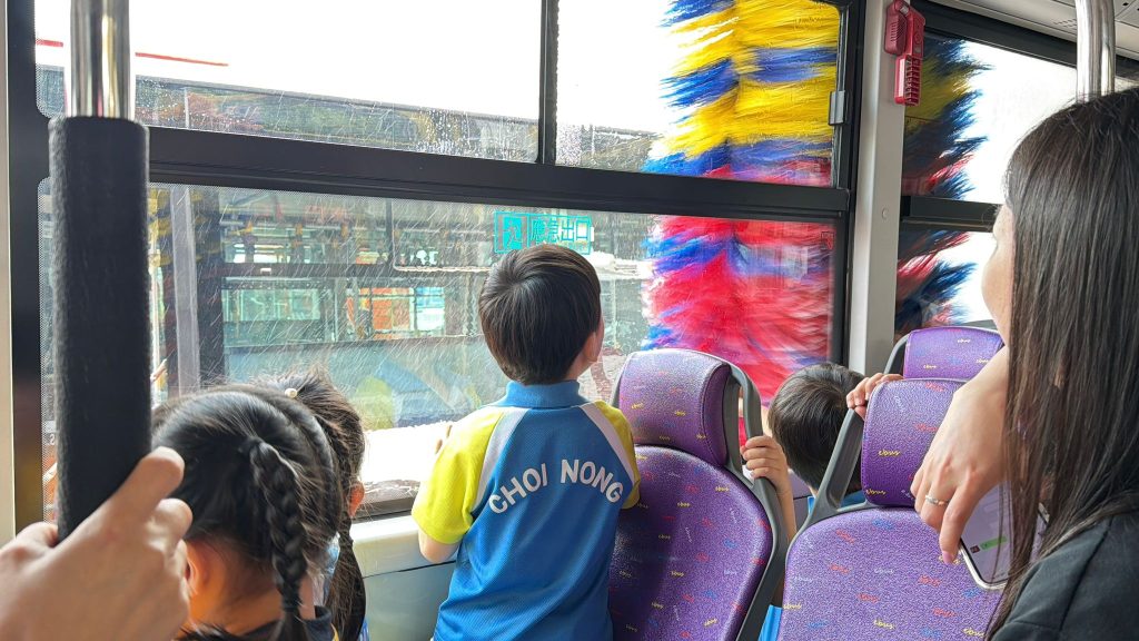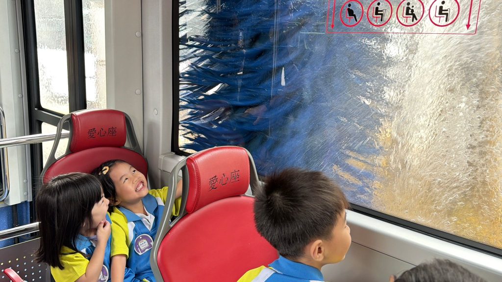 最令人興奮的環節來啦!孩子們親身坐上巴士,體驗了巴士走進「超大型淋浴間」洗車的過程,看著巨大的刷子在車窗外轉動,大家都發出了驚喜的歡呼聲!