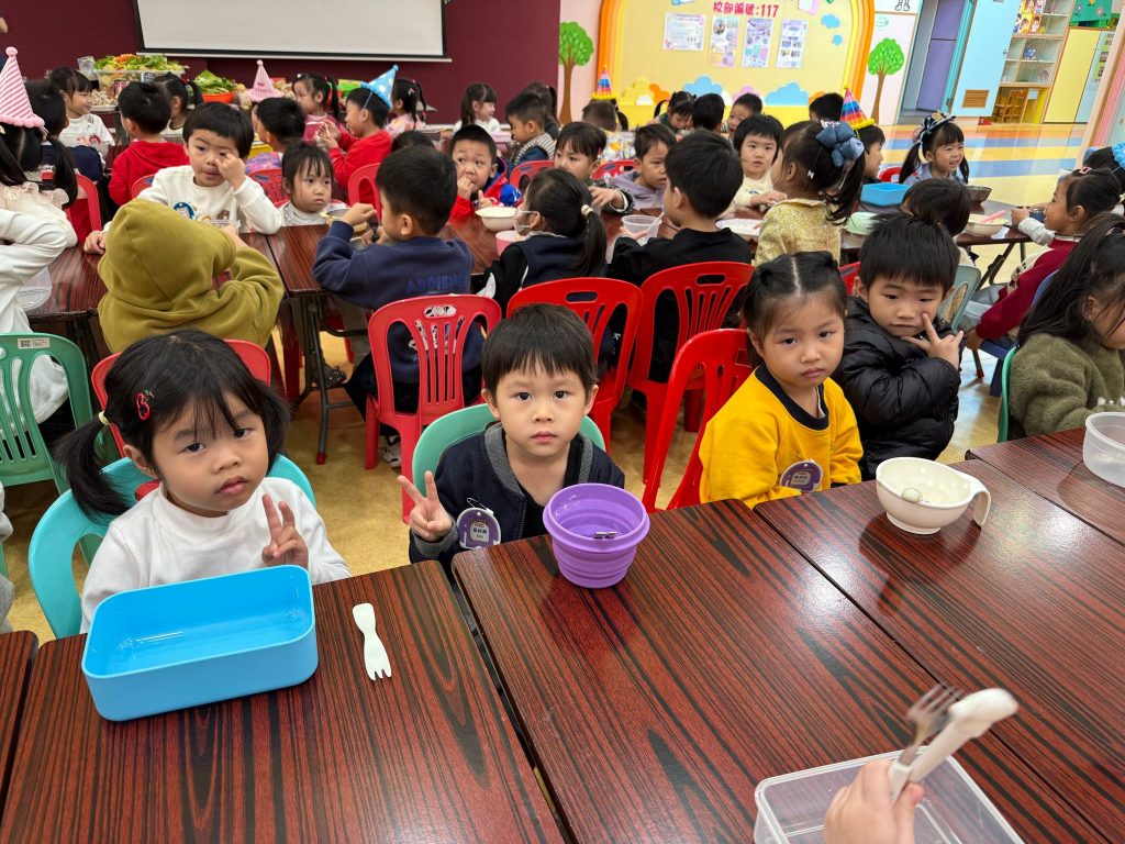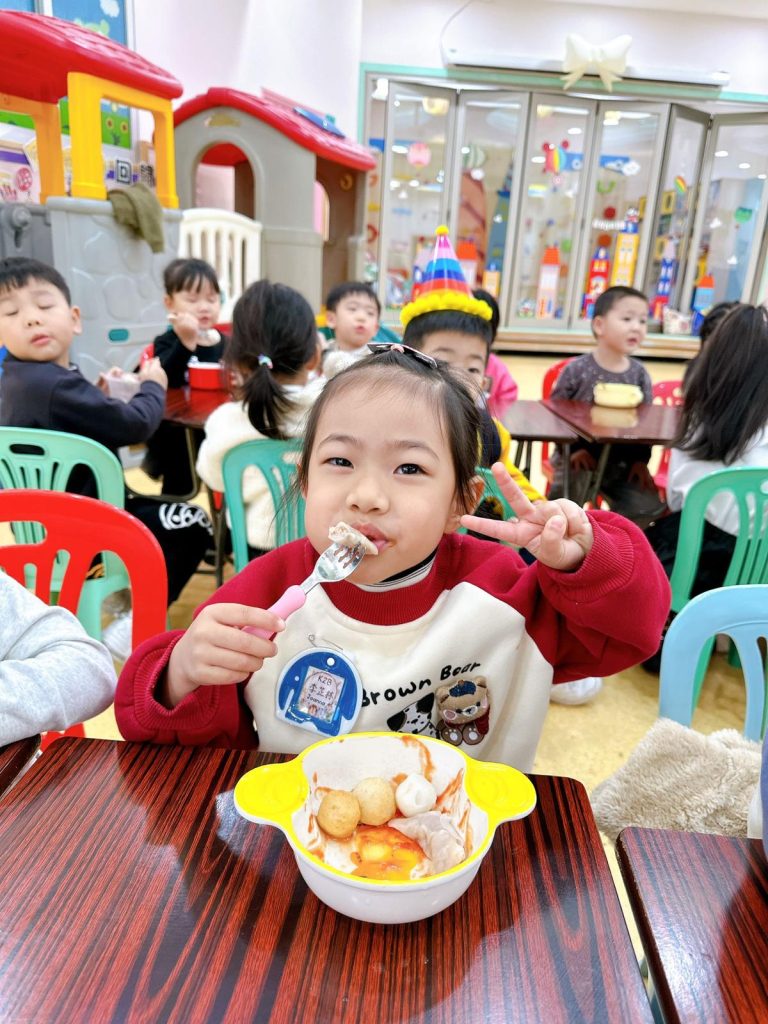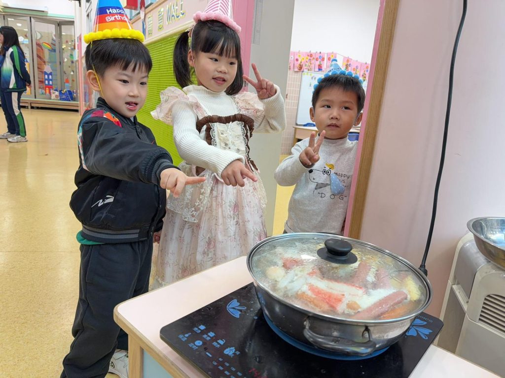 活動中,老師們將繽紛蔬菜放入輕煙裊裊的小鍋,當湯底開始咕嘟沸騰,平台瞬間充滿歡呼。孩子們圍坐共唱生日歌,以美味的丸子代替傳統蛋糕,在溫馨燭光中許下願望。
