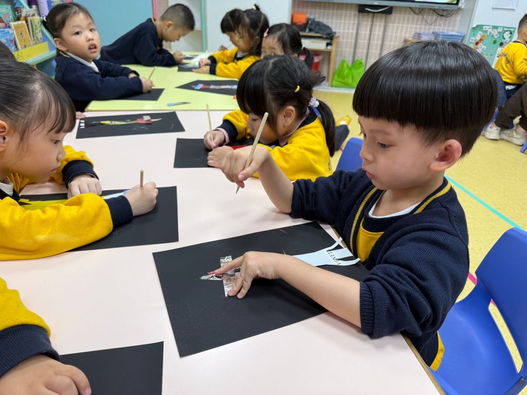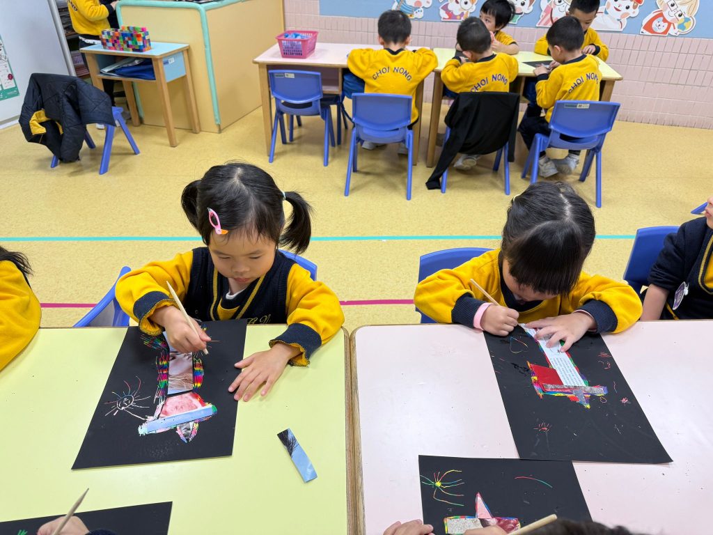 本次畫作利用了特別的紙張,而且不是用畫筆作畫,小朋友透過廢物利用,把舊的雜誌拼貼成澳門旅遊塔的形狀,再用刮刮筆在特別的紙張上刮出彩虹般的煙火。