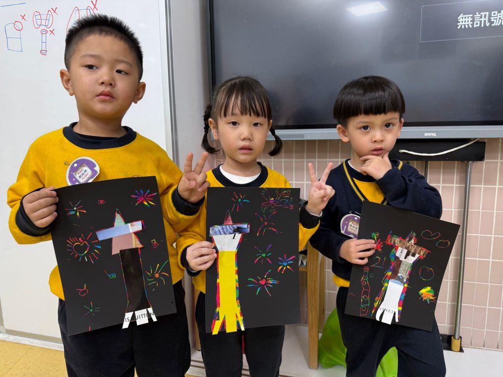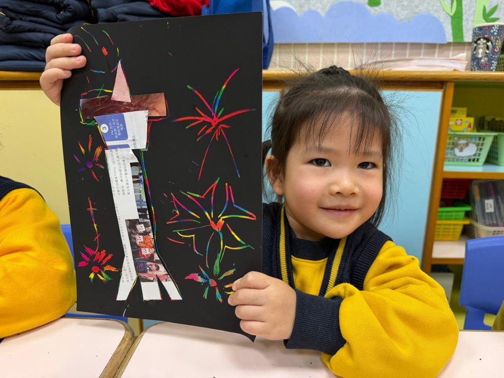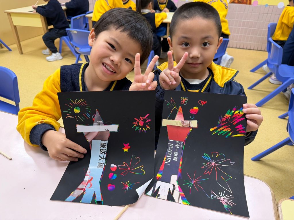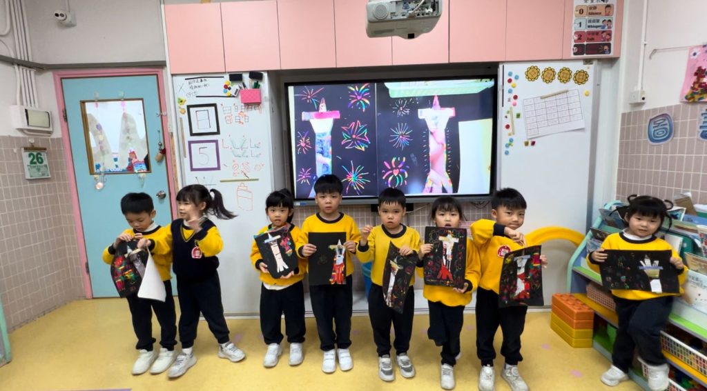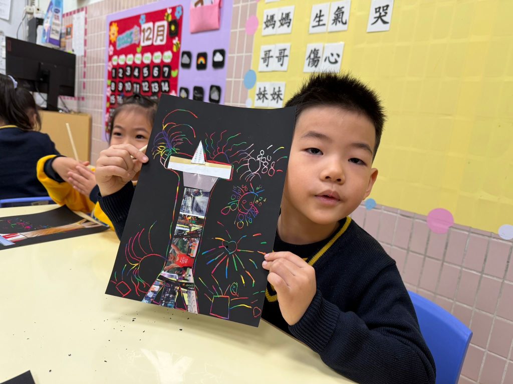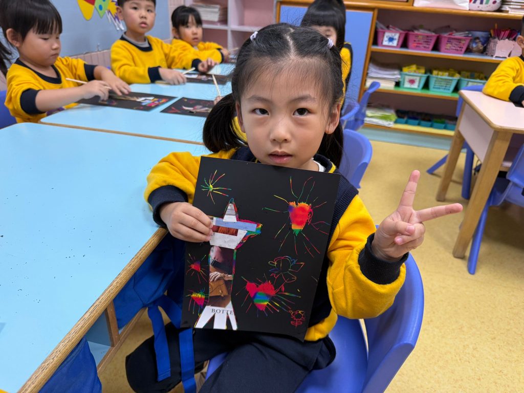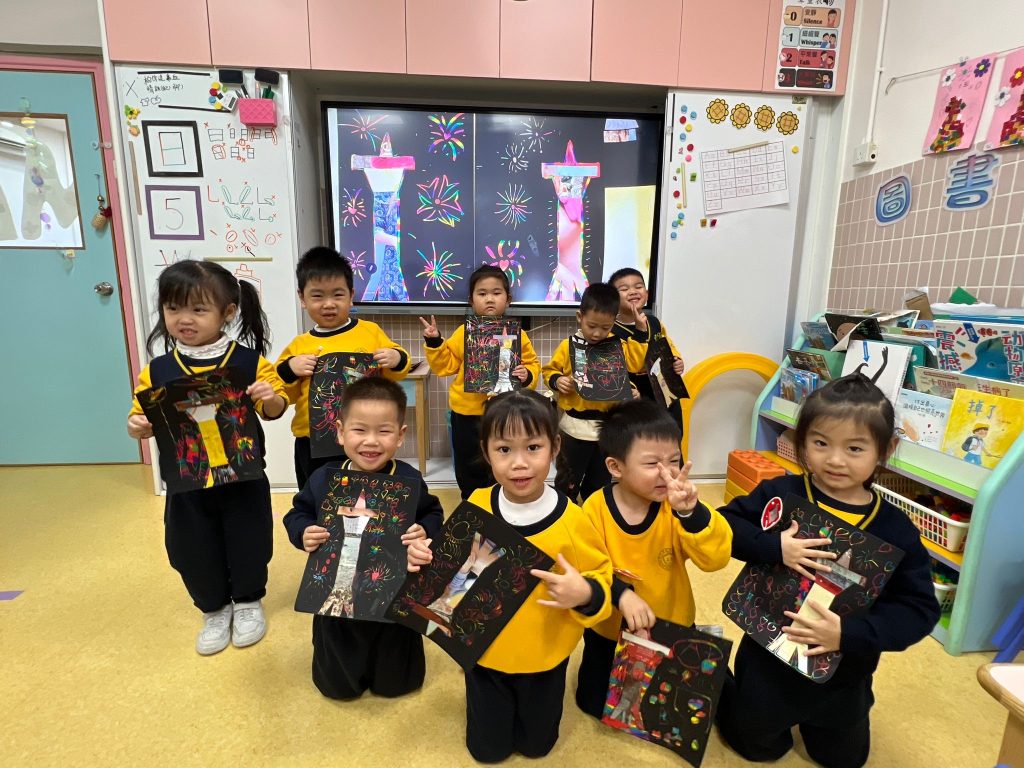 今年是澳門特別回歸祖國26周年,每年特區政府都會有一系列的慶祝活動,其中包括放煙火。相信每位小朋友都有在澳門旅遊塔附近觀看過煙火的體驗。所以本次K2級小朋友就創作了一幅與別不同的畫作,慶祝澳門回歸祖國。