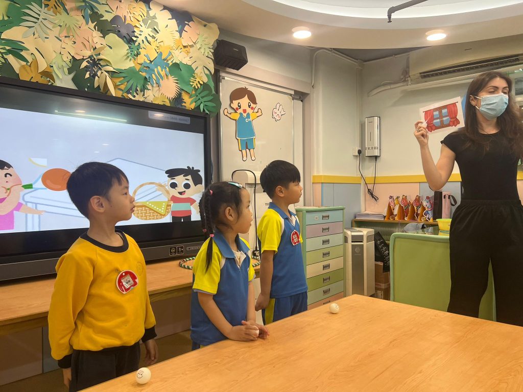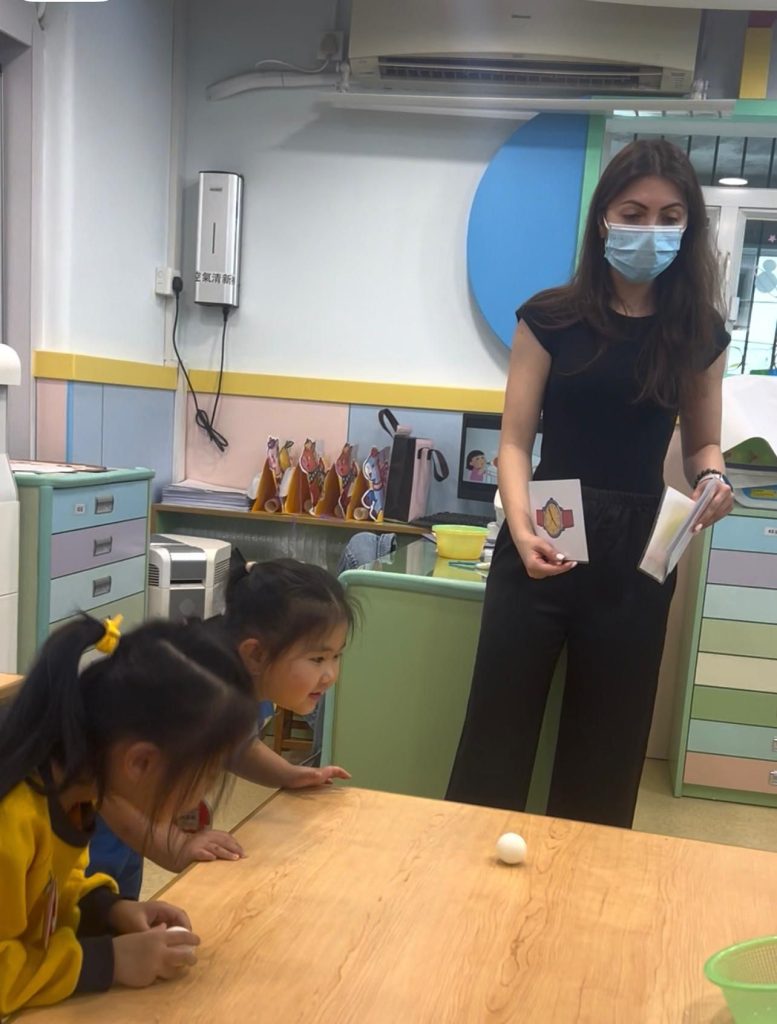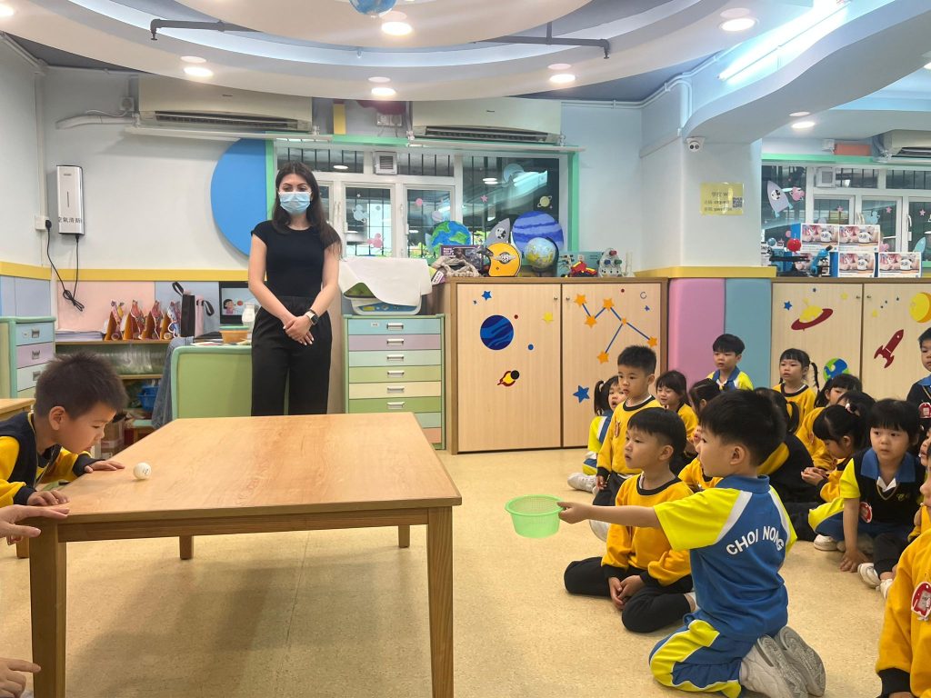 此外,老師更設計了「乒乓波氣流挑戰」,將乒乓球放在盛水的小杯子或桌面上,讓孩子用力呼氣吹動乒乓球,同時發出“Wuh-wuh-wuh”的音節。小朋友在吹動乒乓波的過程中,切實感受由腹腔送出的氣流,進一步鞏固「W」的發音技巧,課室裏歡笑聲此起彼落。