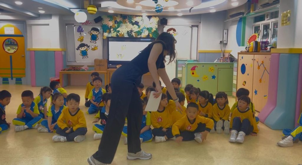 在主題遊戲「風車轉轉拼音樂」中,Miss Vanessa利用色彩繽紛的風車,引導小朋友一邊轉動風車,一邊練習「W」的嘴形。當風車隨着氣息呼呼轉動,孩子們也自然地發出清晰的「W」音,讓發音練習變得有趣又具體。