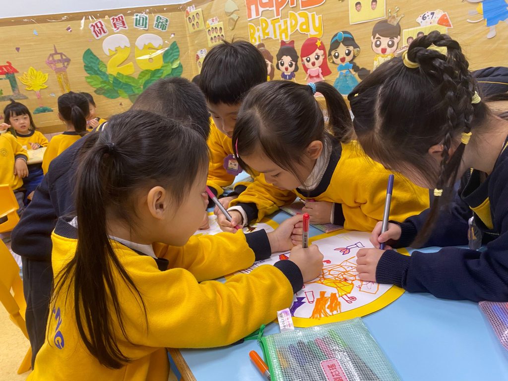 隨後,孩子們以一筆一畫的方式,共同為「26」這個數字填上了五彩繽紛的顏色,展現出他們的創意與想像力。在數字的周圍,孩子們還繪製了代表澳門特色的建築與美食,如大三巴牌坊、澳門塔和葡式蛋撻等,讓這個作品充滿了本土文化的氣息。