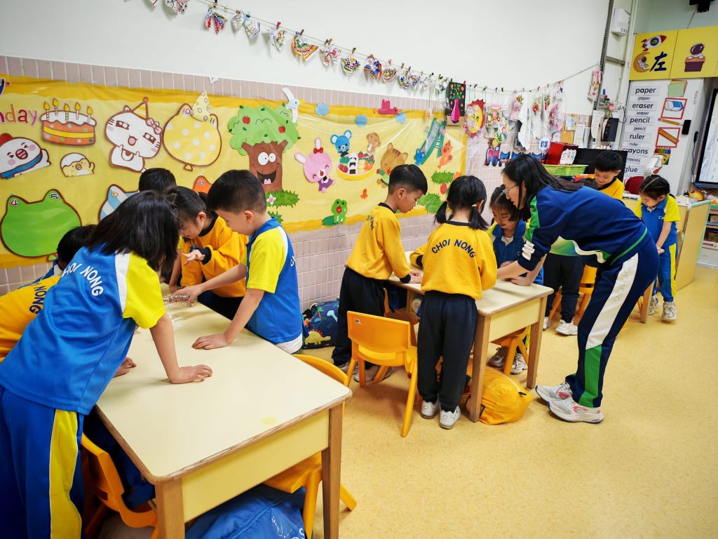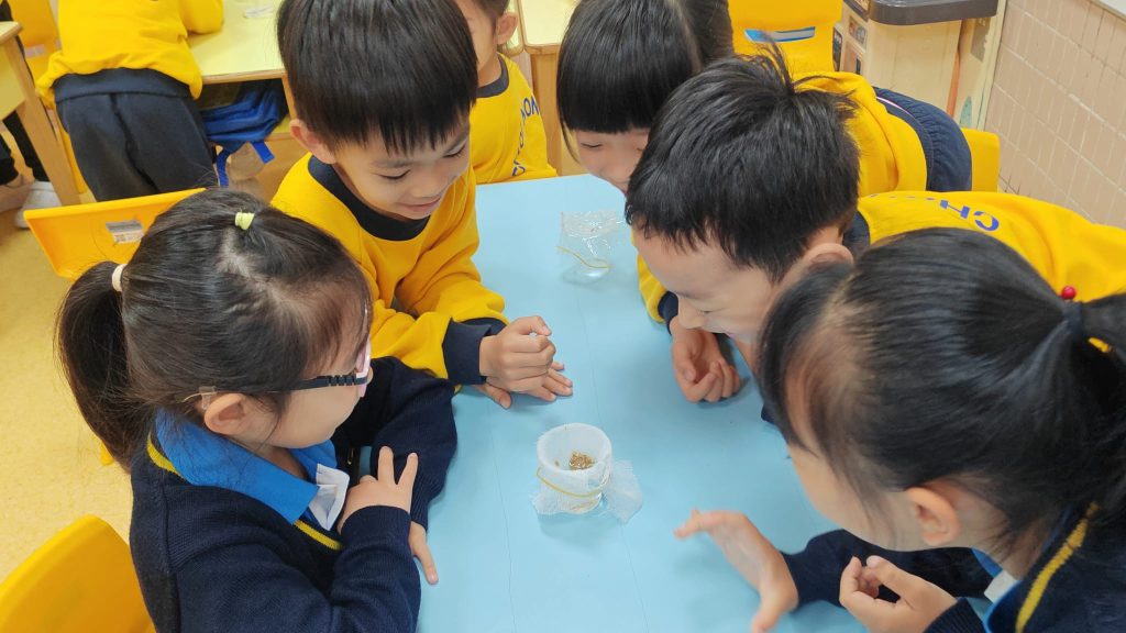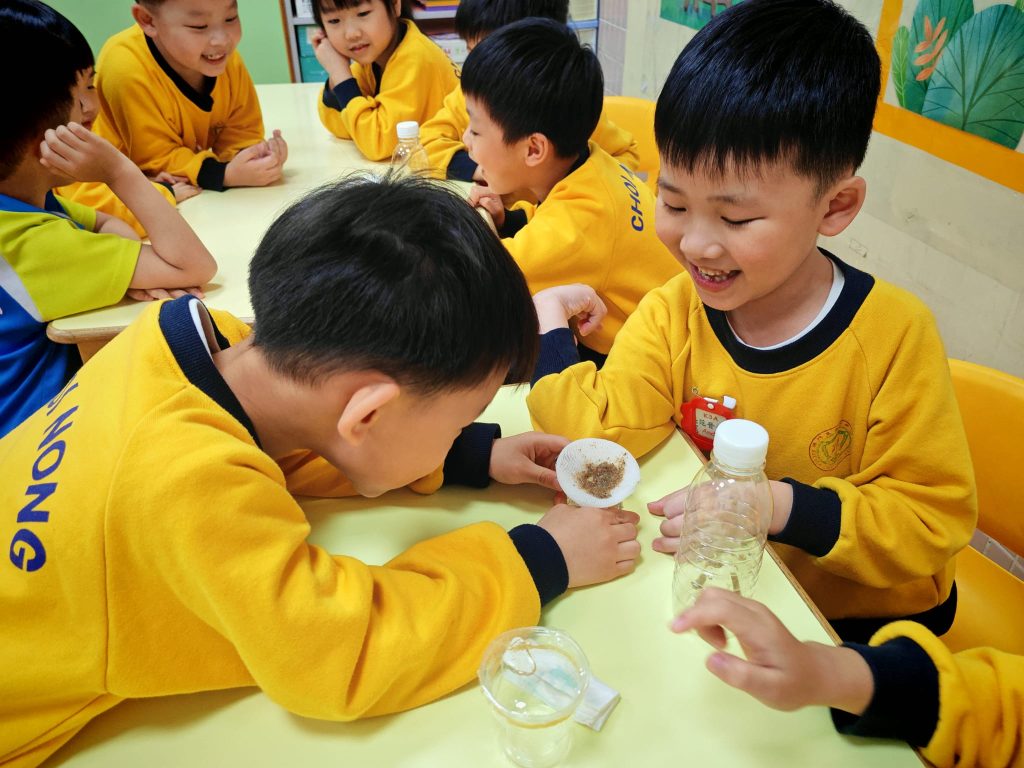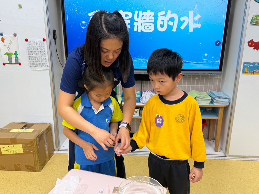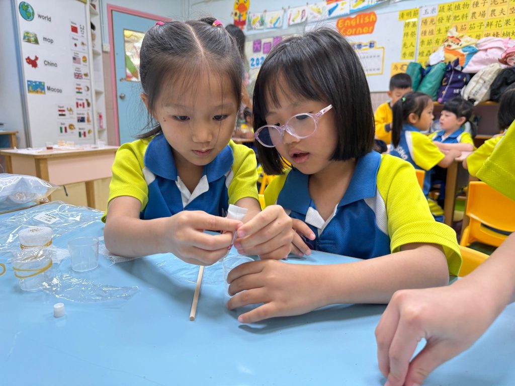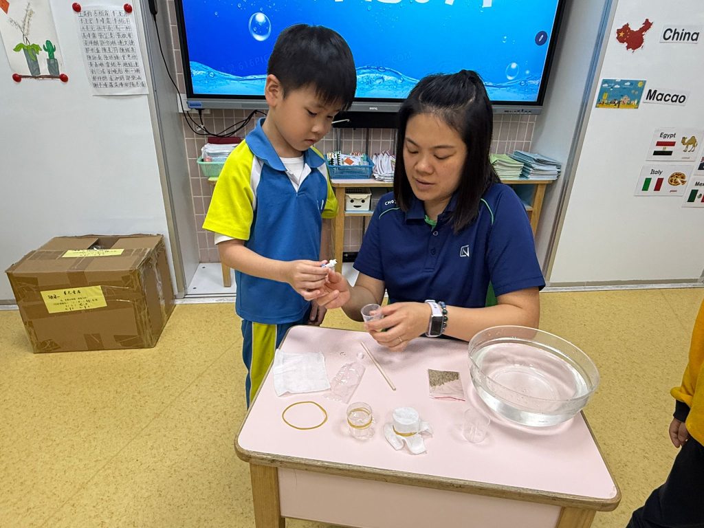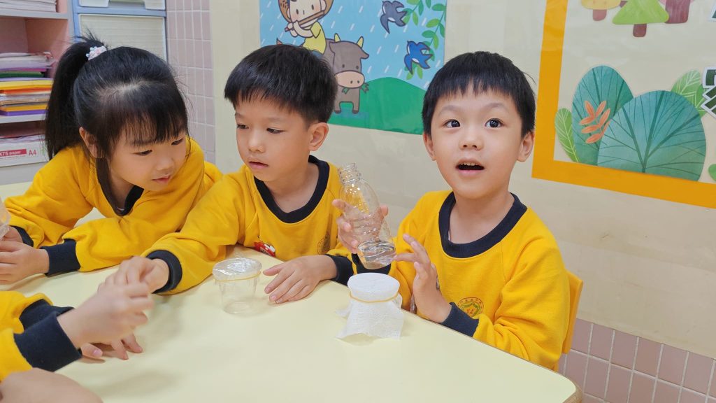 老師準備了透明杯子、水、小沙石、紗布及保鮮膜。小朋友分活動,每組合力把兩個杯子塗上紗布及保鮮膜,其後把水倒進紗布及保鮮膜上,觀察水滴流動。「水真的會爬牆嗎?」大家睜大眼睛,屏息等待。