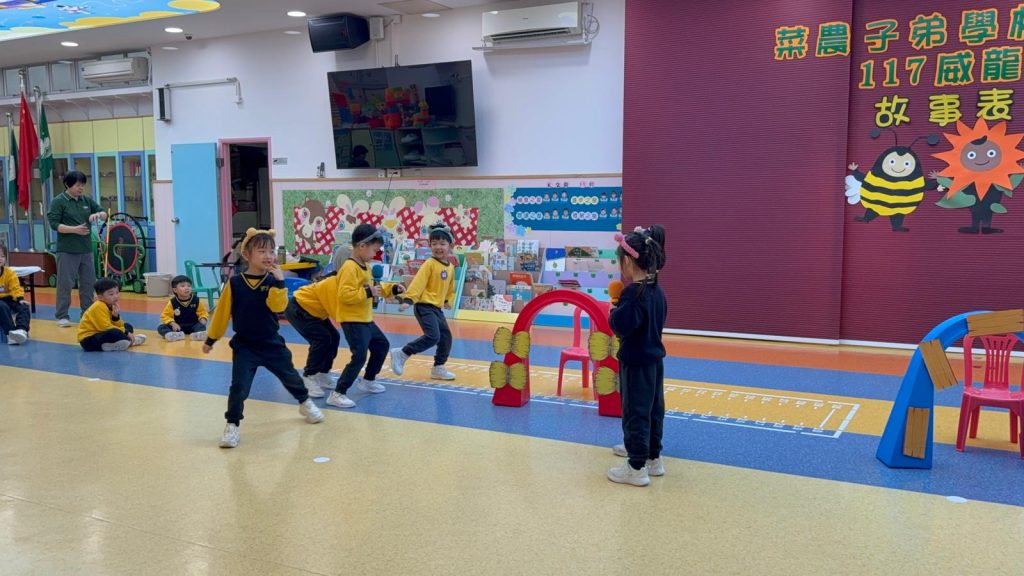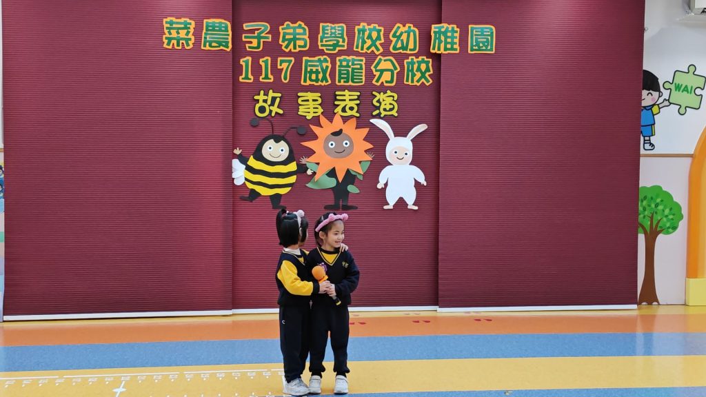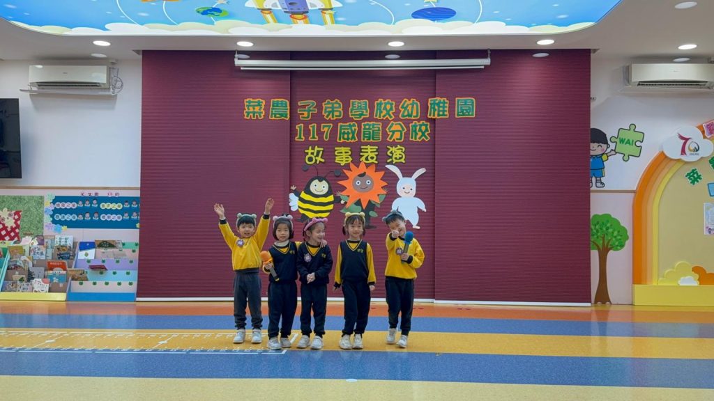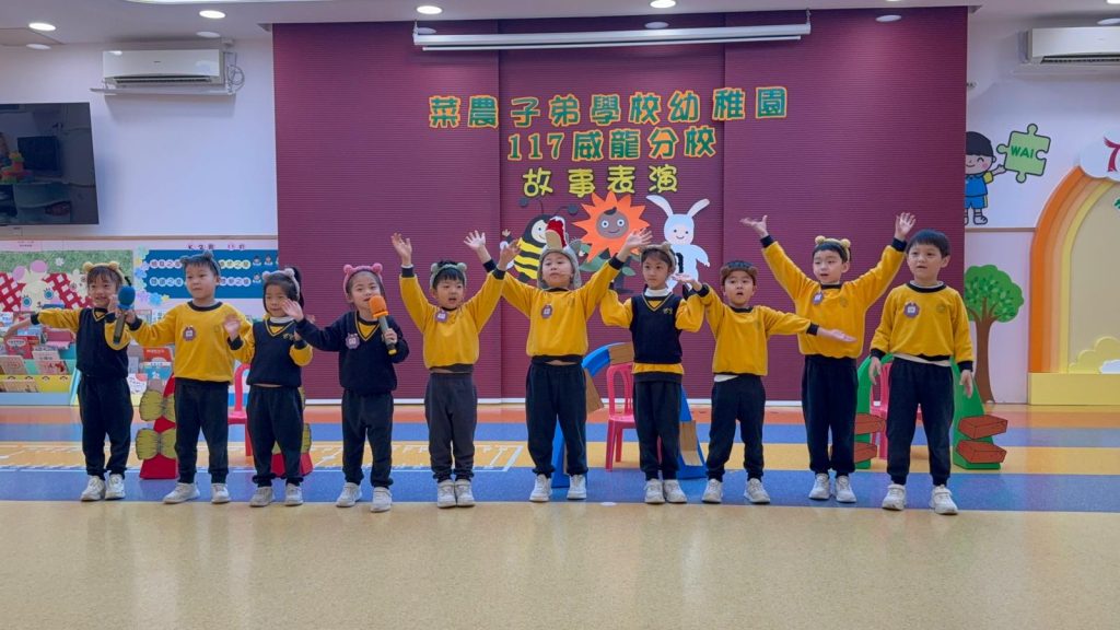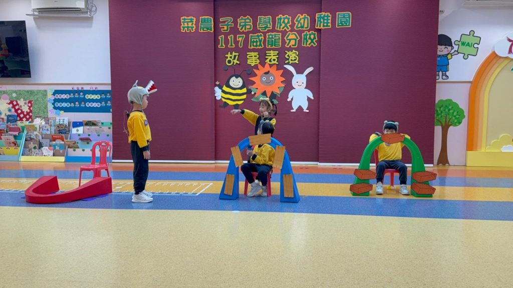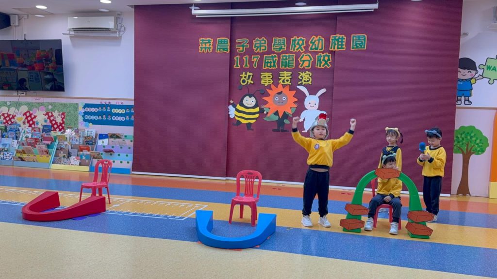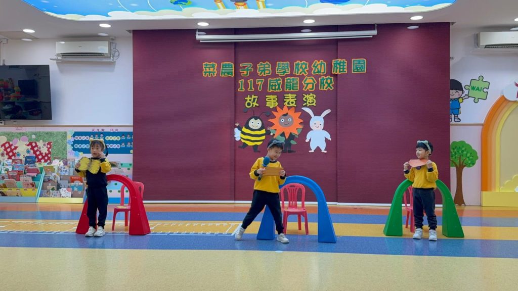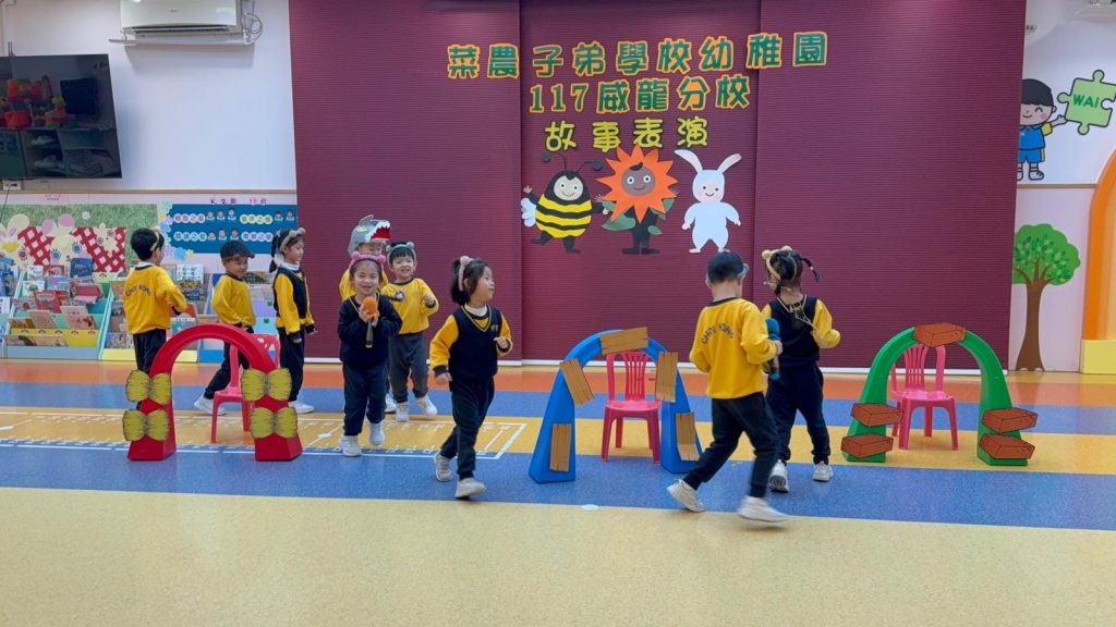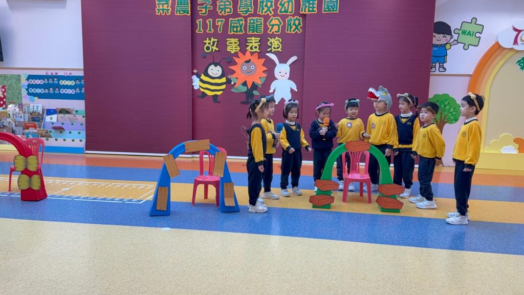 為慶祝澳門回歸26周年,幼稚園(117威龍分校)特別舉辦了「童心童德·慶回歸故事比賽」,讓小朋友透過創意表演表達對祖國的熱愛與祝福。K3C班的小朋友以英語演出故事《May I be your friend?》,改編自經典童話故事—《三隻小豬》,講述大灰狼因打噴嚏不慎吹倒小熊們的房子,小熊們非但沒有責怪,反而發現牠生病了,送上感冒藥,最終化敵為友,建立起真摯的友誼。整個表演充滿童趣與教育意義,展現了小朋友的創意、語言能力及團隊合作精神,也傳遞了關愛與包容的正面價值,為回歸紀念活動增添溫馨氣氛。