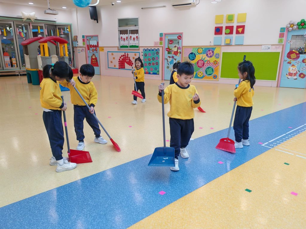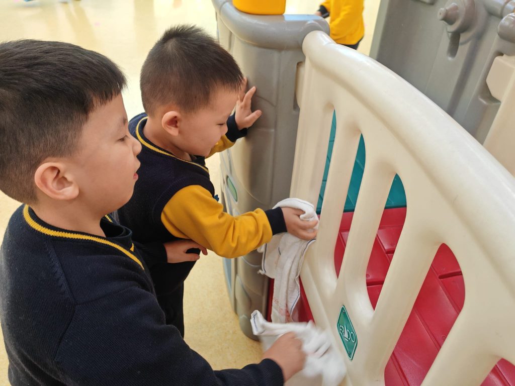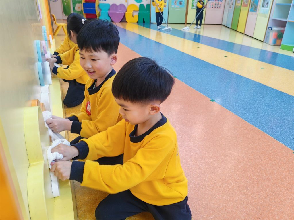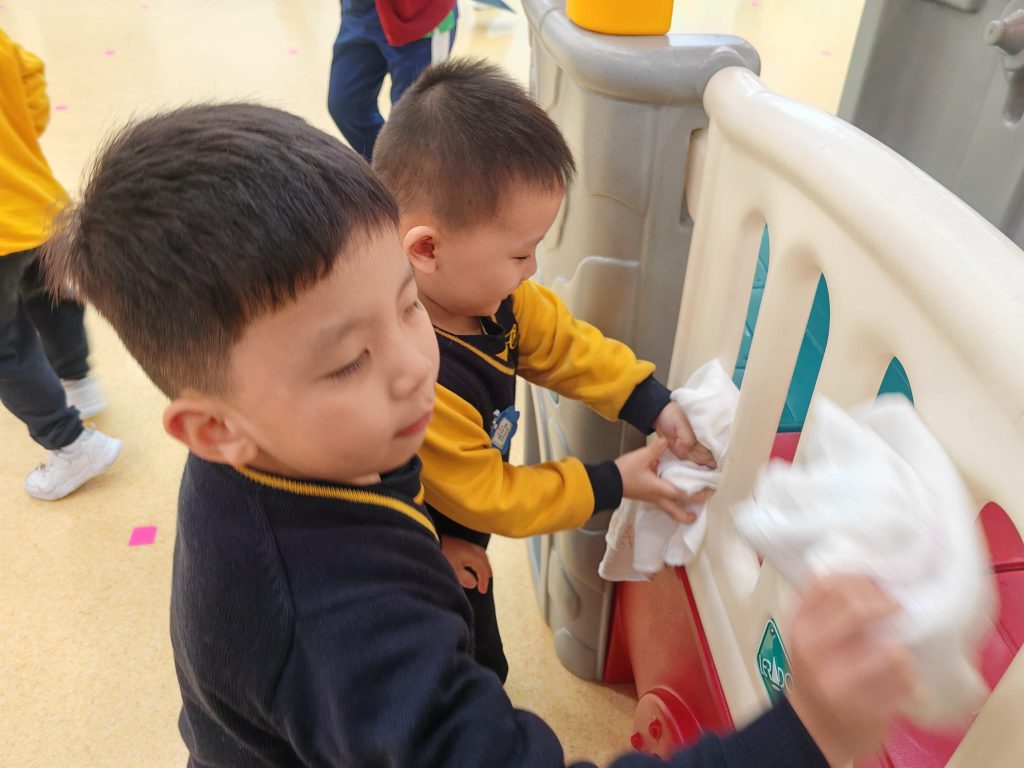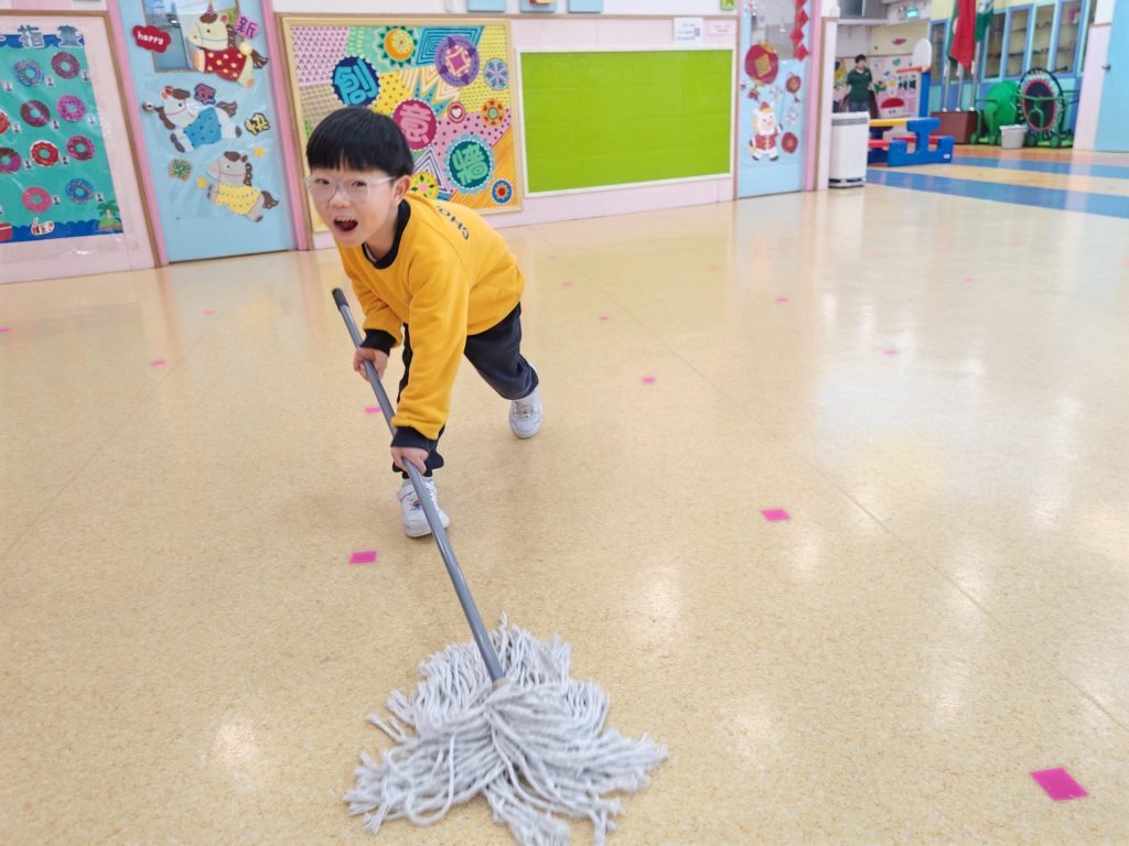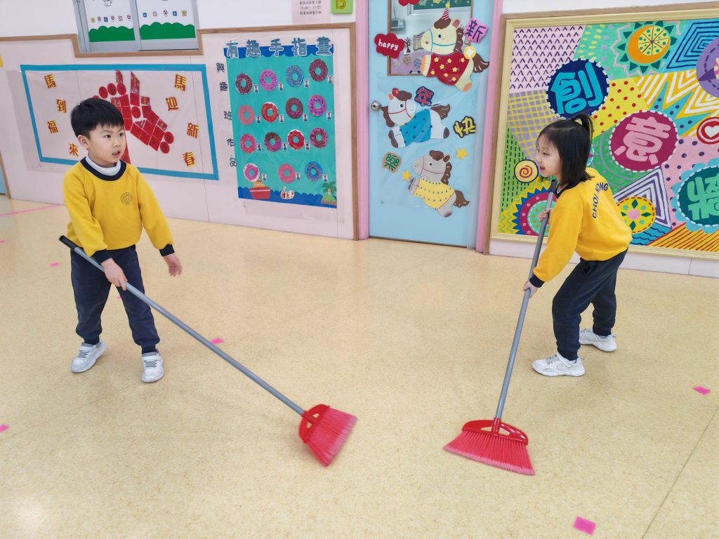 幼稚園(威龍分校)K3級小朋友也雀躍參與。暖陽灑校,孩子們化身“清潔小衛士”,手持抹布,提著水桶、掃帚和拖把,如勇敢小騎士,衝向校園各處。他們分工合作,有的踮腳擦牆,似在擦拭馬年憧憬;有的弯腰清掃,如清掃往昔煩惱;有的用力拖地,為馬年鋪就光明之路。