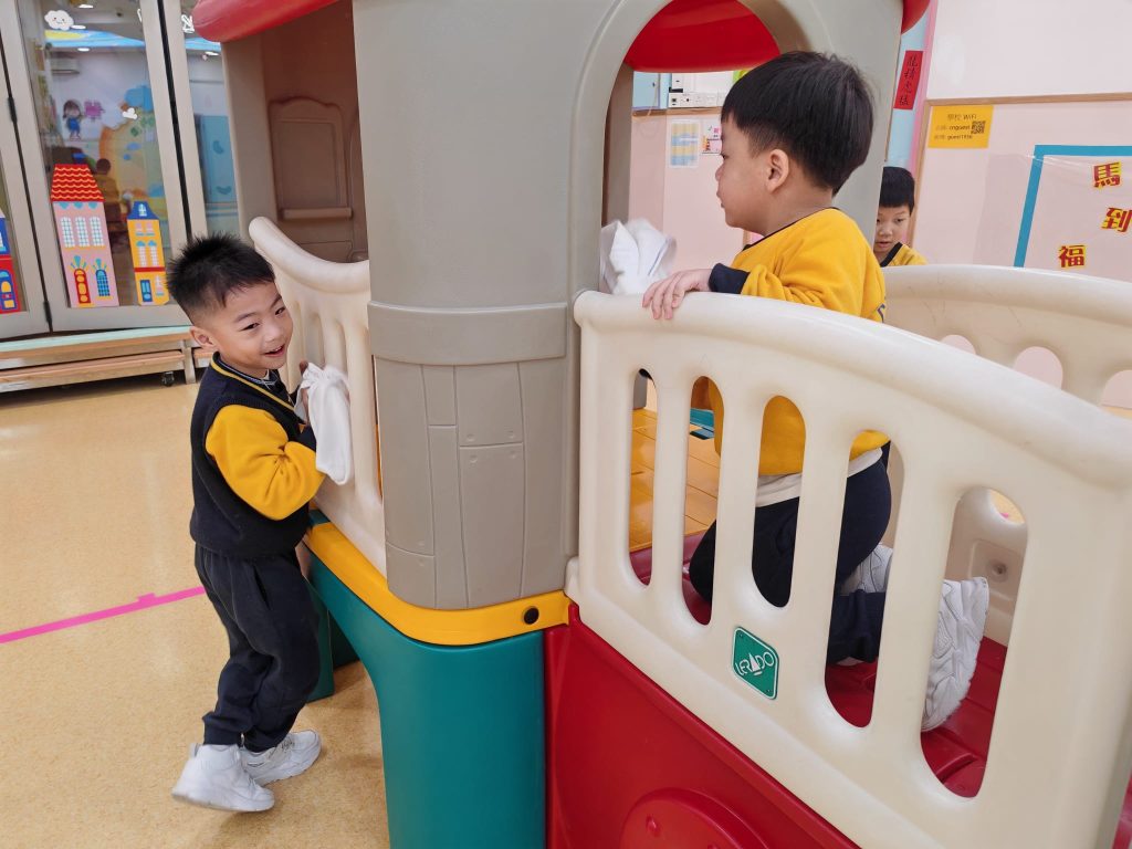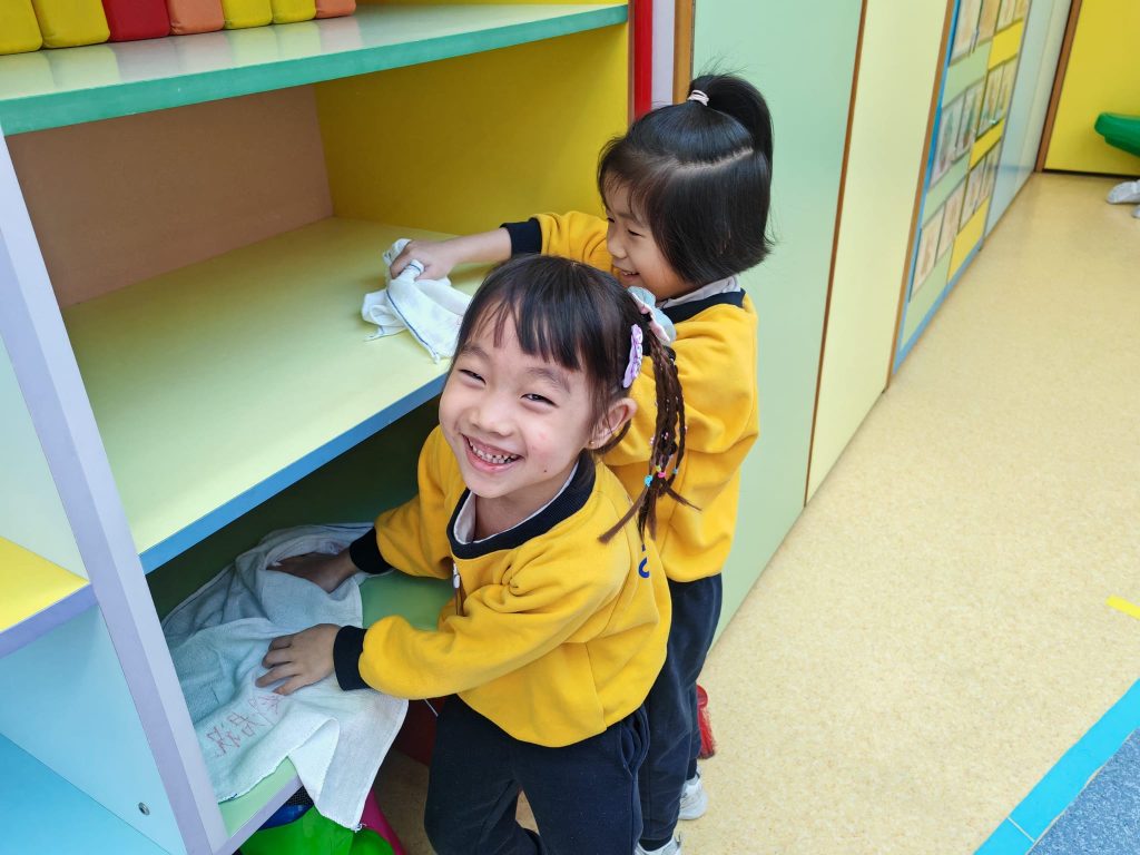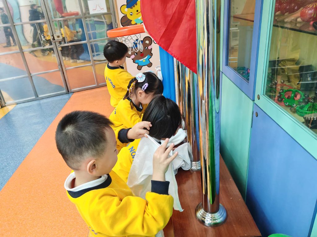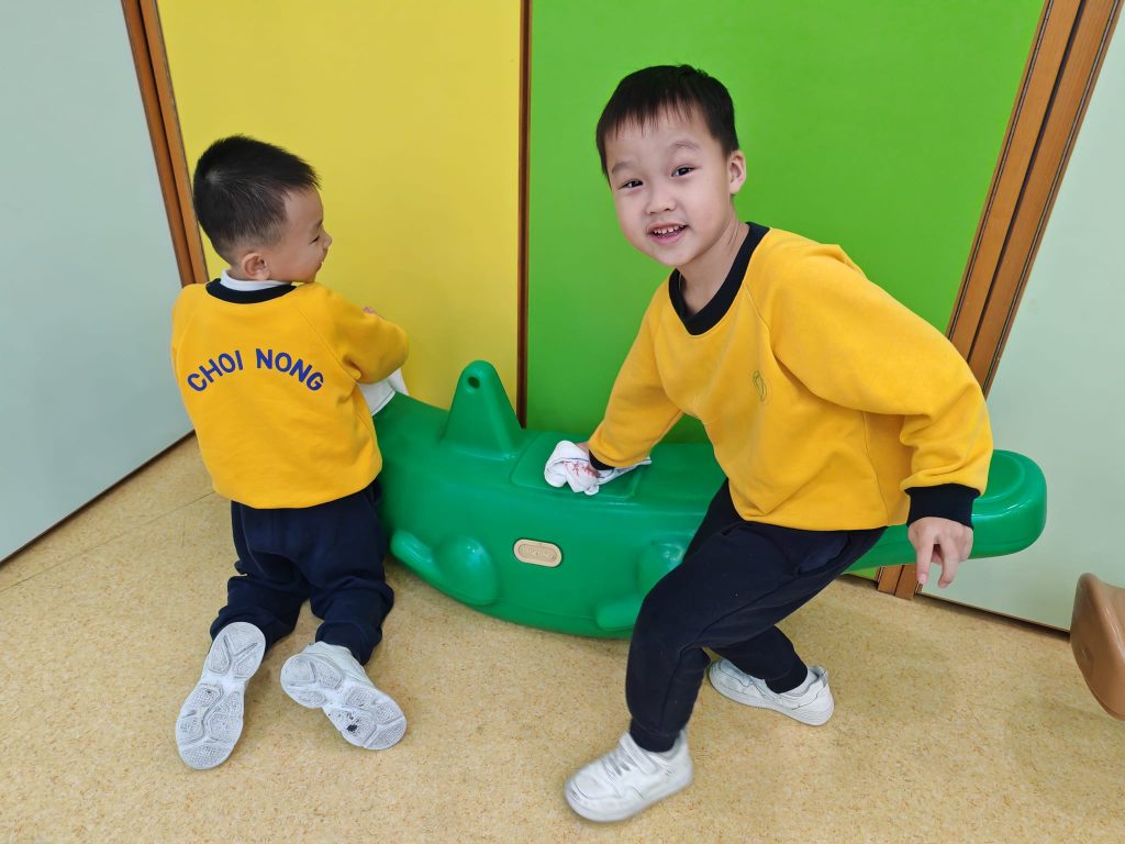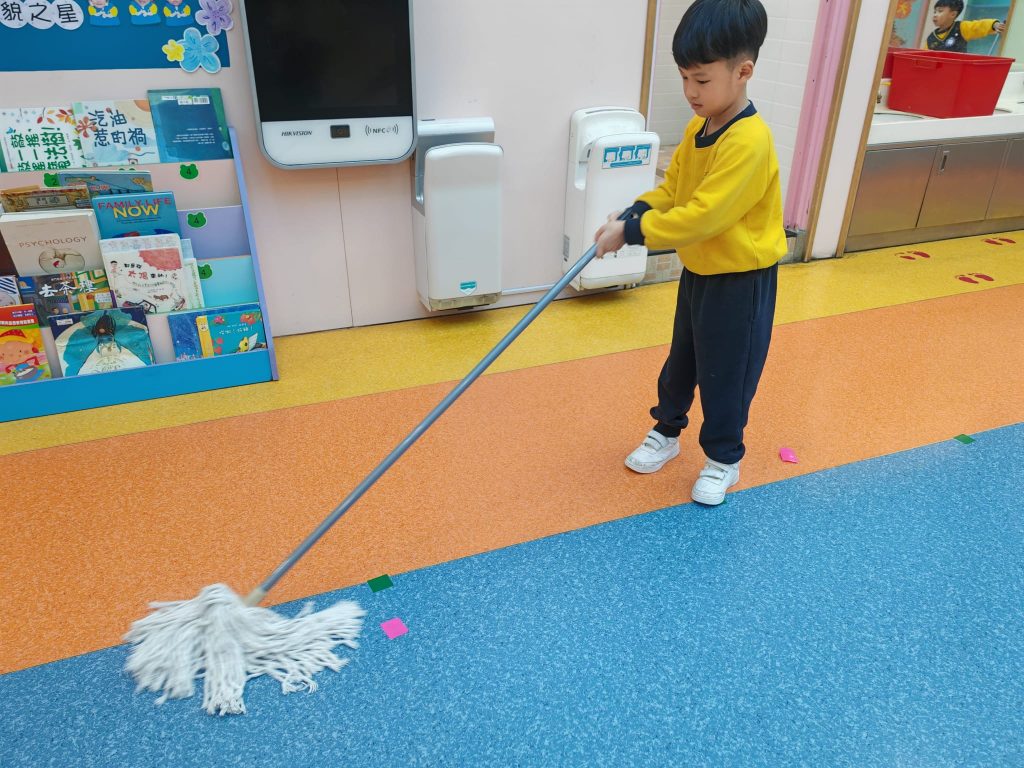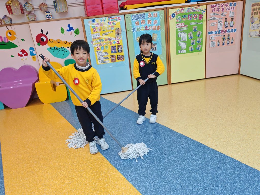 幼稚園(威龍分校)K3級小朋友也雀躍參與。暖陽灑校,孩子們化身“清潔小衛士”,手持抹布,提著水桶、掃帚和拖把,如勇敢小騎士,衝向校園各處。他們分工合作,有的踮腳擦牆,似在擦拭馬年憧憬;有的弯腰清掃,如清掃往昔煩惱;有的用力拖地,為馬年鋪就光明之路。