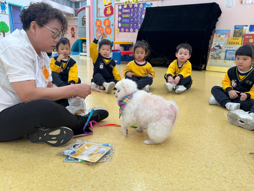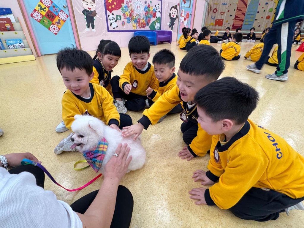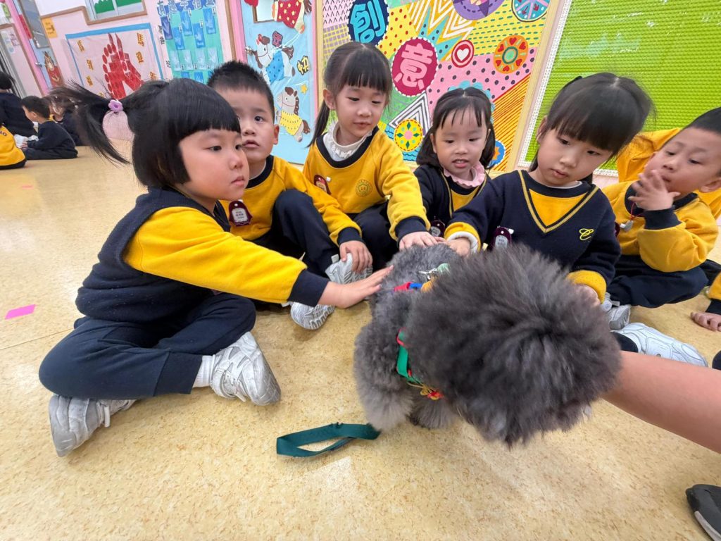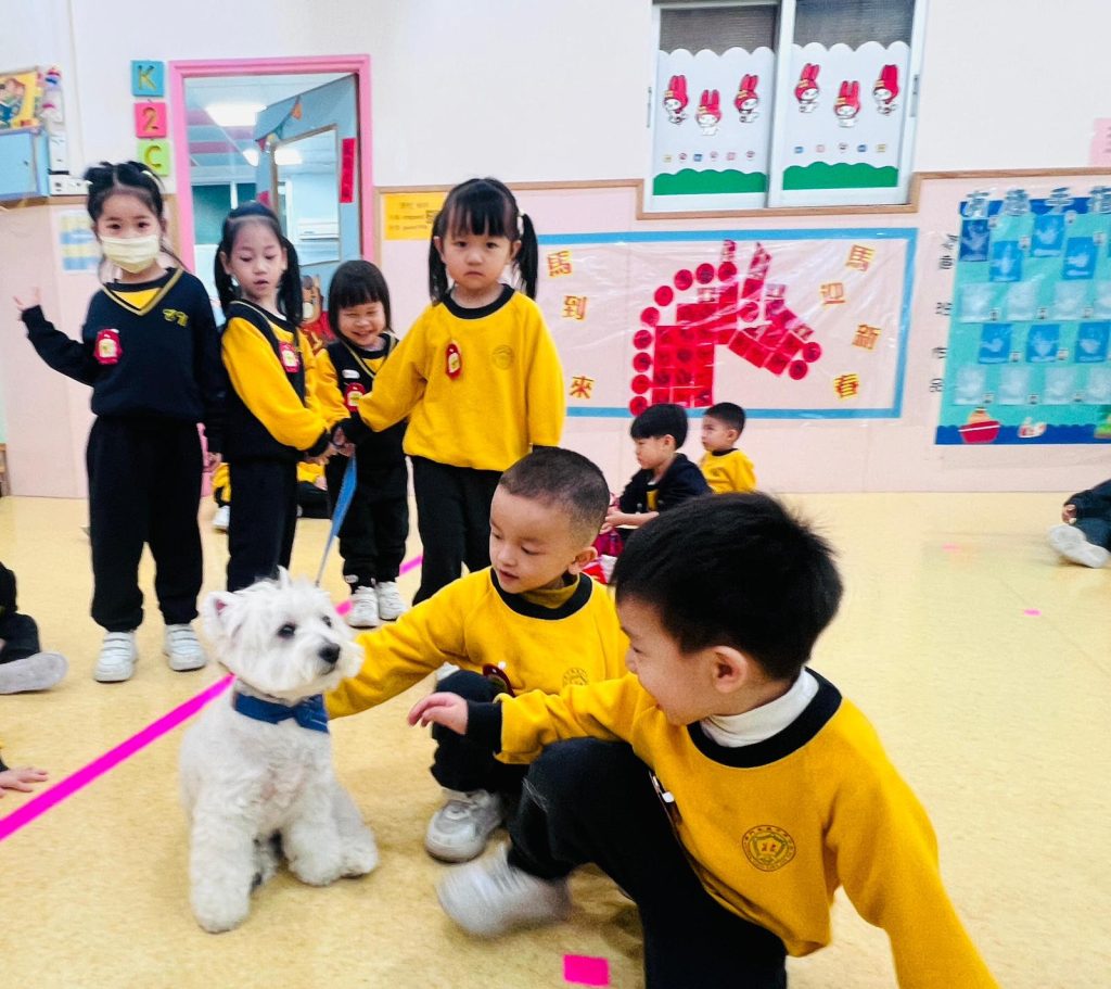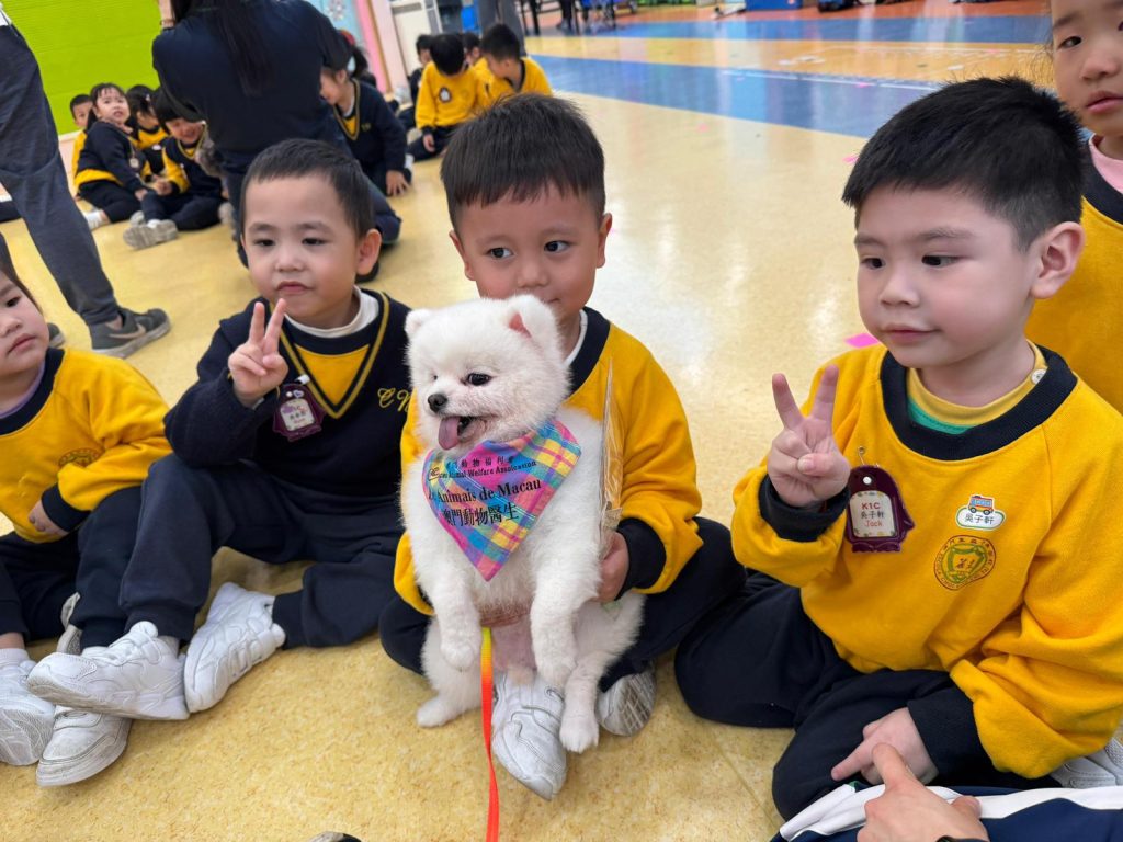 幼稚園(117威龍分校)邀請了澳門動物福利五隻狗醫生到校與K1小朋友互動。活動開始時,工作人員先向小朋友講解養狗的基本知識,包括如何照顧犬隻,以及怎樣與狗狗交朋友。這些知識不僅能幫助小朋友更好地理解犬隻的習性,也能培養他們對動物的尊重與愛心。
