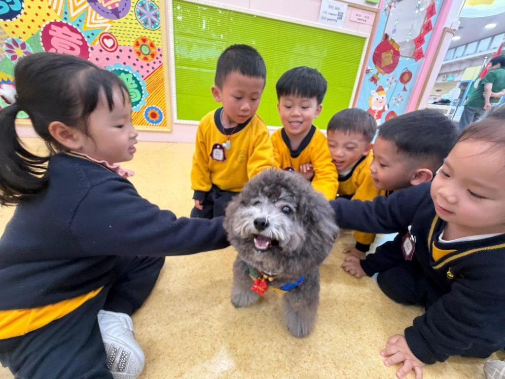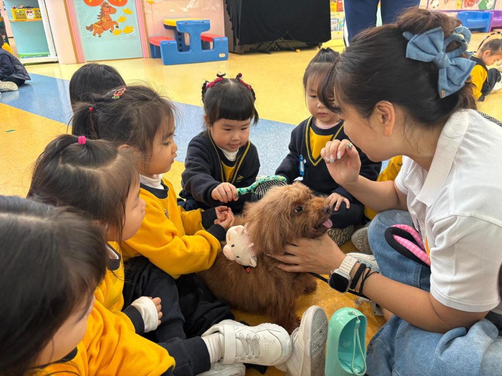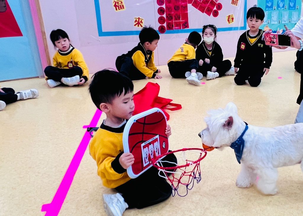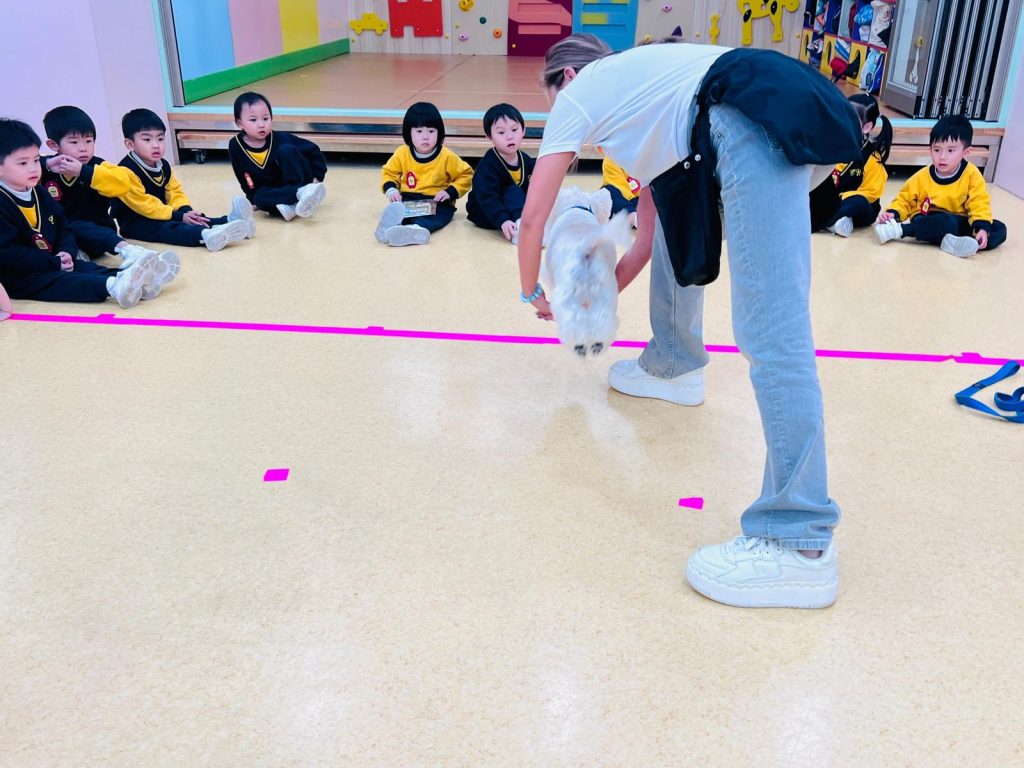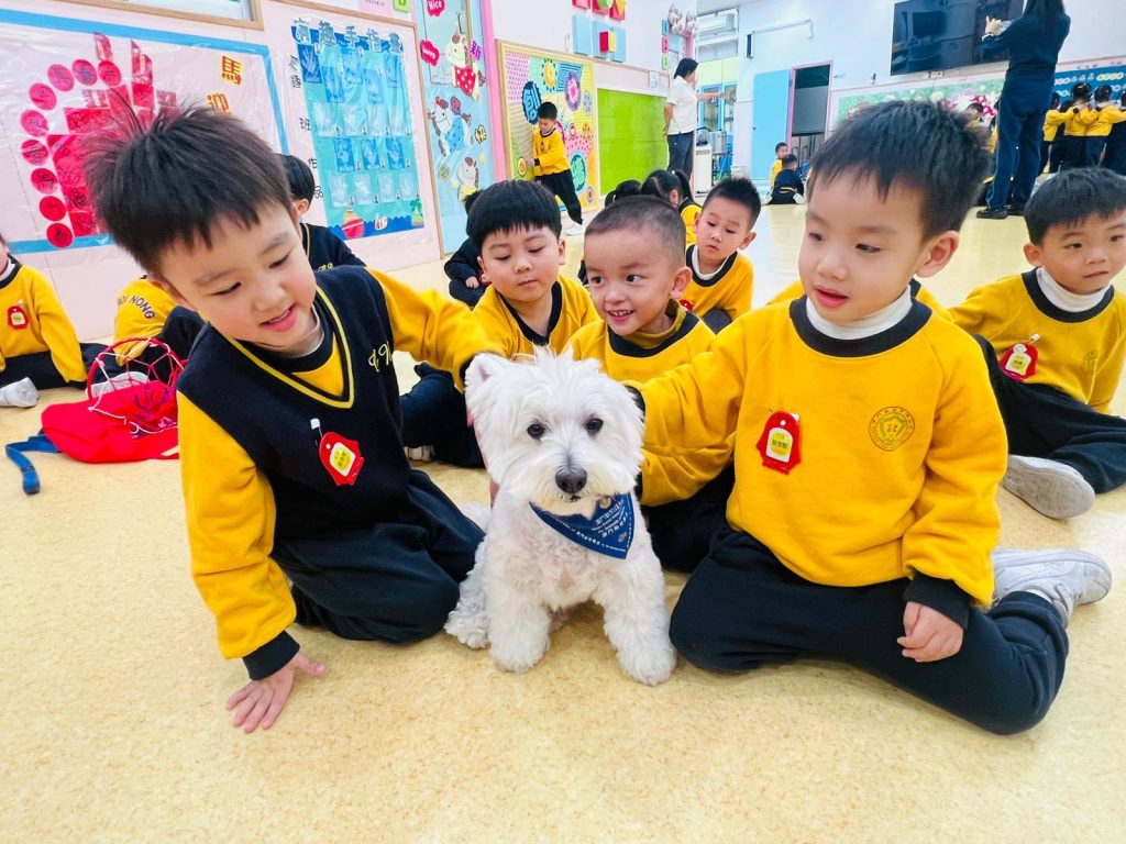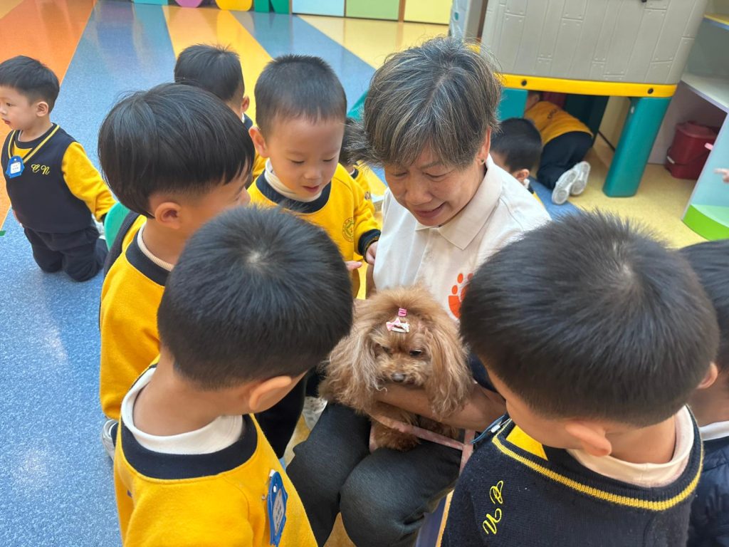 幼稚園(117威龍分校)邀請了澳門動物福利五隻狗醫生到校與K1小朋友互動。活動開始時,工作人員先向小朋友講解養狗的基本知識,包括如何照顧犬隻,以及怎樣與狗狗交朋友。這些知識不僅能幫助小朋友更好地理解犬隻的習性,也能培養他們對動物的尊重與愛心。