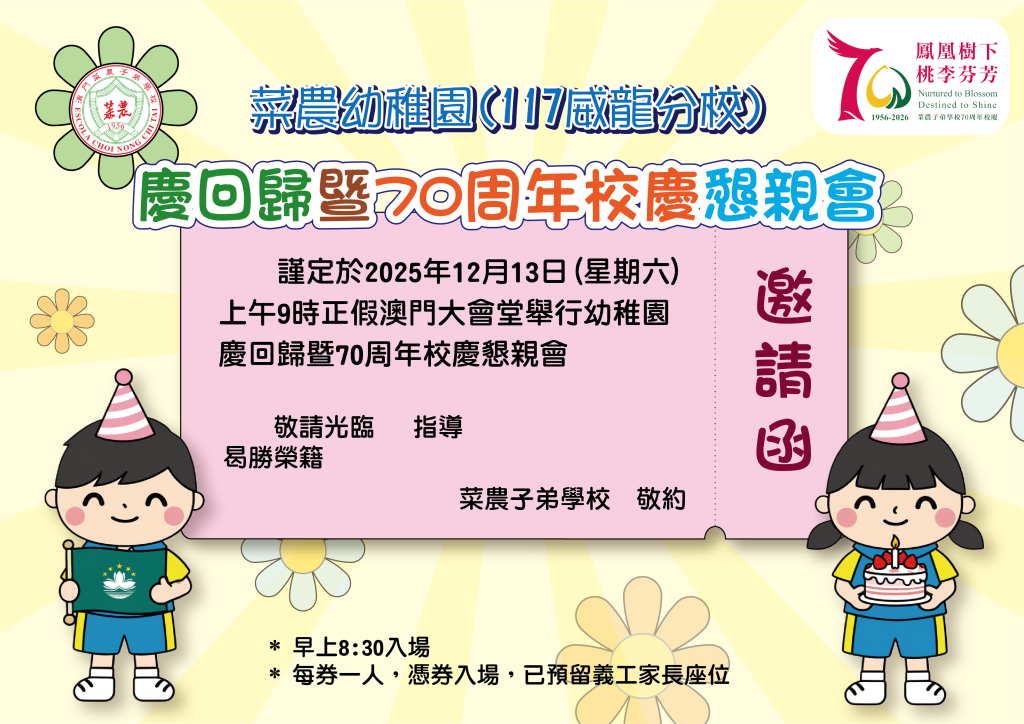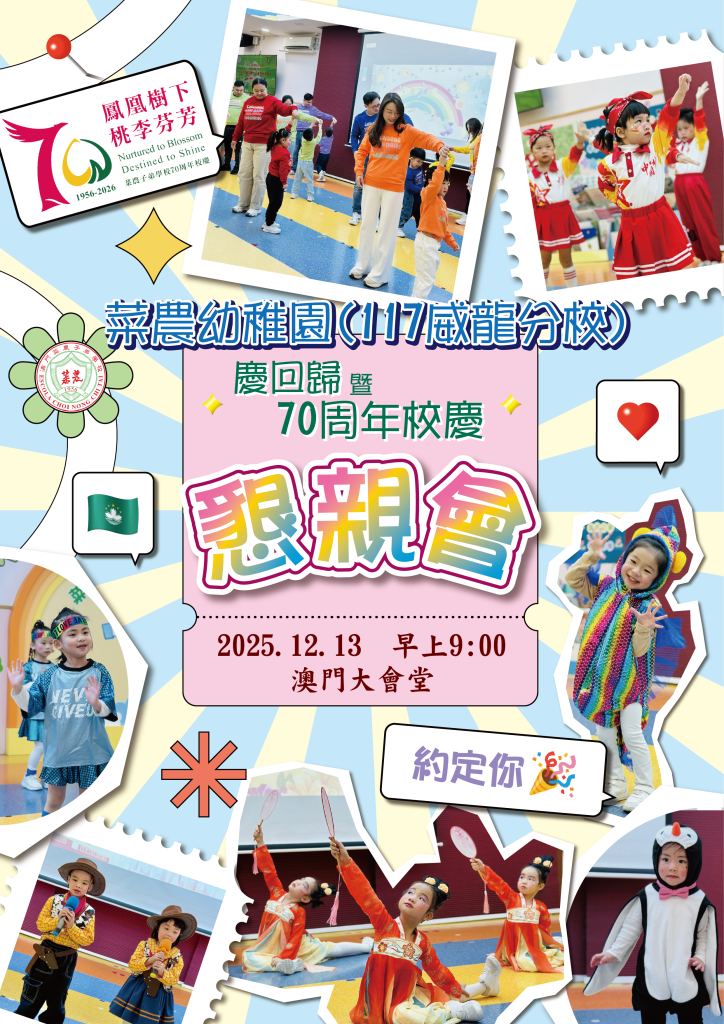 為慶祝澳門回歸祖國26周年,菜農子弟學校建校70周年,幼稚園(117威龍分校)將於12月13日本週六假澳門大會堂隆重舉辦懇親會盛典,孩子們的快樂將與您共同分享。我們誠摯邀請各位家長參與支持,見證孩子們的快樂童年!它將是您孩子人生之旅的第一個盛大典禮!