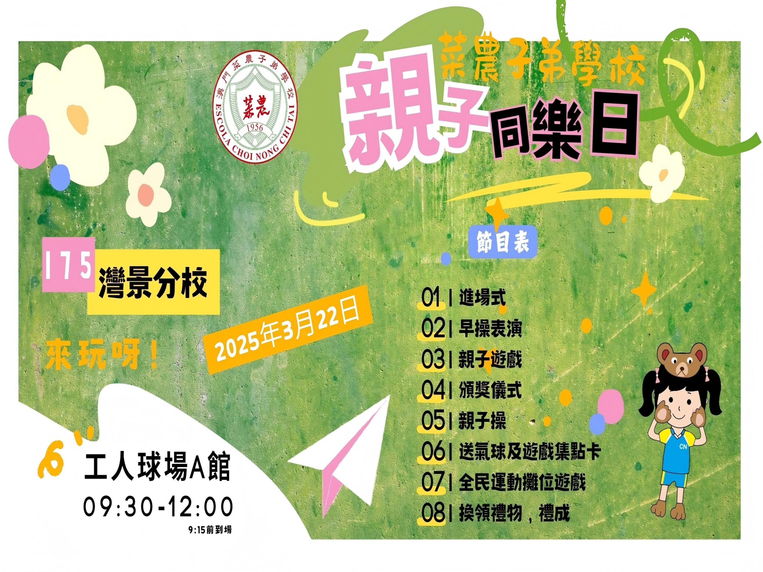 2024-2025學年 活動回顧Event Review 菜農子弟學校幼稚園(175灣景分校) K3級親子動起來,快樂迎全運 (附視頻) 菜農子弟學校幼稚園(175灣景分校 ) K2級舉行「小小全能運動會」 菜農子弟學校幼稚園(175灣景分校)K1 級小小運動會,樂享運動 (附視頻) 菜農子弟學校幼稚園(175灣景分校) K2幼兒暢遊大賽車博物館,探索速度與激情(附視頻) 菜農子弟學校幼稚園(175灣景分校 )K2級與風共舞的遊戲 菜農子弟幼稚園(175灣景分校) 活力親子向大家介紹「全運會」 菜農幼稚園(175灣景分校)K3級健康小偵探的「油分大發現」之旅(附視頻) 菜農子弟幼稚園(175灣景分校)K1級:飛吧!我的小蜻蜓 菜農子弟幼稚園(175灣景分校)K3級探秘食品添加劑的奧秘 菜農子弟幼稚園(175灣景分校)K3級「CN Food Festival」熱情登場(附視頻) 菜農子弟幼稚園(175灣景分校)K1級英語動感活動—「Go and Stop!」 菜農子弟幼稚園(175灣景分校 )K2級英文週活動——Let’s Feel Our Feelings 菜農子弟幼稚園(175灣景分校)「悠揚樂韻在灣景」澳門中樂團走進校園,讓K3級小朋友共賞國樂之美 菜農子弟幼稚園(175灣景分校)「識重陽·學敬老」 菜農子弟幼稚園(175灣景分校) 守護健康 — 流感疫苗接種日 菜農子弟幼稚園(175灣景分校)響應環保,回收月餅盒好EASY 菜農子弟幼稚園(175灣景分校)K1級遊戲:好玩的「紙」球 菜農子弟幼稚園(175灣景分校)趣學科技,智啟未來 菜農子弟幼稚園(175灣景分校) 親子活動《兔籽手偶劇場》,讓孩子在快樂中學會保護自己 菜農子弟幼稚園(175灣景分校)提提你:關於預防流感及”雙熱”的小貼士 菜農子弟幼稚園(175灣景分校)K1級小朋友的「紙杯電話」千里傳音 菜農子弟幼稚園(175灣景分校)「陽光相伴,歡笑相隨」K3級修業旅行 菜農子弟幼稚園(175灣景分校)K2級透過《超神奇便便》布偶劇,學習健康知識 菜農子弟幼稚園(175灣景分校)書香伴隨晨操,健康與知識同行 菜農子弟幼稚園(175灣景分校)K3級在「塞吉・布洛克」展覽中探索線條中的魔法 菜農子弟幼稚園(175灣景分校)K3級舉辦“惜食慳電愛地球”環保講座 菜農子弟幼稚園(175灣景分校)小小善舉為獨居老人送暖 幼稚園(175灣景分校)親子攜手參與「家校一心」社區活動 展現活力與溫情 幼稚園(175灣景分校) 活力新篇章!外教Miss Angelique為英語課堂注入新活力 幼稚園(175灣景分校)家長想要提升幼兒認知發展? 學生輔導員話您知,可以從生活自理開始! 幼稚園(175灣景分校)K3級本土陶瓷藝術初體驗 幼稚園(175灣景分校)K3級小朋友「月滿灣景,童聚中秋」慶祝活動 幼稚園(175灣景分校)K1級中秋節活動:月光下的快樂慶典 幼稚園(175灣景校部)K2級歡慶中秋佳節,共度溫馨時光 幼稚園(175灣景分校)K3級「小手築長城」安吉遊戲:玩出愛國心與創造力 幼稚園(175灣景分校)治安警儀仗隊到校演示升旗儀式深化師生國家認同 菜農子弟學校幼稚園(175灣景分校)與國同慶精彩生日會 菜農子弟學校幼稚園(175灣景分校) 歡度國慶,童心頌祖國 幼稚園(175灣景分校)健康促進活動之量度身高及體重監測成長 幼稚園(175灣景分校)K3級探索傳統與科學的奇妙連結 幼稚園(175灣景分校)K3幼兒前往「哈樂健康教育中心」展開健康探索之旅 幼稚園(175灣景分校)K2級探索有趣的非牛頓流體的秘密 幼稚園(175灣景分校)K1 小朋友透過建構玩具釋放無限潛能 幼稚園(175灣景分校) K3級小朋友校園生活多姿多彩 幼稚園(175灣景分校)學生在“童心繪夢” 活動中表現優秀 幼稚園(175灣景分校) 週六開展潛能發展班發掘孩子潛能 幼稚園(175灣景分校) 在「大唐杯」全國硬筆書法篆刻大賽中榮獲佳績 幼稚園(175灣景分校)K2級校園生活探秘 幼稚園(175灣景分校)K1級教師節「以愛育愛,溫暖相擁」 幼稚園(175灣景分校)K2級教師節「溫馨致謝,感恩有您!」 幼稚園(175灣景分校)K3級「畫筆繪愛,謝師恩」 幼稚園(175灣景分校)童心共頌和平——紀念抗戰勝利80週年活動 幼稚園(175灣景分校)「快樂午餐,健康成長」午餐時光全記錄(附視頻) 幼稚園(175灣景分校)K1級新生快樂適應校園生活 幼稚園 (175灣景分校) 從小根植愛國心,看閱兵,感受中國力量(附視頻) 幼稚園(175灣景分校)快樂開學日(附視頻) 幼稚園(175灣景分校)家長會圓滿舉行 攜手迎接新學年 幼稚園(175灣景分校)校園身心健康周-運動鍛鍊篇(附視頻) 幼稚園(175灣景分校)學生於「童心添色彩」世遺景點創意填色繪畫比賽榮獲佳績 幼稚園(175灣景分校)「家校同心,歡慶校慶」賀校慶親子視頻比賽結果公佈(附視頻) 幼稚園(175灣景分校)K2級steam小實驗—-吹出個彩虹(附視頻) 幼稚園(175灣景分校)K3級親子的神奇劇場之旅(附視頻) 幼稚園(175灣景分校)K1級到二龍喉公園親親大自然(附視頻) 幼稚園(175灣景分校)一日一杯奶,健康跟着我(附視頻) 幼稚園(175灣景分校)Learning About Weather With Miss Lara( 幼稚園(175灣景分校)K2級參觀海事博物館—探索澳門的漁業歷史 (附視頻) 幼稚園(175灣景分校)「爸」氣十足,愛在當「夏」(附視頻) 幼稚園(175灣景分校)K2級爸爸人體遊樂場挑戰賽 (附視頻) 幼稚園(175灣景分校)K1級父親節活動–「親親我好爸」(附視頻) 幼稚園(175灣景分校)學生輔導員為K3學生進行「我是情緒小主人」班級輔導活動(附視頻) 幼稚園(175灣景分校)舉行六項嘉許禮 幼稚園(175灣景分校)一起暢遊「夢幻花園」(附視頻) 幼稚園(175灣景分校)參與 “感恩有您”兒童填色繪畫比賽奪得優異成績
