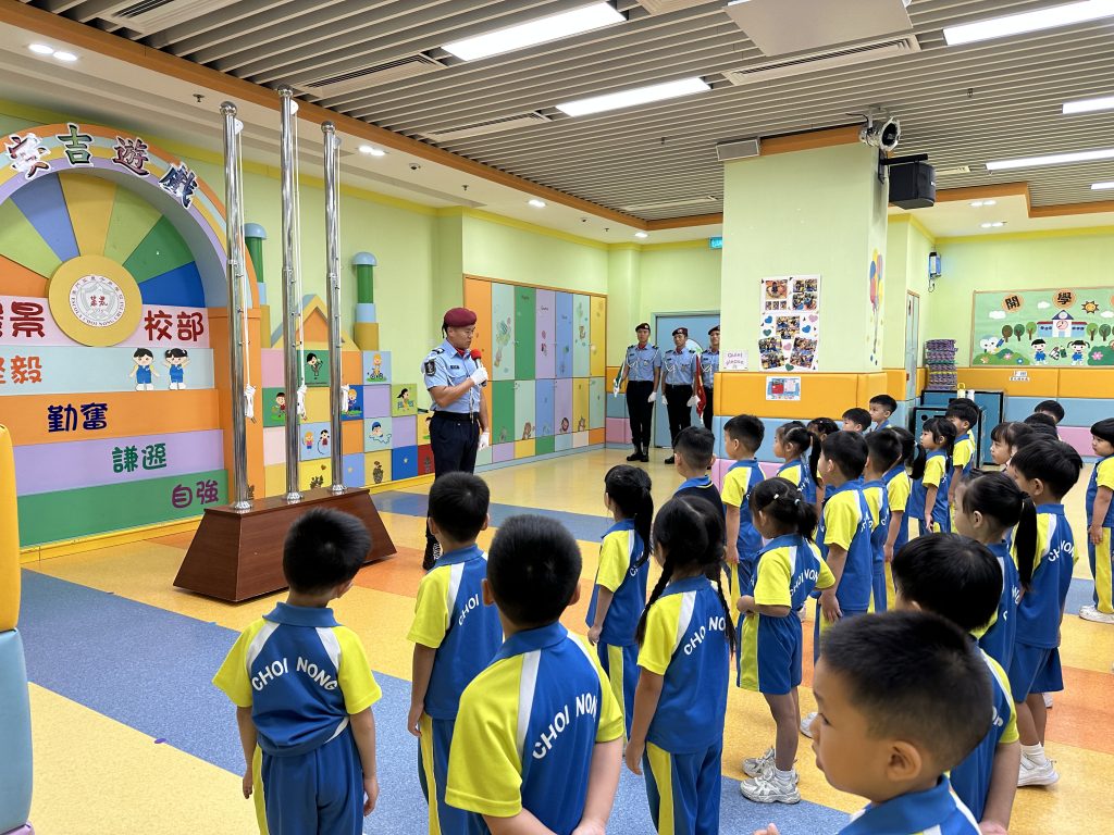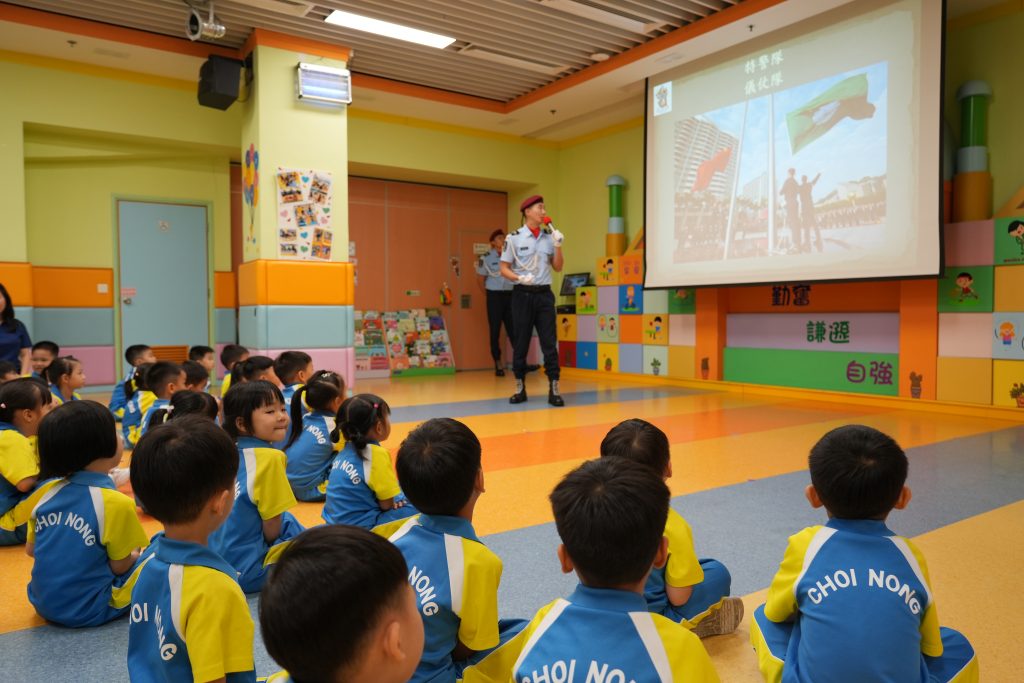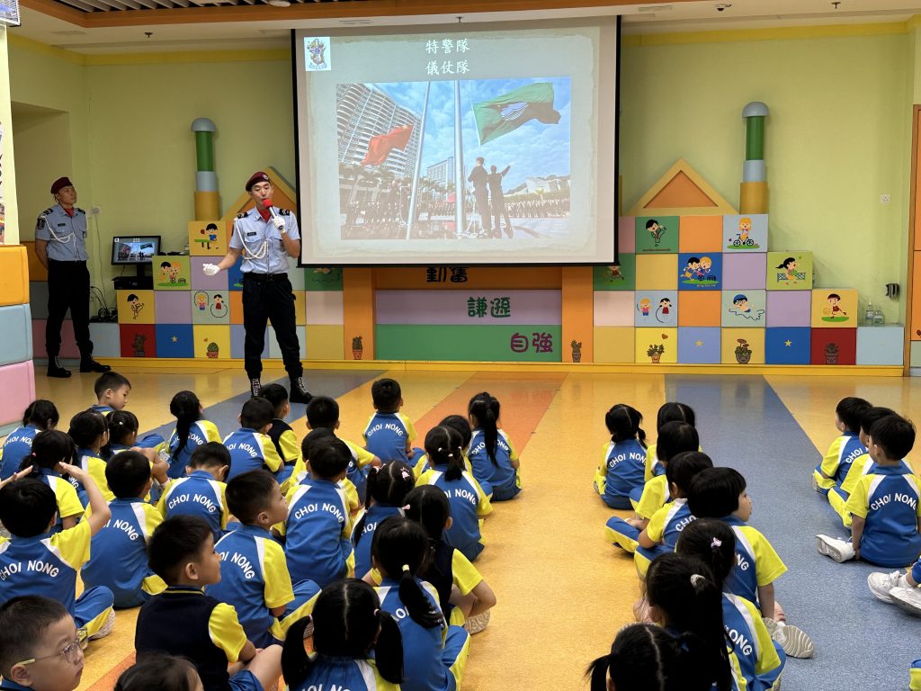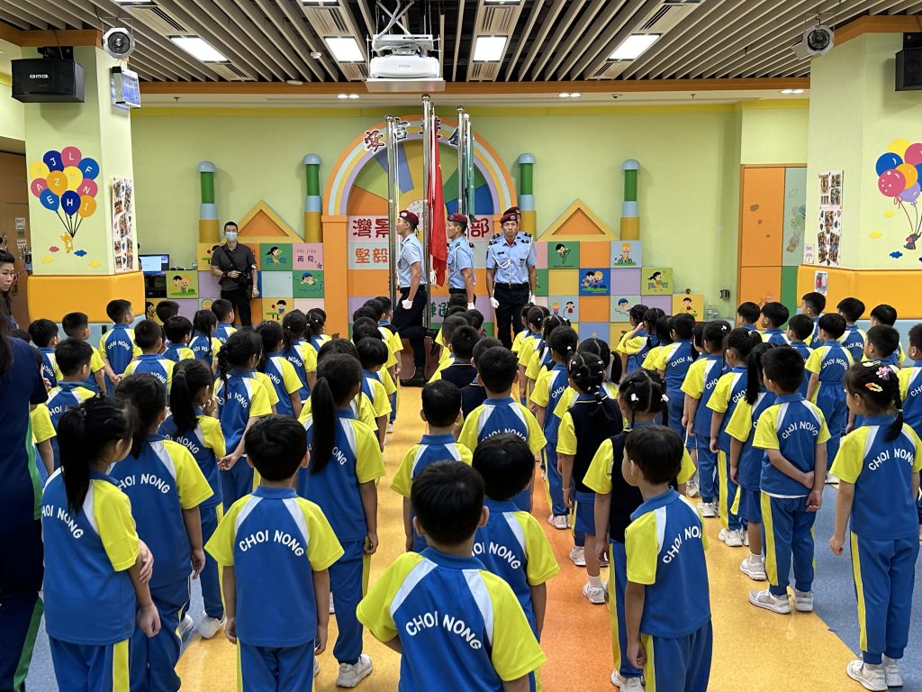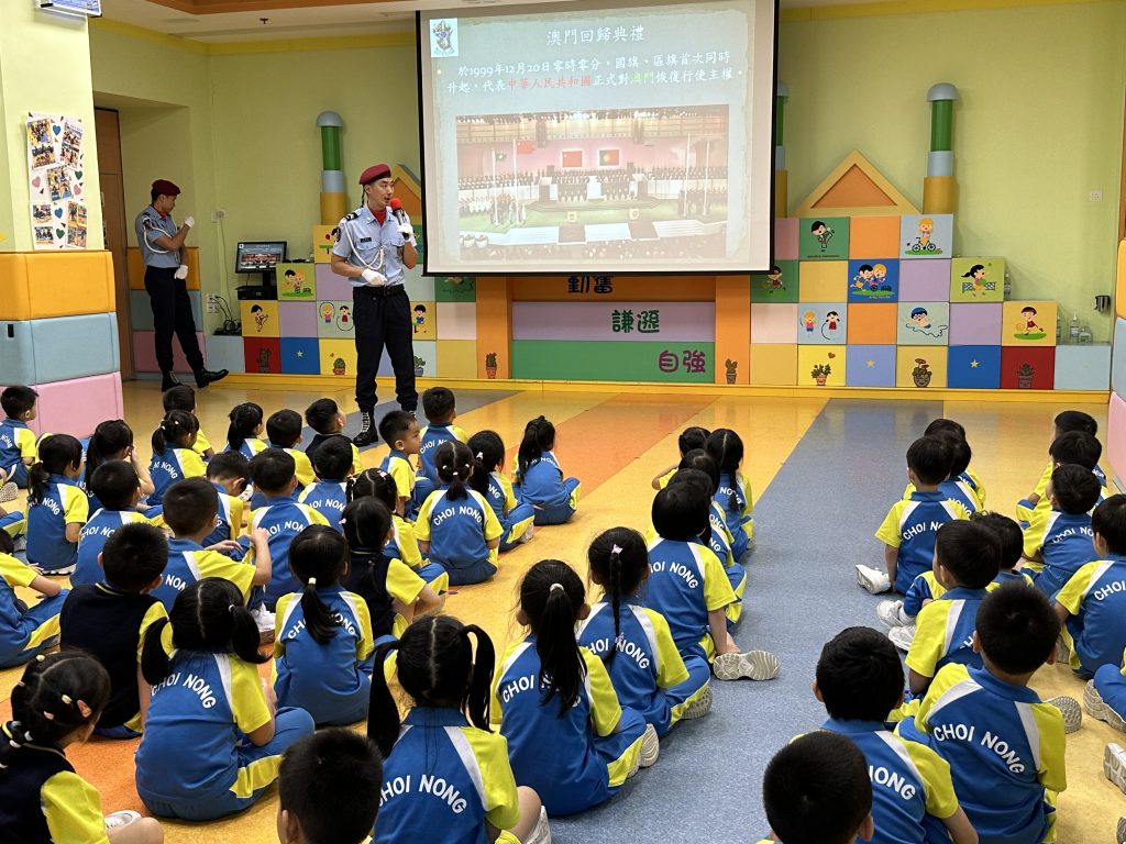 適逢國慶節,為了加強小朋友對國家、國旗的認識,幼稚園(175灣景分校)近日邀請治安警察局特警儀仗隊蒞臨學校,進行升旗儀式演示。只見,儀仗隊隊員英姿颯爽,在統一指令下護送中華人民共和國國旗及澳門特別行政區區旗進場。隨後,在莊嚴的國歌聲中,旗手將旗幟揚起,向國家及澳門特區表達崇高敬意,過程莊重肅穆。