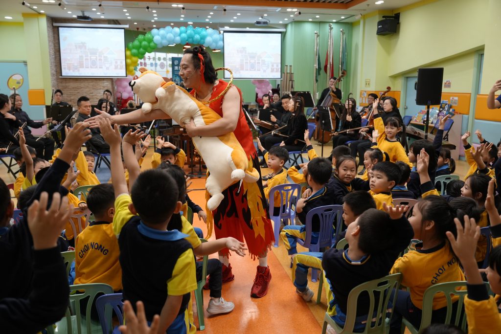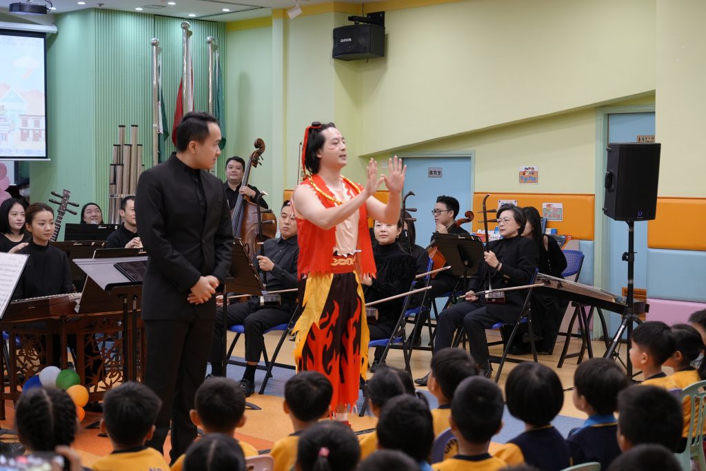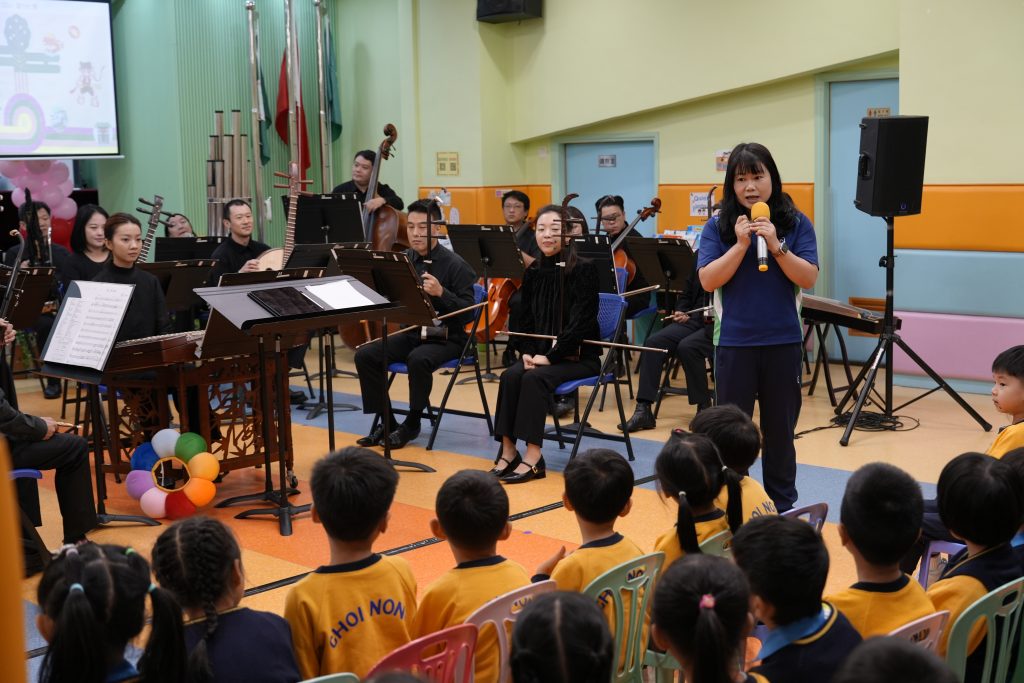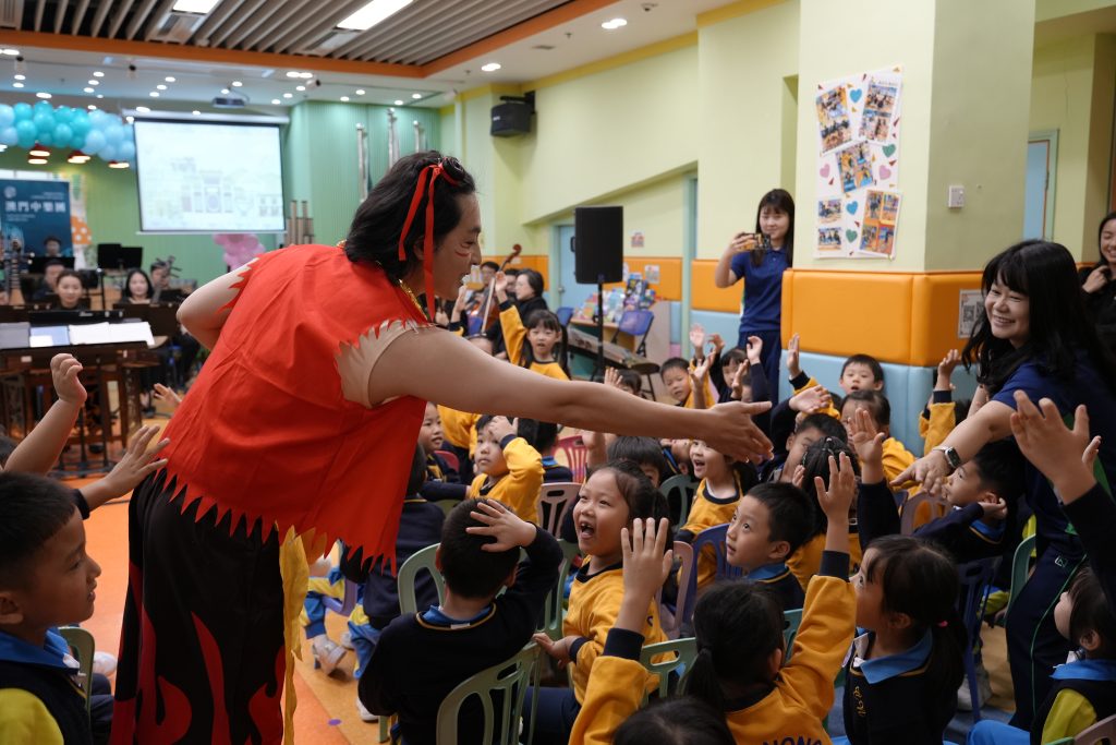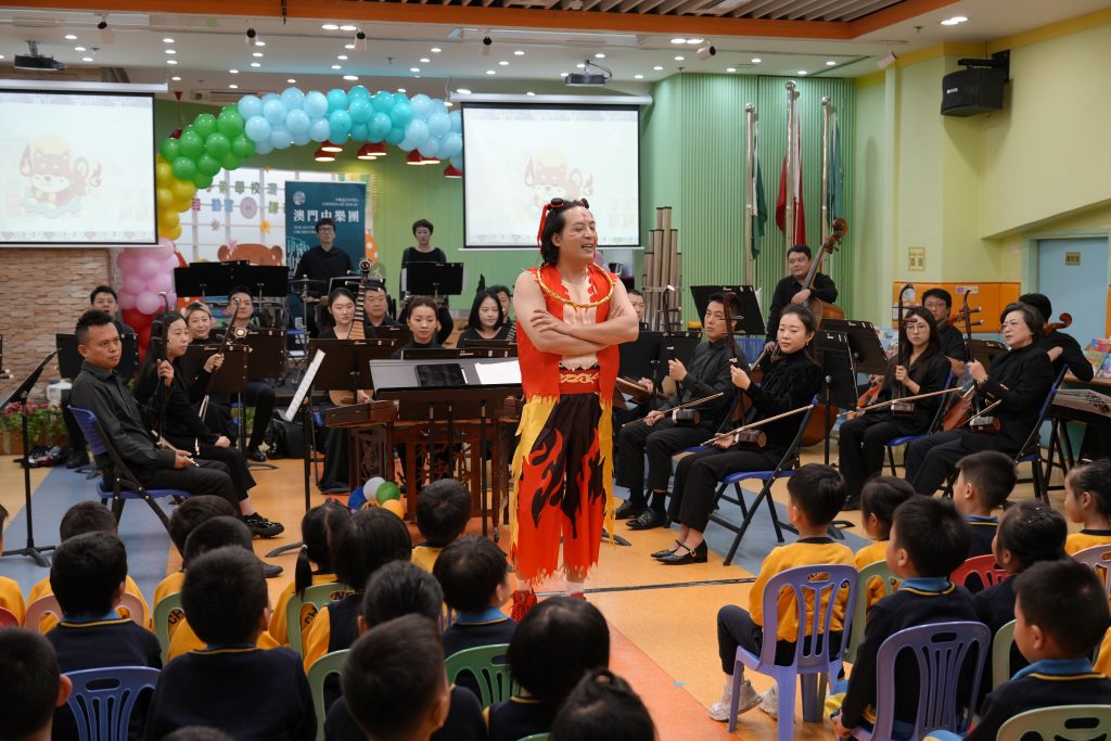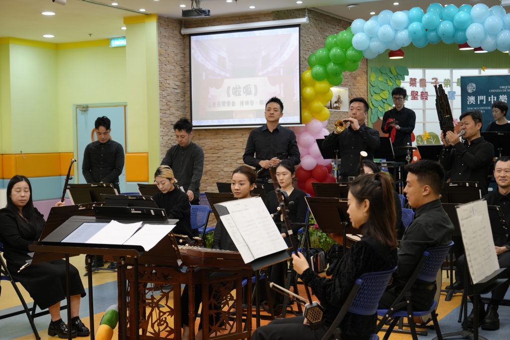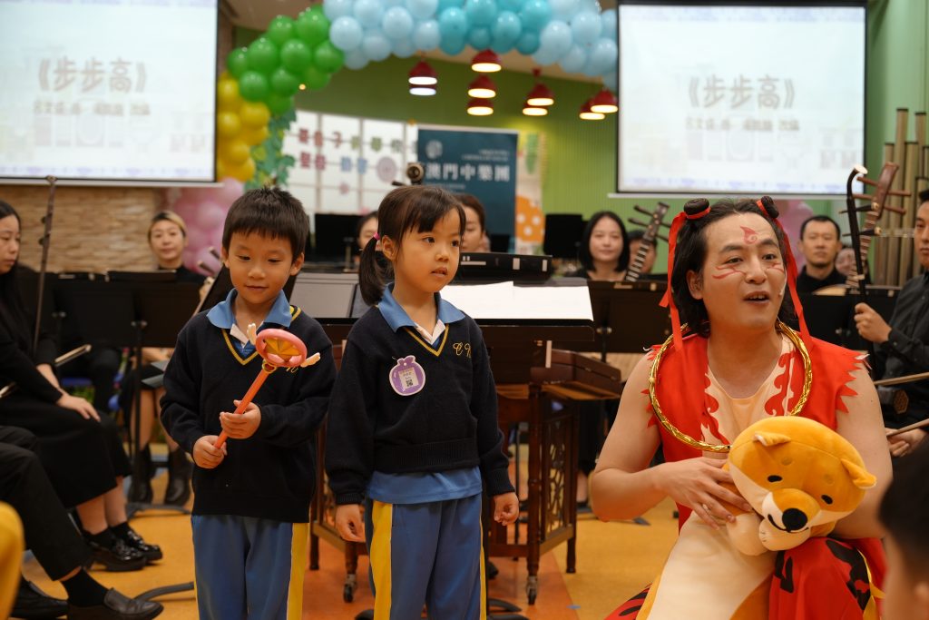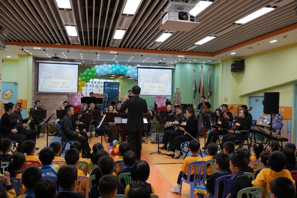 當天,澳門中樂團為師生演奏了多首風格各異的經典與現代樂曲,包括活潑輕快的《崖上的波兒》、節奏鮮明的《啦呱》、氣勢奔放的《賽馬》、耳熟能詳的《多啦A夢》、充滿童趣的《Old MacDonald Had a Farm》,以及喜慶歡騰的《步步高》。每首樂曲不僅展現了中樂豐富的表現力,更引導小朋友認識中樂的四大分類:吹管、彈撥、打擊與拉弦樂器。小朋友對中樂表現出濃厚興趣,不僅專注聆聽,更不時隨著旋律打拍子、互動回應,現場氣氛溫馨熱烈。