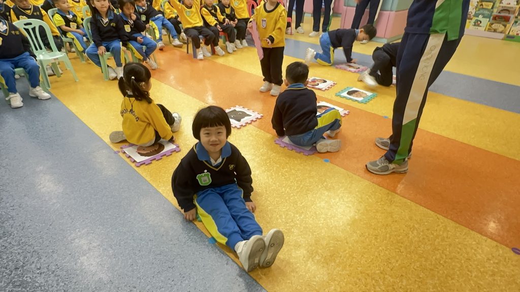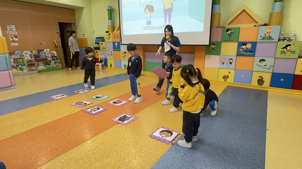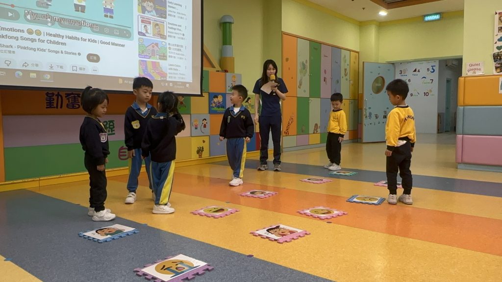隨著 “Hello Song” 開場熱身,接著觀看影片片段並學說英語句子,如 “I am happy!”、“I am sad.” 等。最受歡迎的「Feelings Musical Mats」遊戲中,幼兒們邊跳舞邊搶墊子,用肢體表現不同情緒。活動最後以「smell the flower, blow the candles」的呼吸練習收尾,讓幼兒在快樂與放鬆中學會表達感受。