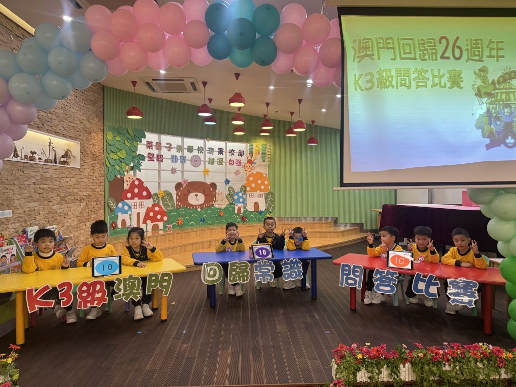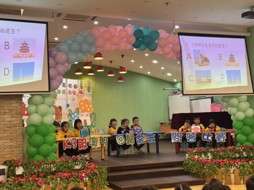 適逢今年是澳門回歸26週年,為深化學生的愛國愛澳情懷,增進對澳門回歸歷程的認識,幼稚園(灣景校部)K3級近日舉辦了一場別開生面的「慶回歸」知識問答比賽。活動以寓教於樂為宗旨,比賽分為單選題和多選題兩個環節,題目內容涵蓋了澳門的地理、名勝古蹟以及回歸祖國的基礎常識,引導孩子們在輕鬆愉快的氛圍中學習思考,多角度理解家國觀念。