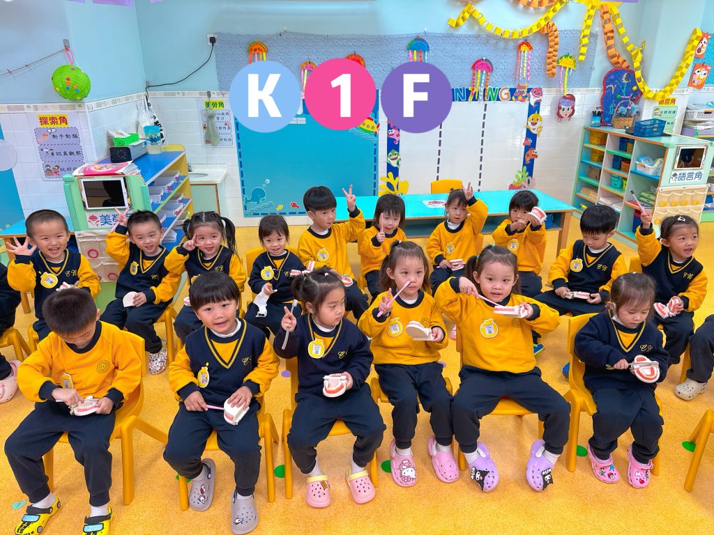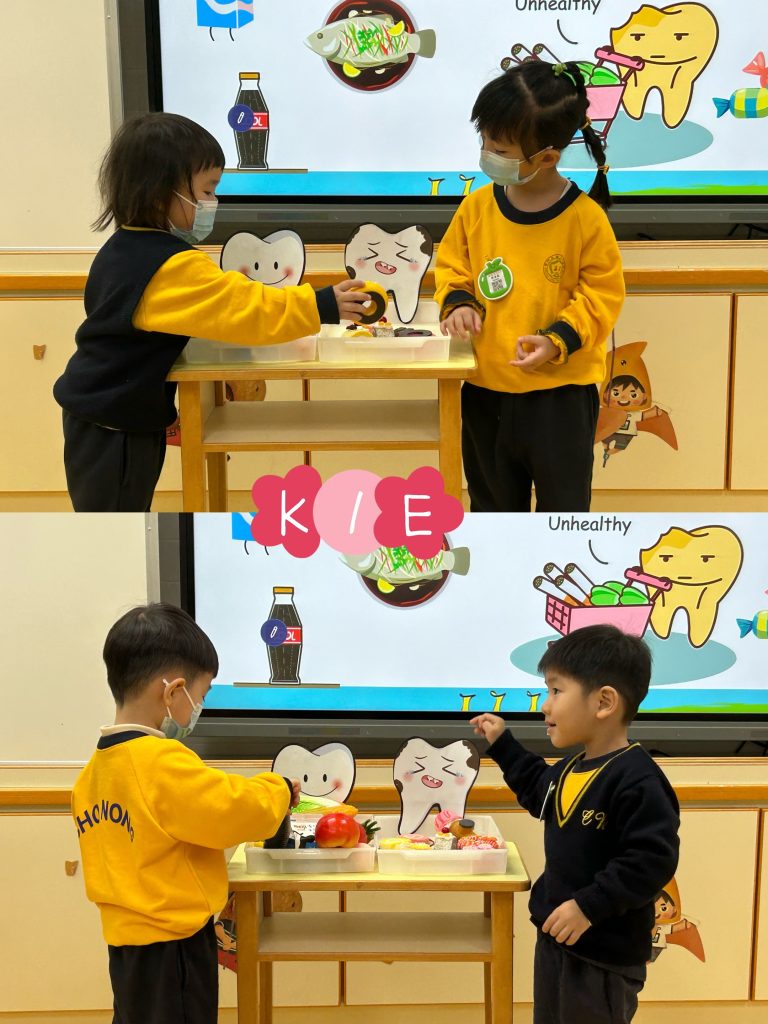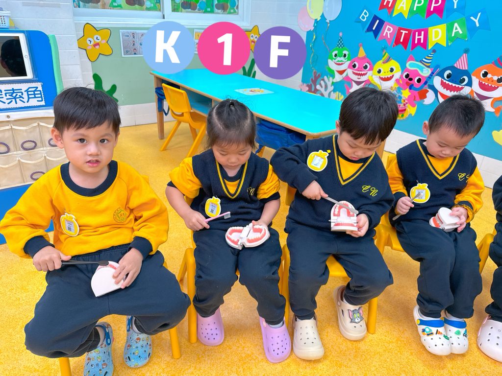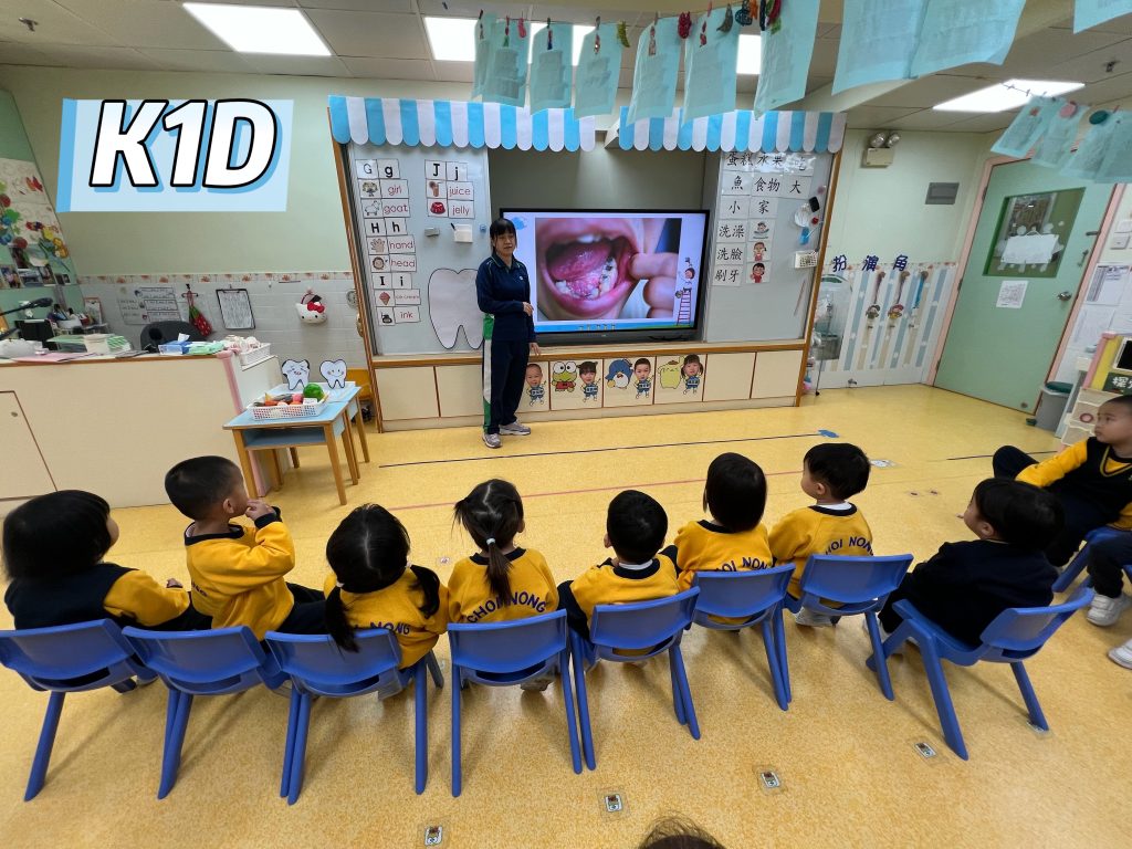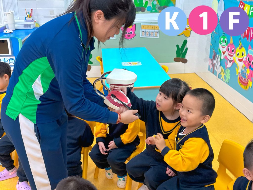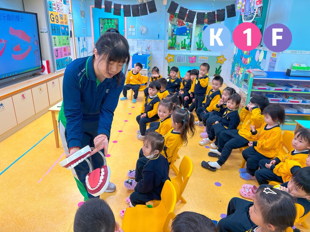 幼稚園(175灣景分校)K1級教學主題《獅子大王愛乾淨》的延伸活動,邀請到本校健康促進員—何姑娘舉辦愛護牙齒講座。講座透過活動學習的模式,讓小朋友認識牙齒的結構,並透過食物分類遊戲,分辨哪些是牙齒的「好朋友」與「大壞蛋」,其後何姑娘與小朋友示範「貝氏刷牙法」,借用牙齒模型與小朋友進行練習,以加強他們對正確刷牙方法的認知及培養小朋友良好的口腔衛生保健意識,齊齊做個「潔牙小勇士」!