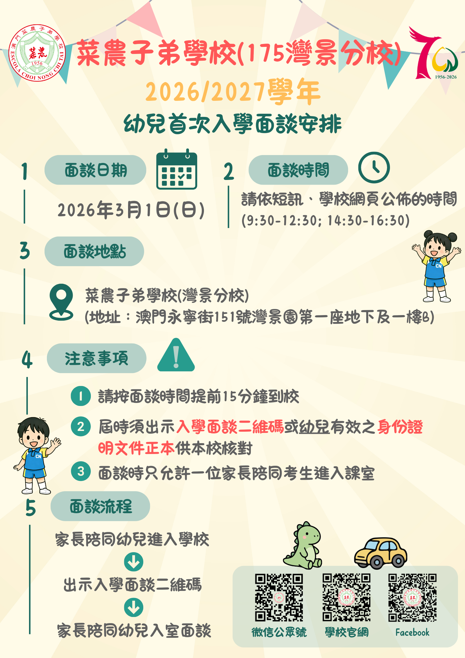 2026/2027學年 幼兒首次入學面談安排作者: 菜農子弟學校 / 2026 年 1 月 21 日 面談注意事項: 1.面談當天,請由一位家長陪同報名幼兒,並攜帶其身份證正本或教青局面談二維碼,於面談時間前15分鐘到達本校幼稚園(175灣景分校)進行面談。本校已為該生備妥報名表。 首次入學面談查詢系統 (請掃描QRcode): 2.聯絡方式:幼稚園(175灣景分校)地址:澳門永寧街151號灣景園第一座地下及一樓B(2、6A、19號巴士總站)電話:2842 0441 傳真:2842 1094辦公時間:周一至五上午9:00-12:00 下午2:30-4:30 學校微信公眾號: 前往菜農子弟學校(175灣景分校)路線圖