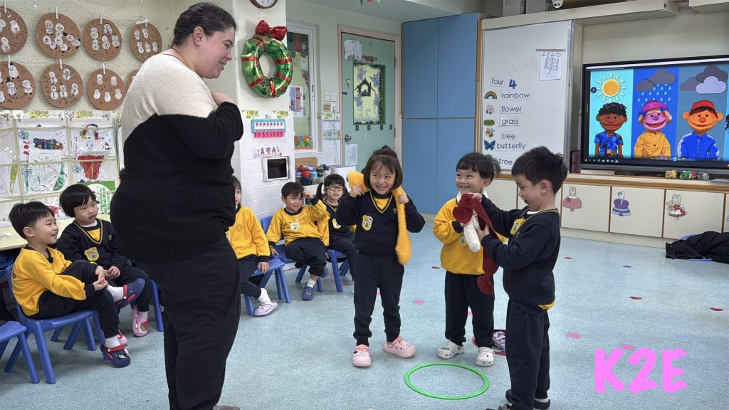 課堂圍繞冬季日常生活,幼兒在外教帶領下學習 scarf、coat、gloves、hat 等衣物詞彙。透過實物觀察、圖片對應、動作模仿與簡單問答,孩子們在自然情境中提升英語聆聽與口語表達能力。