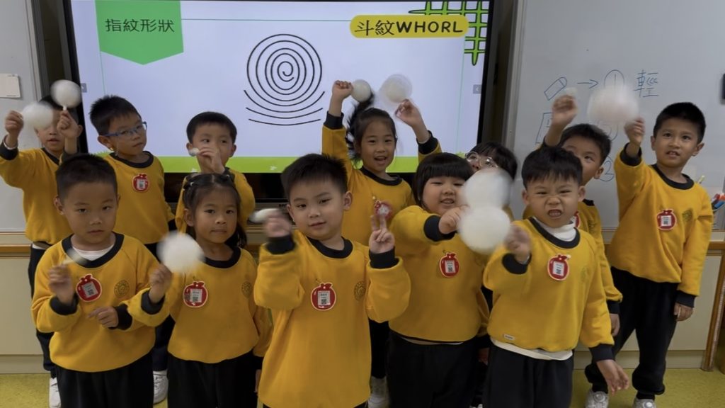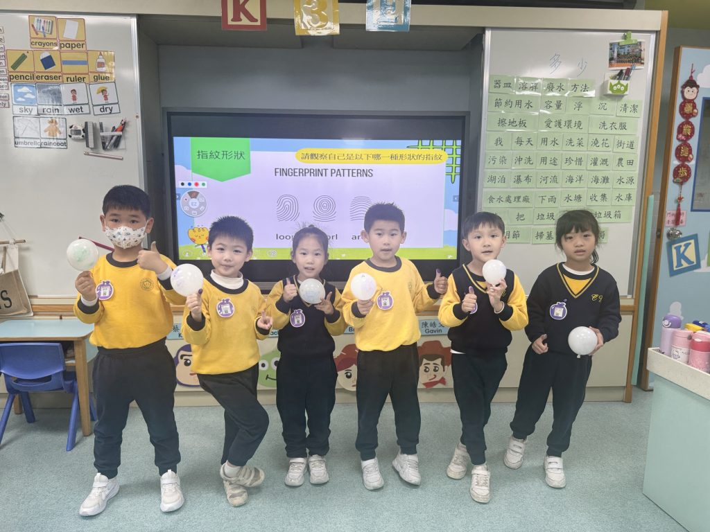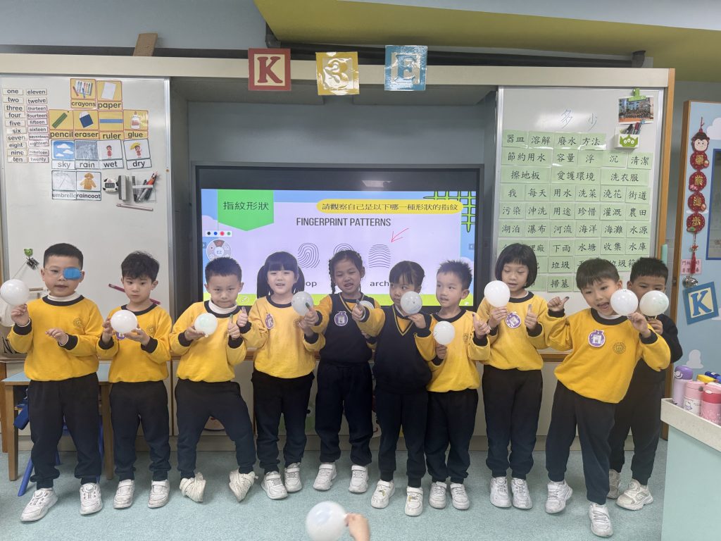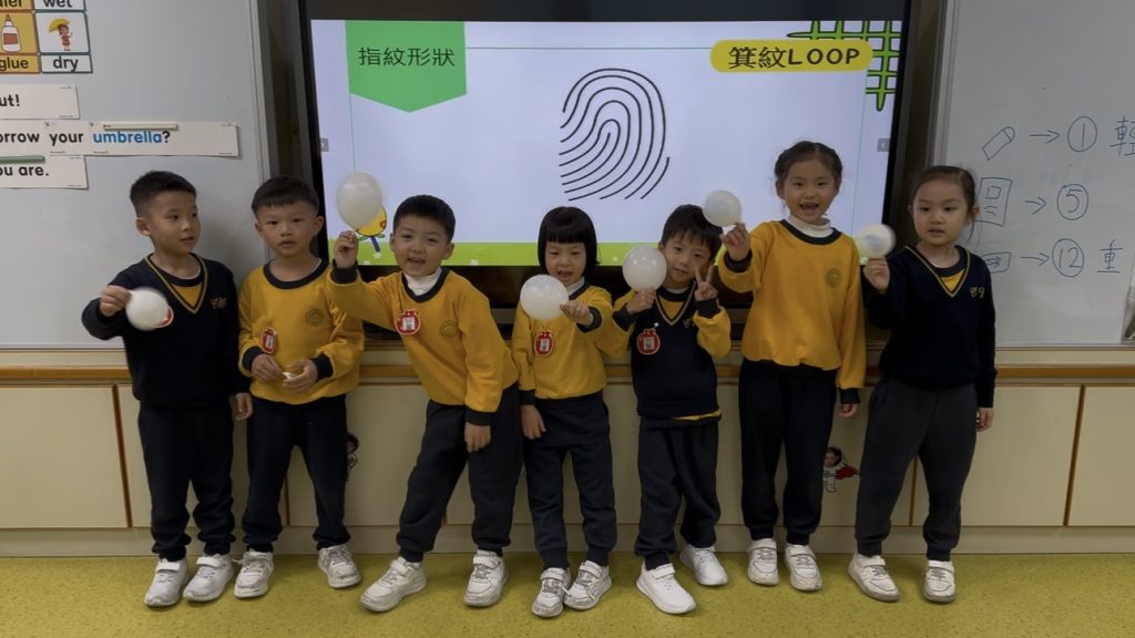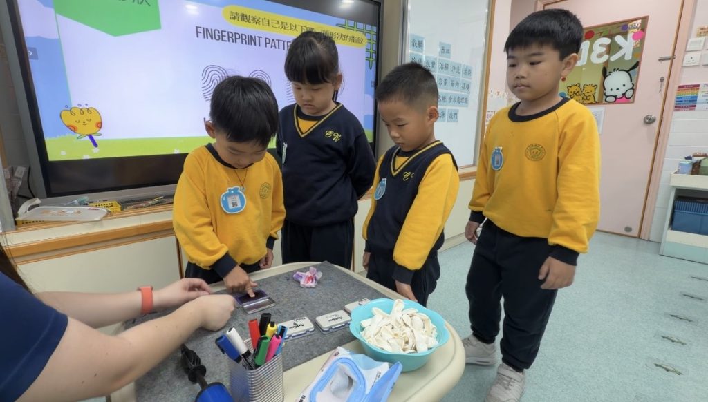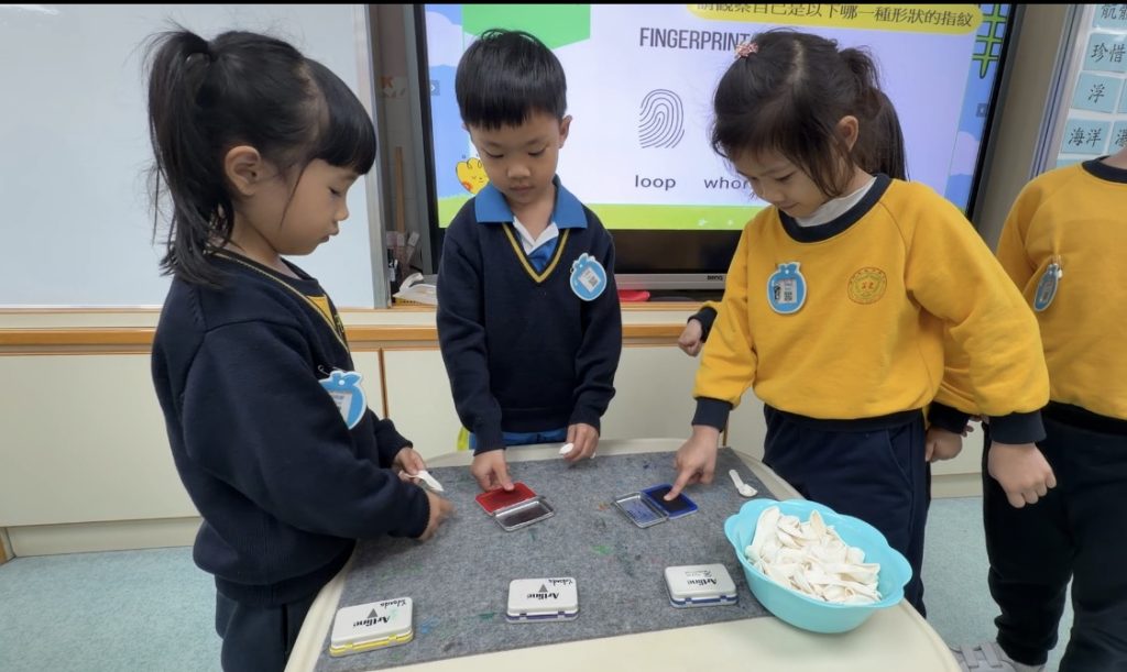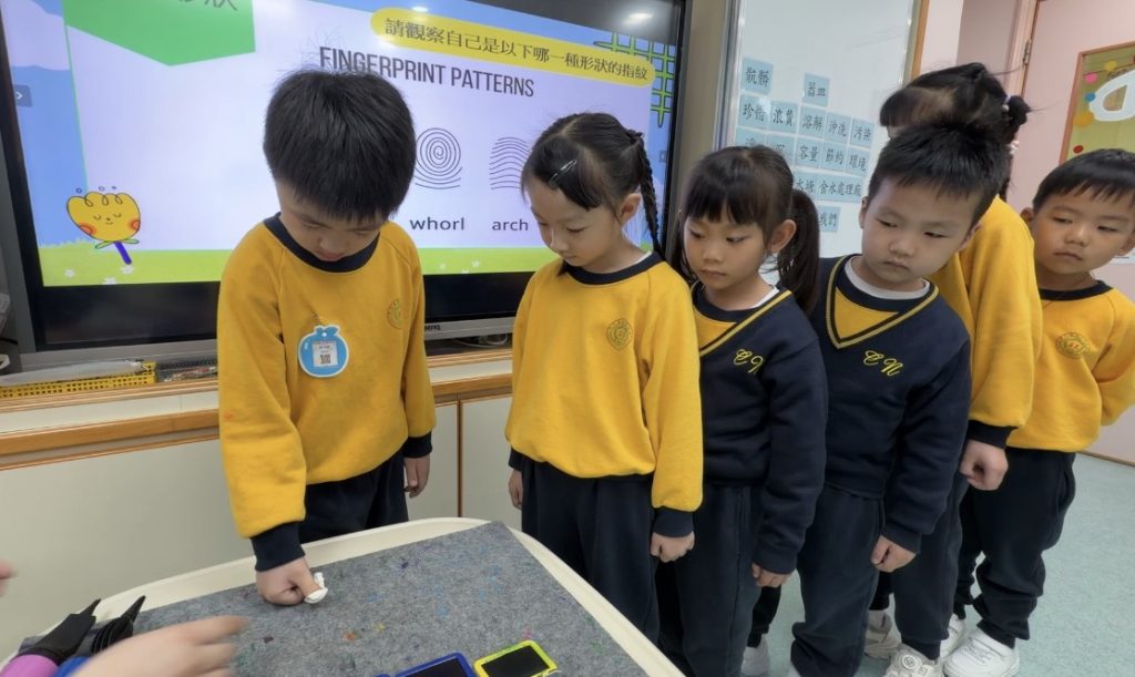 幼稚園(175灣景分校)K3級幼兒開展了有趣的常識活動——「指紋的秘密」。首先,老師給幼兒介紹了什麼是指紋,探討了指紋的作用,幼兒亦發現到每個人的指紋都是獨一無二的。
