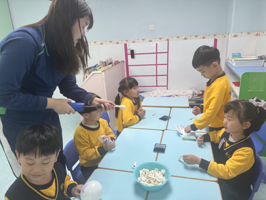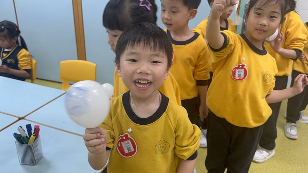 指紋很小很密,要怎样才能清楚看到指紋的紋路呢?幼兒在氣球上印上自己的指紋,然後將氣球吹大,這樣便可以清楚觀察自己的指紋特徵。