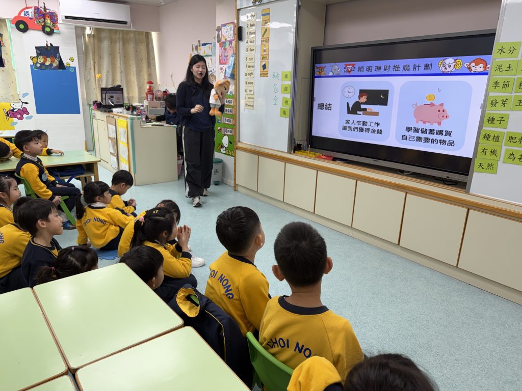 澳門基督教青年會(YMCA)走進校園,進入K3級課室,進行精明理財的推廣教育。社工哥哥首先分享繪本《我家有棵願望樹》,然後與小朋友進行互動討論,讓小朋友明白獲得金錢的背後其實是父母辛勤工作的付出,亦讓小朋友了解及建立良好儲蓄習慣的好處。 透過是次活動,我們期望讓小朋友明白金錢來之不易,購買東西之前要思考清楚該東西是否需要,並培養儲蓄的習慣。
