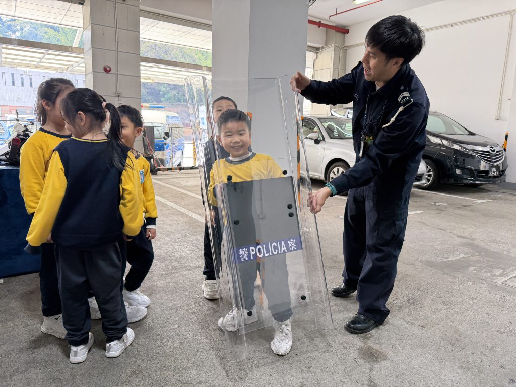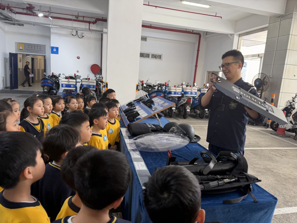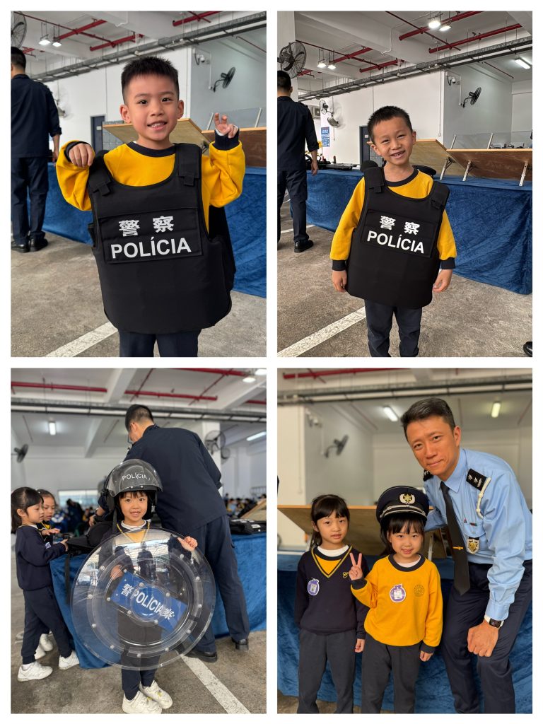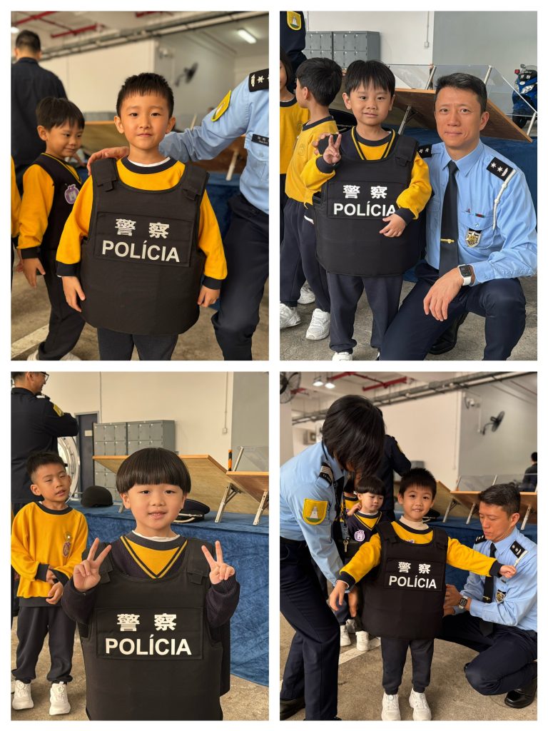 在警察局內,警員耐心地向小朋友介紹治安警察的日常工作與各分區警務職能,並在問答互動中分享警務知識。小朋友有機會近距離認識警棍、對講機及防彈衣等專業裝備,更親身穿戴體驗,感受警員的英勇。在警車與電單車前,小朋友換上小警服,威風凜凜地坐上警務玩具車合影,架勢十足!