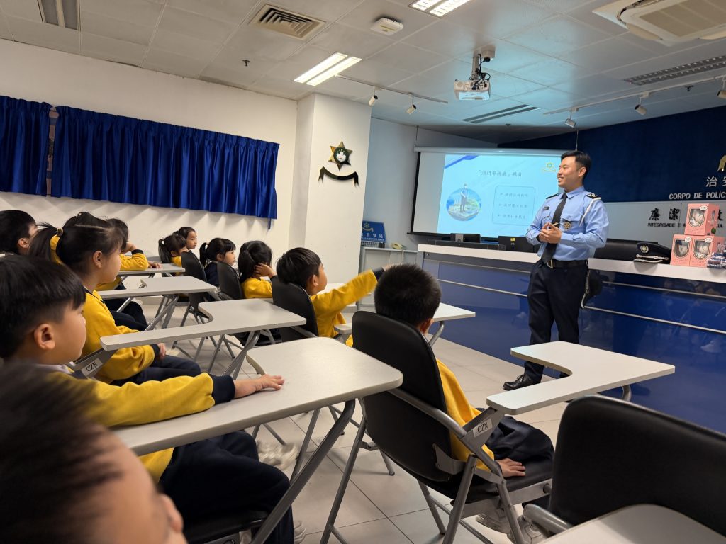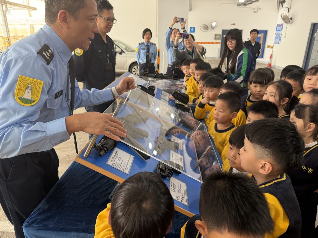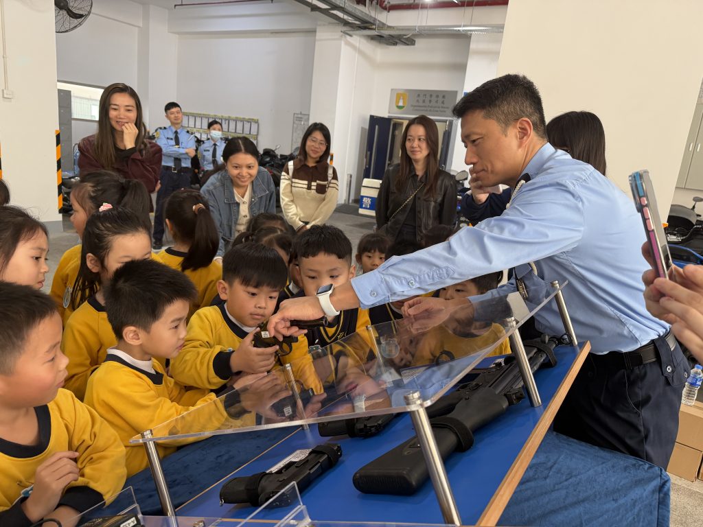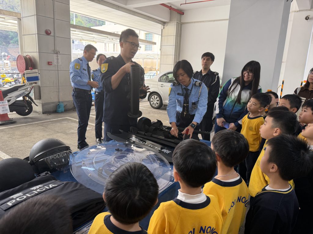 在警察局內,警員耐心地向小朋友介紹治安警察的日常工作與各分區警務職能,並在問答互動中分享警務知識。小朋友有機會近距離認識警棍、對講機及防彈衣等專業裝備,更親身穿戴體驗,感受警員的英勇。在警車與電單車前,小朋友換上小警服,威風凜凜地坐上警務玩具車合影,架勢十足!