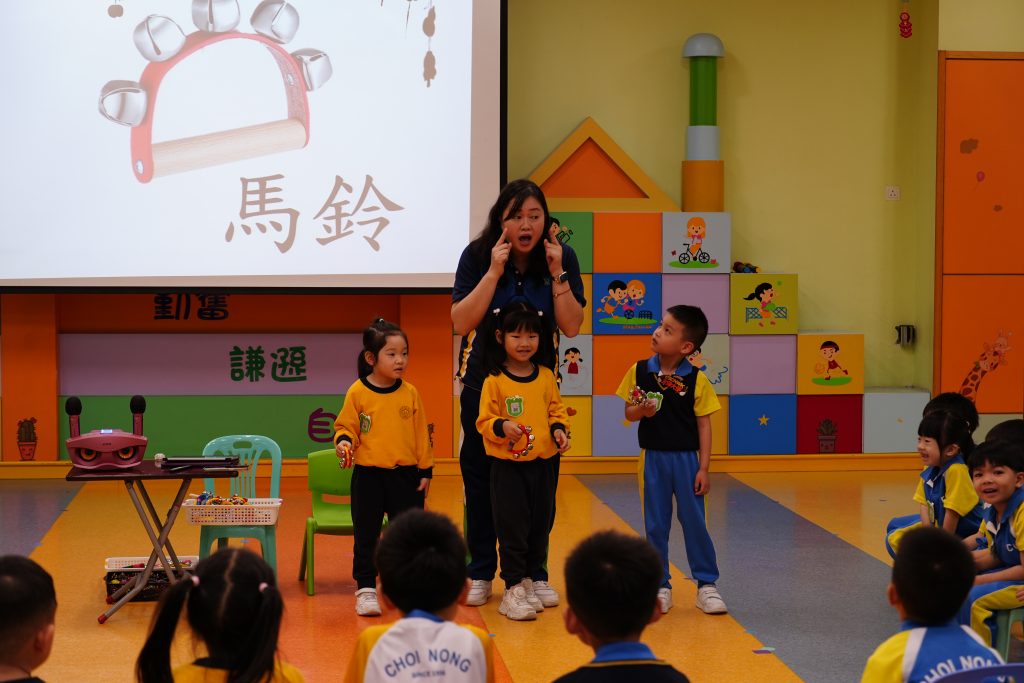 老師以「大戰病菌兵團」為情境,將衛生常識融入節拍遊戲,並介紹了新樂器「馬鈴」,孩子們好奇地聆聽不同音色。