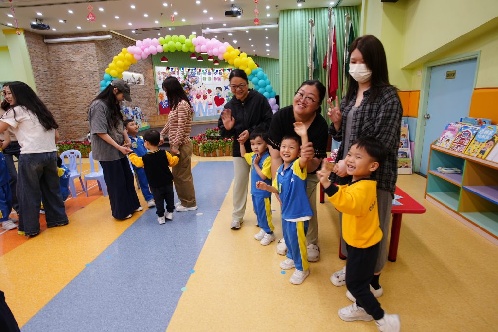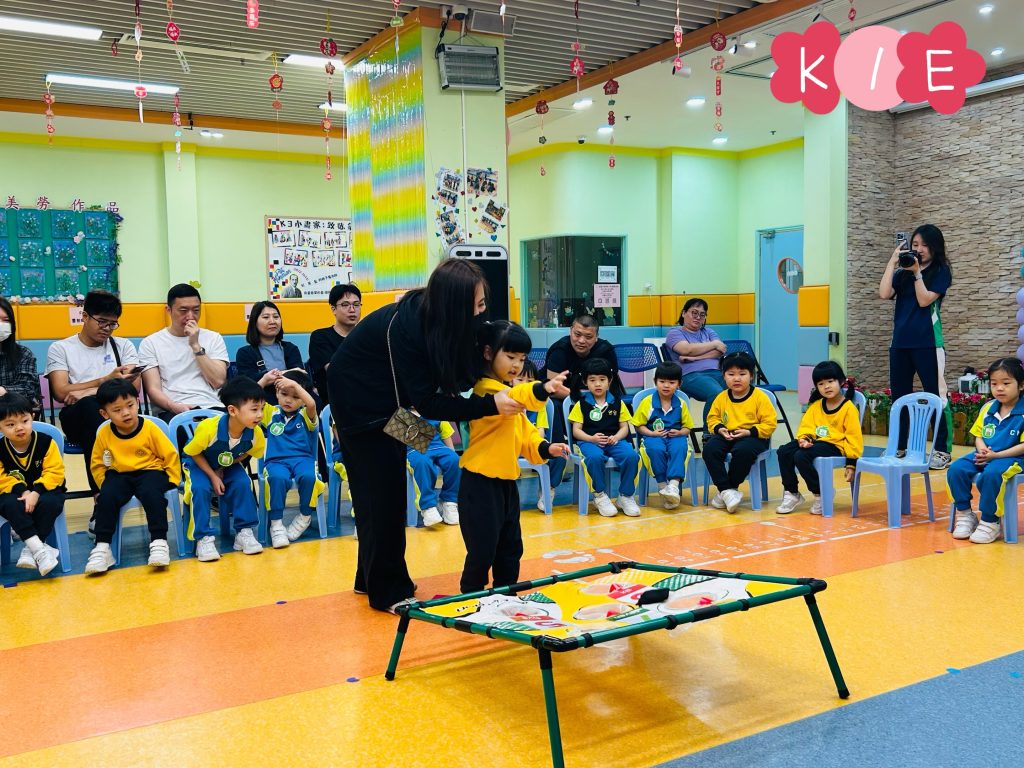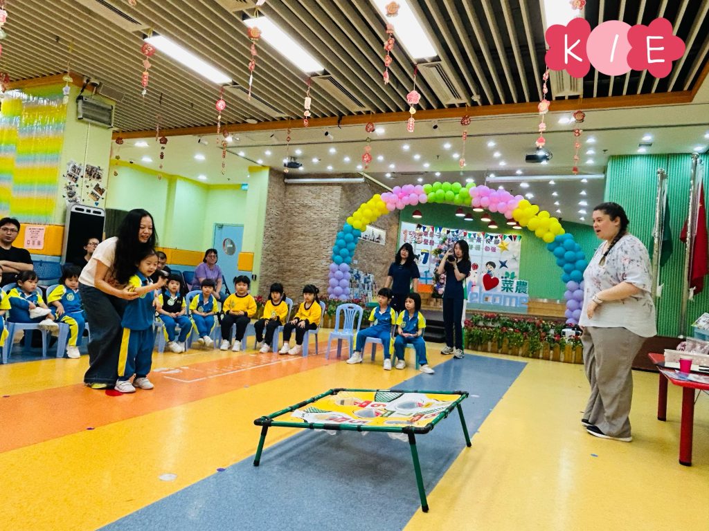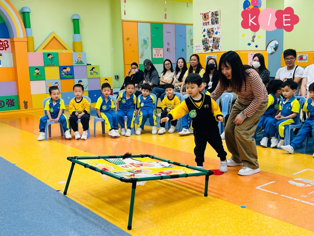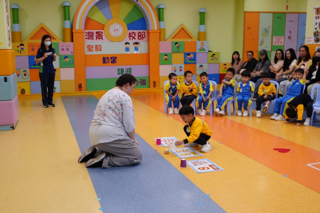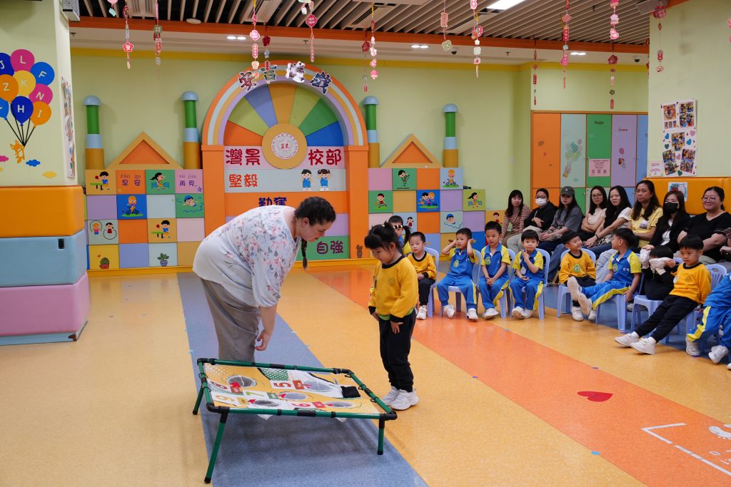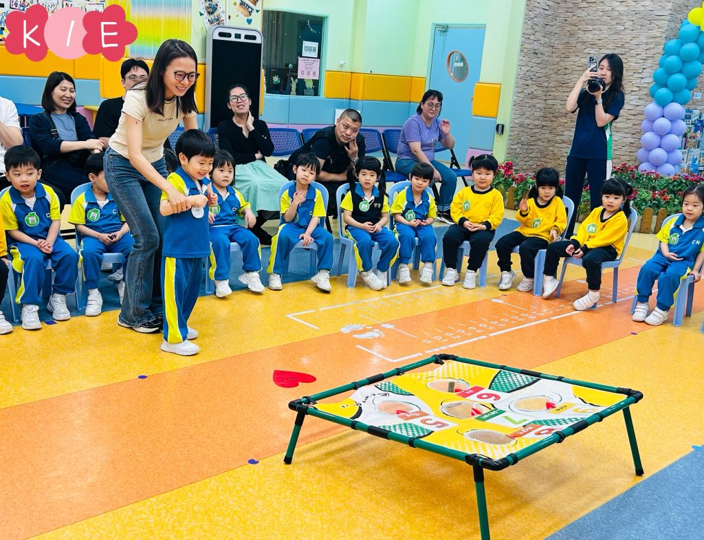 隨後進行的親子互動環節更將課堂氣氛推向高潮。在「聆聽數字扔豆袋」遊戲中,家長與小朋友同心協力,聽著Miss Angelique唸出的數字,將豆袋準確扔到對應的位置上。接着的「糖黐豆」遊戲,大家圍成一圈,根據指令迅速組隊,歡笑聲此起彼伏。