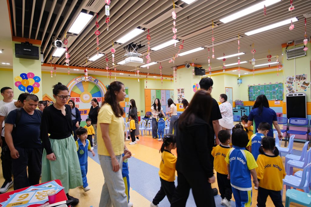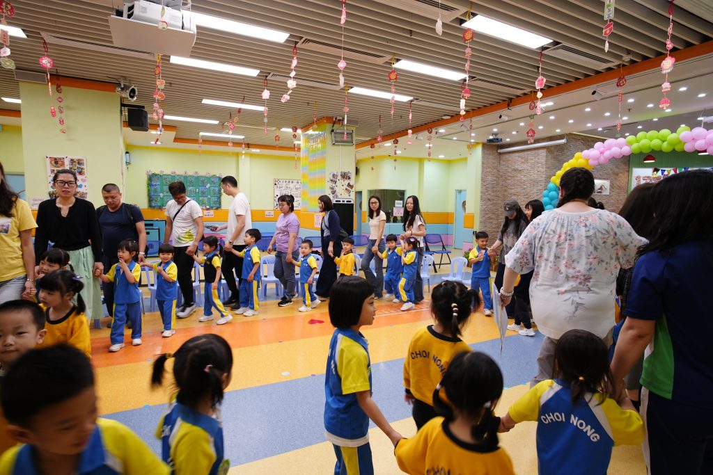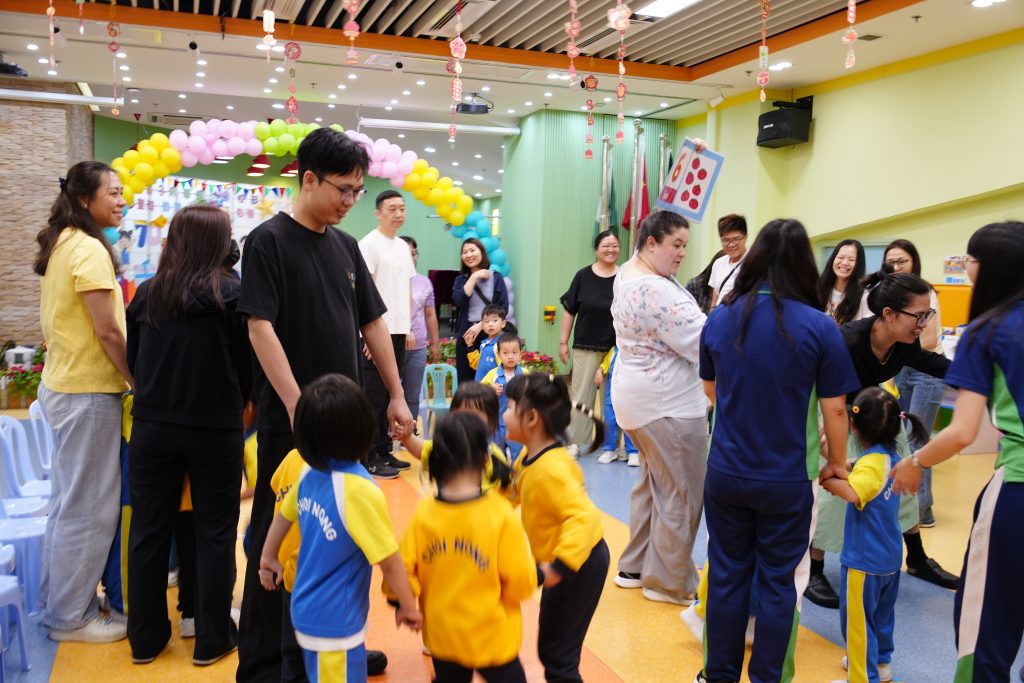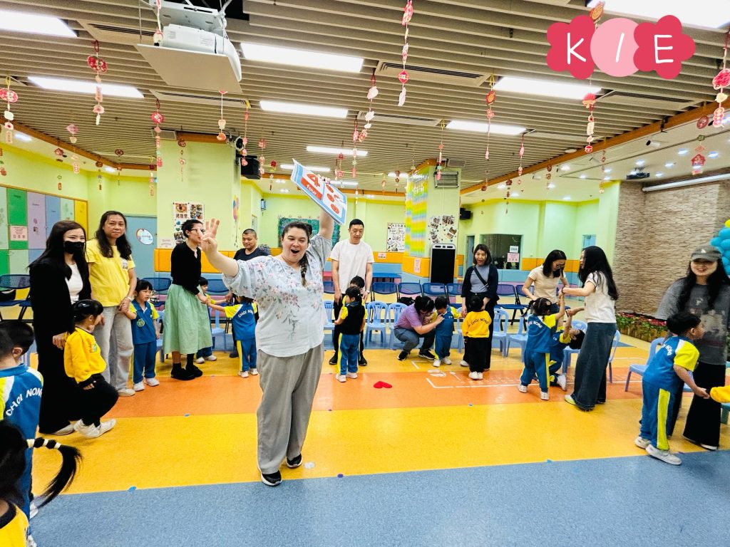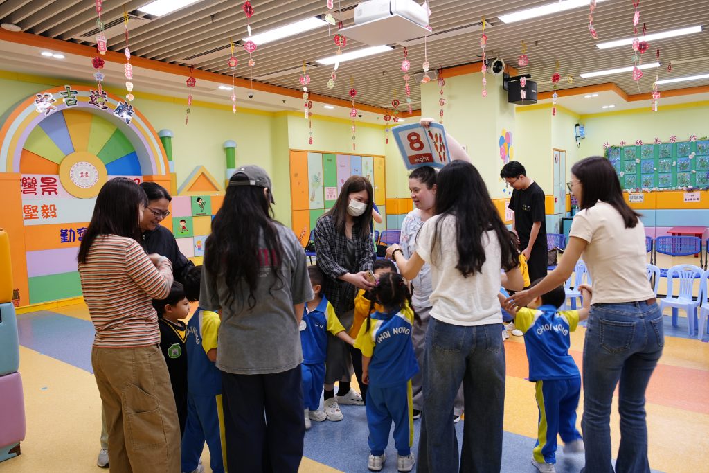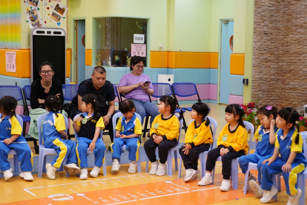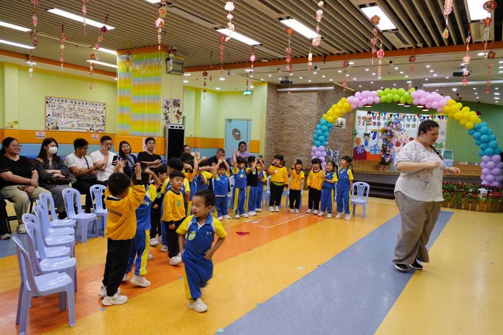 隨後進行的親子互動環節更將課堂氣氛推向高潮。在「聆聽數字扔豆袋」遊戲中,家長與小朋友同心協力,聽著Miss Angelique唸出的數字,將豆袋準確扔到對應的位置上。接着的「糖黐豆」遊戲,大家圍成一圈,根據指令迅速組隊,歡笑聲此起彼伏。