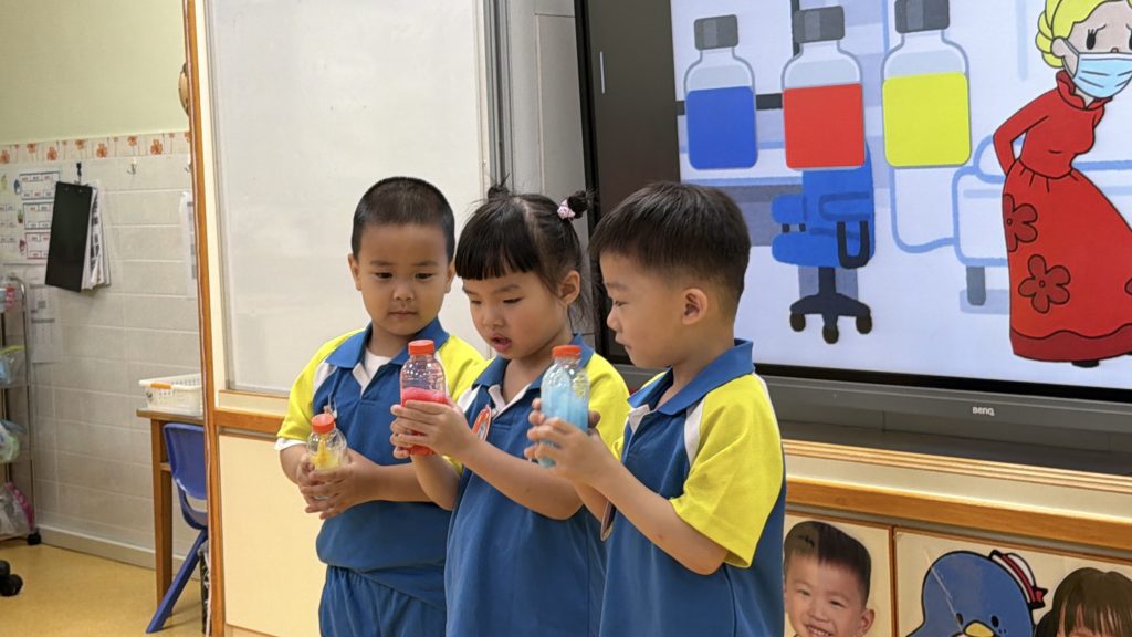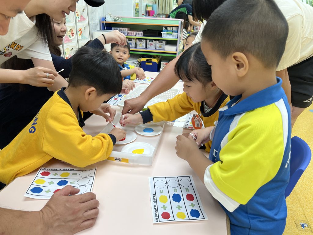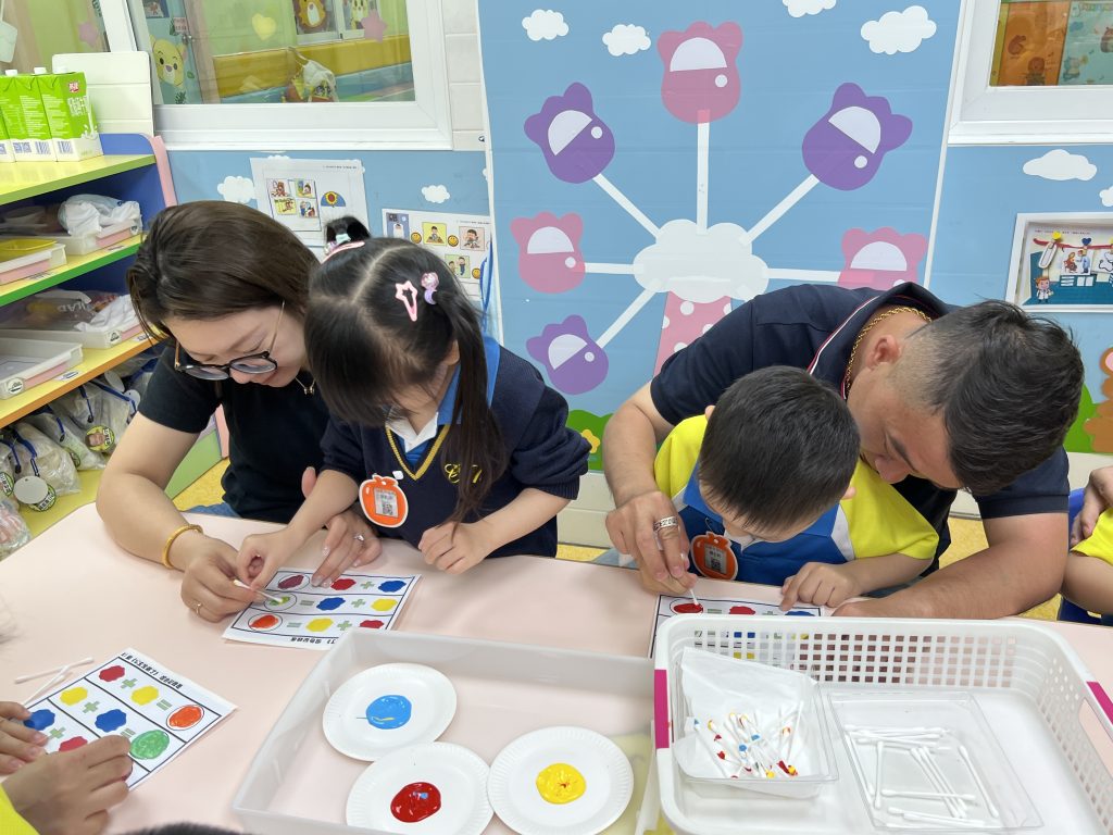 幼稚園(175灣景分校)K1D家長觀課日,家長與子女一同參與顏色混合實驗及區角活動。在特別的親子互動環節中,家長與孩子共同探索顏色混合的奧妙。老師準備了紅、黃、藍三原色顏料,鼓勵親子輪流將兩種顏色混合。家長握著孩子的小手,一起觀察「紅色+黃色=橙色」、「藍色+紅色=紫色」等變化,場面溫馨。