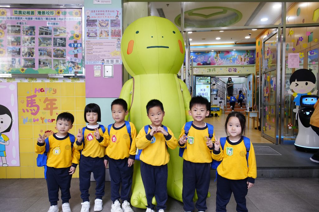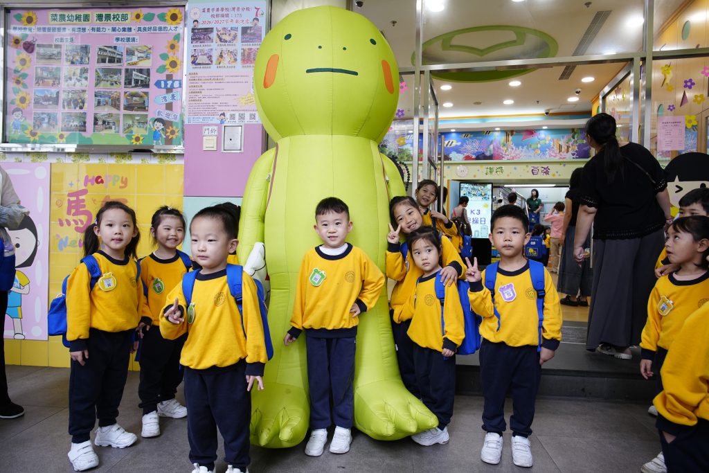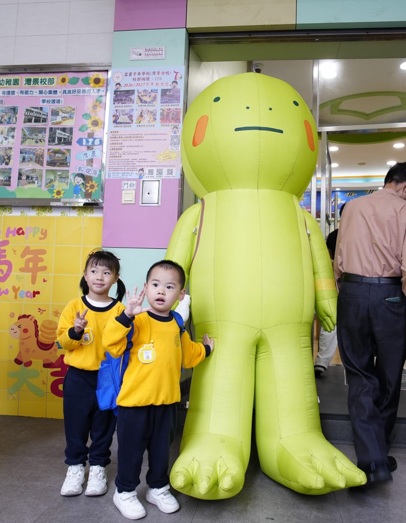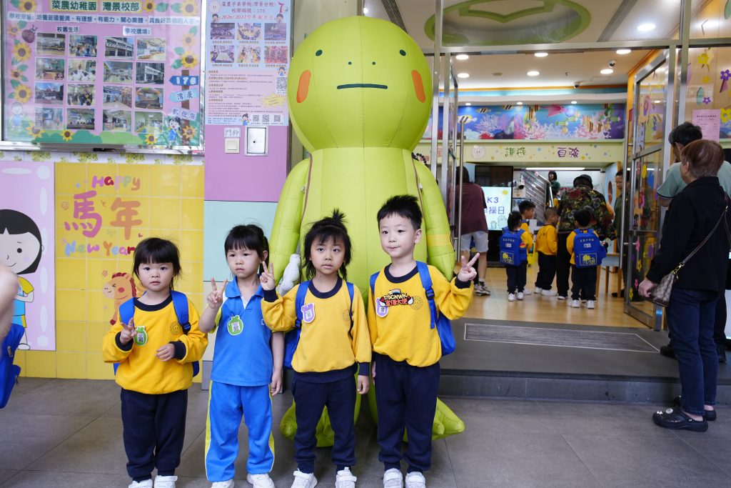 可愛的何小涌一亮相,小朋友及家長們便興奮不已,紛紛上前近距離互動、開心打卡合影,校園裡充滿歡聲笑語。何小涌由菜農校友岑健恒創作,以活潑正向的形象傳遞積極價值觀與校園精神。